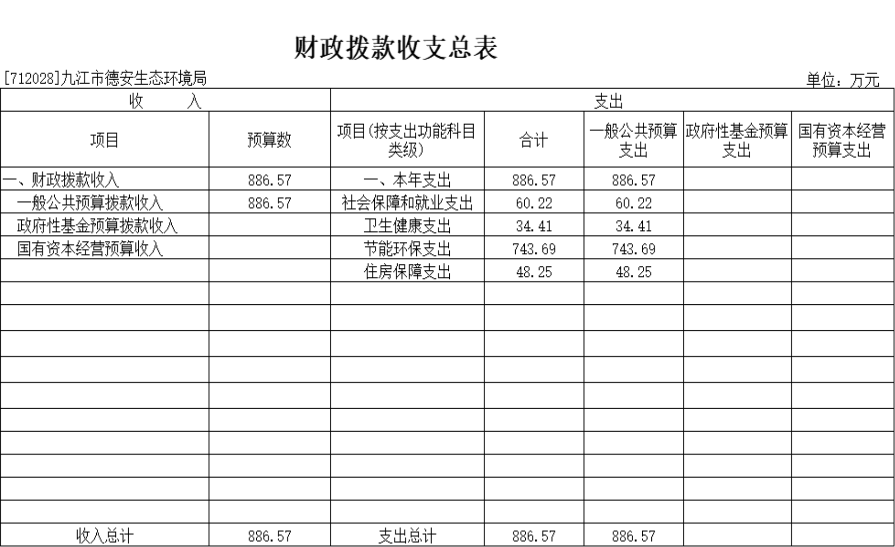 2025年九江市德安生态环境局财政拨款支出预算总额886.57万元,较上年预算安排减少69.13万元;