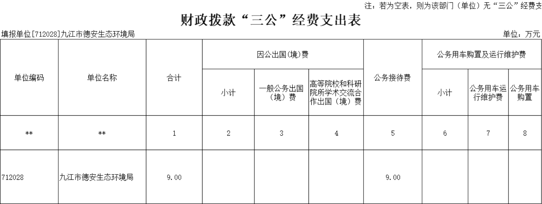 2025年九江市德安生态环境局"三公"经费财政拨款安排9万元,其中: