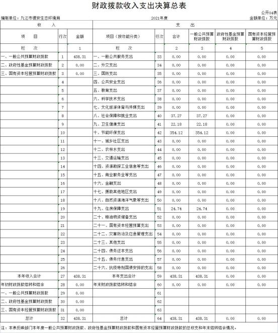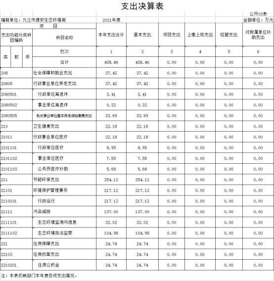 本单位 2021 年度支出总计 438.46 万元,其中本年支出合 计 438.46 万元,较 2020 年减少 652.33 万元,下降 59.8%,主 要原因是:无工程项目款支出,年末结转和结余 0 万元,较 2020 年减少 872.3 万元,下降 100%,主要原因是:2021 年无项目工程款支出。