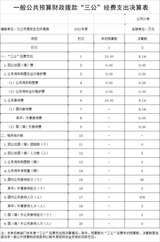 本单位 2021 年度一般公共预算财政拨款“三公 ”经费支出 年初预算数为 10 万元,决算数为 8.14 万元,完成预算的 81.4%,决算数较 2020 年增加 7.78 万元,增长 2161.11%,其中: