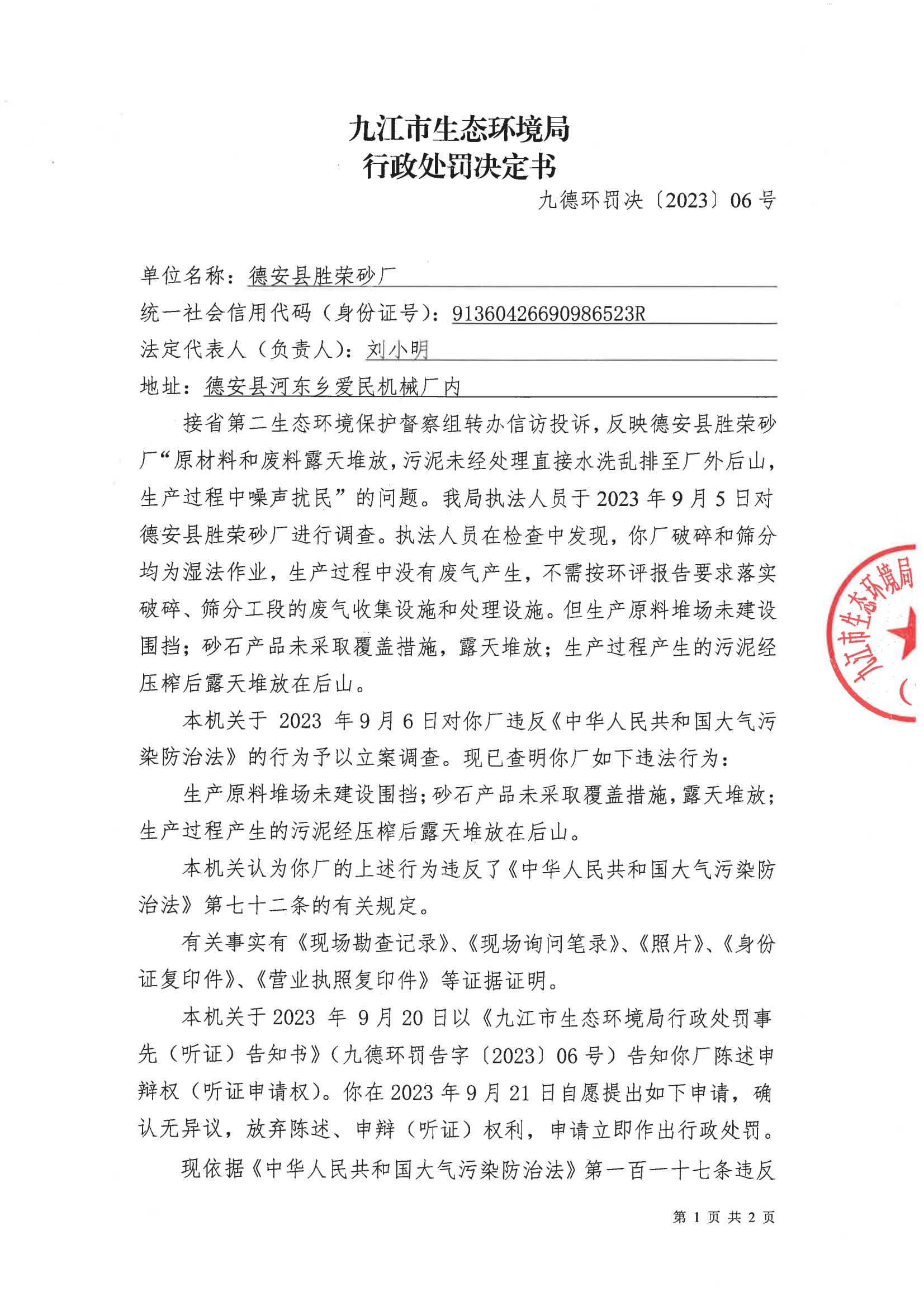 关于德安县胜荣砂厂的行政处罚决定书