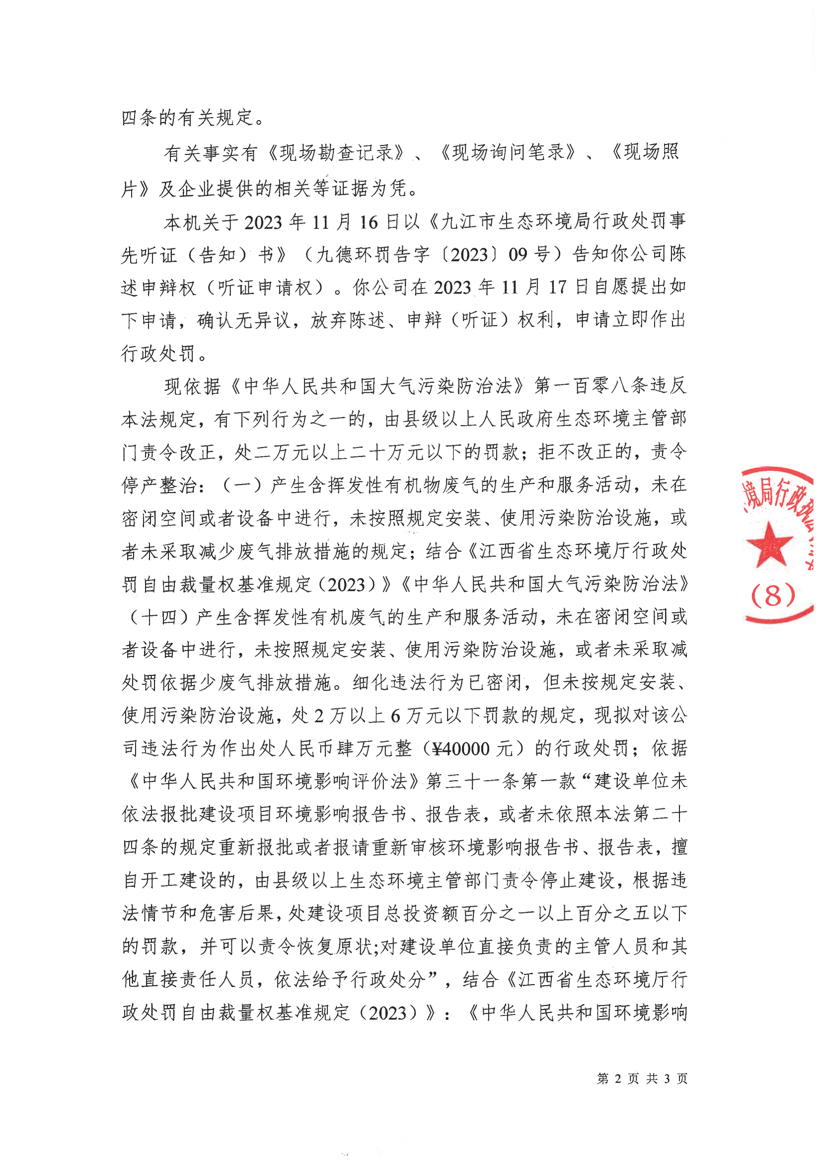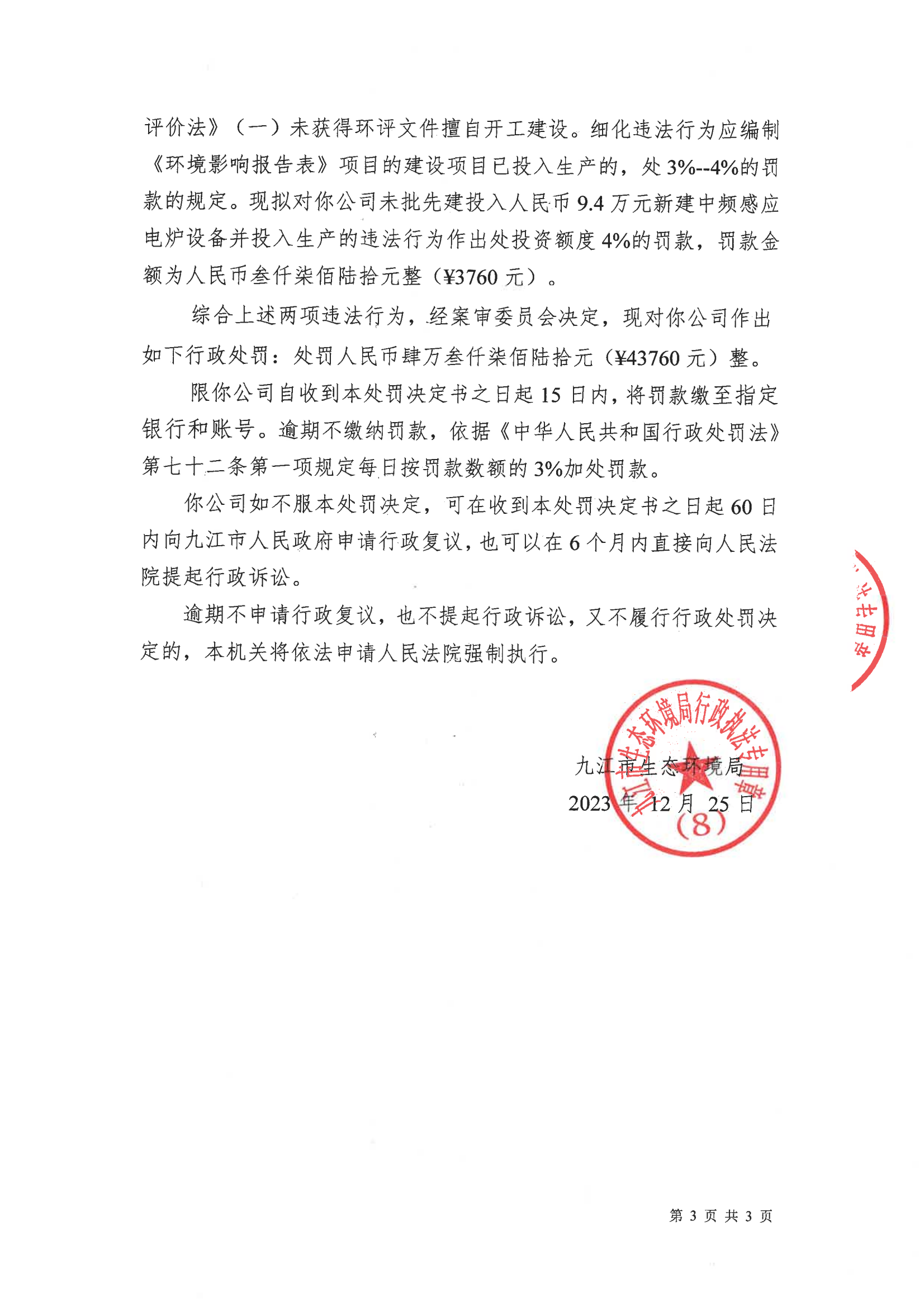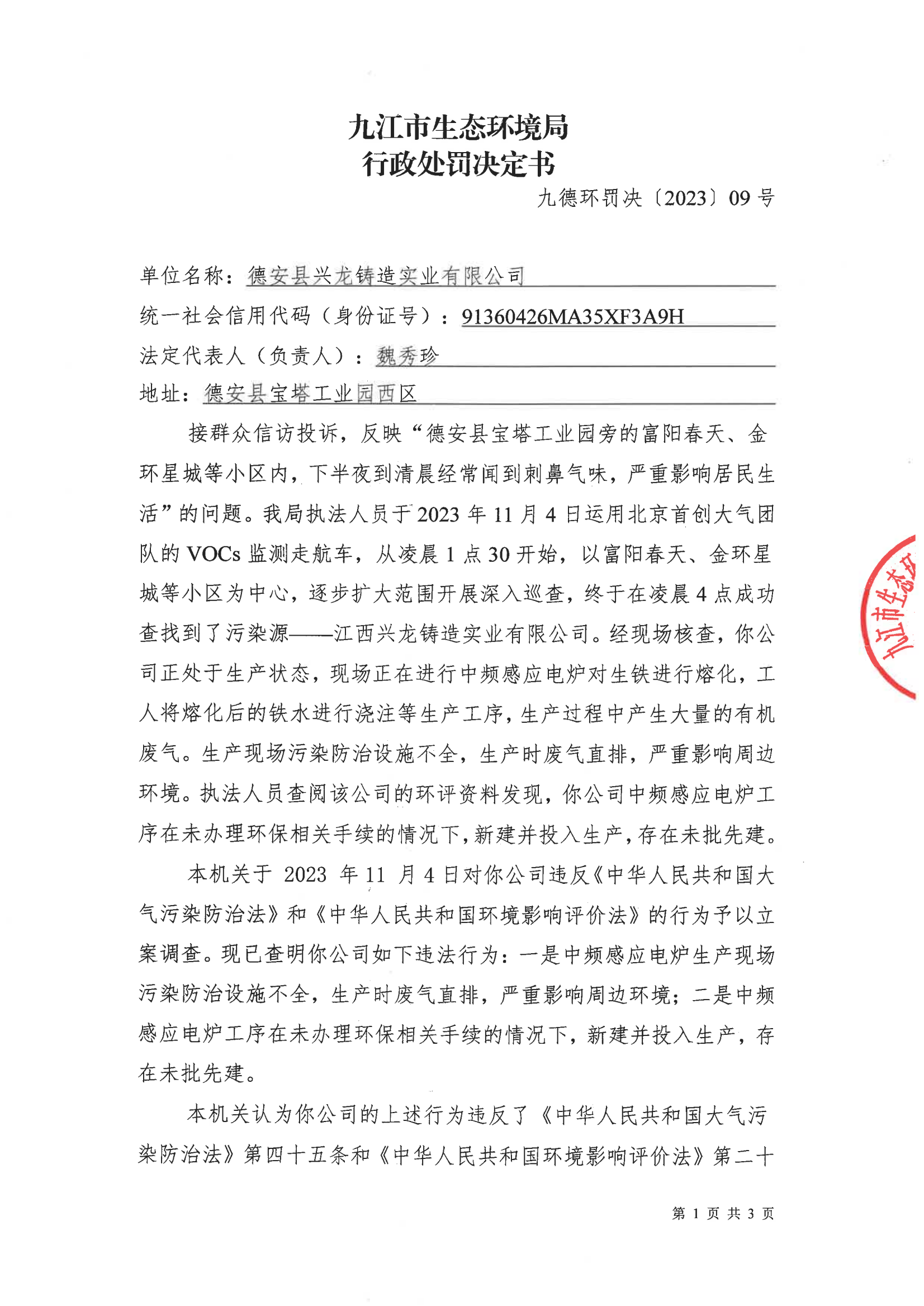 关于德安县兴龙铸造实业有限公司的行政处罚决定书