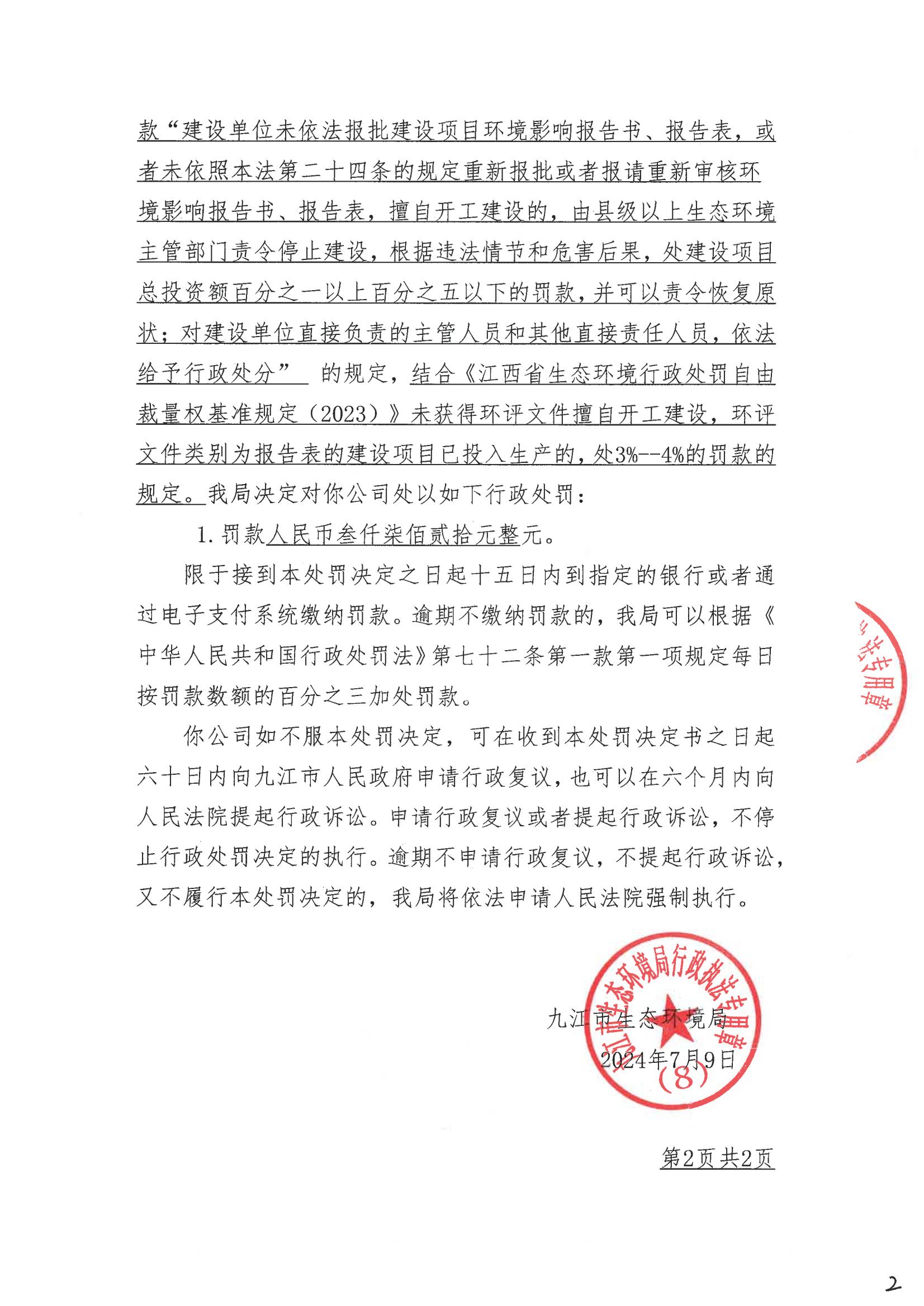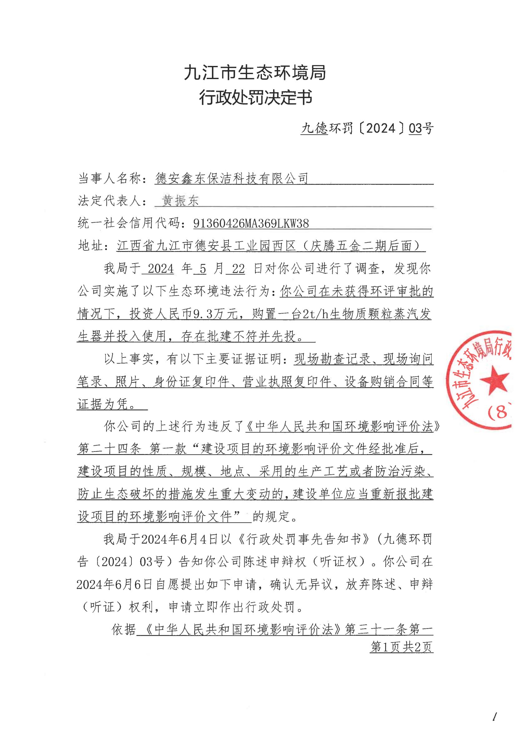 关于德安鑫东保洁科技有限公司的行政处罚决定书