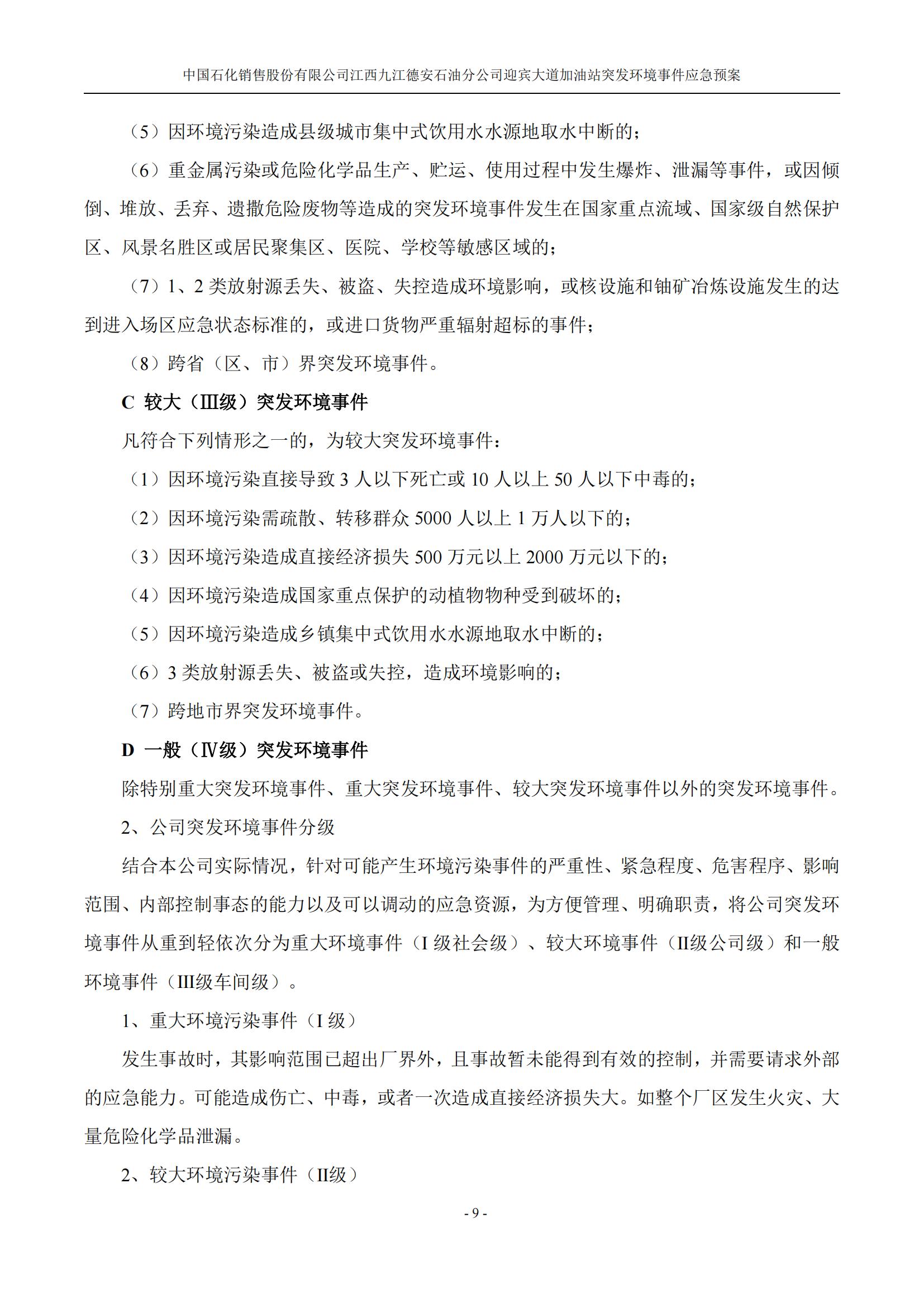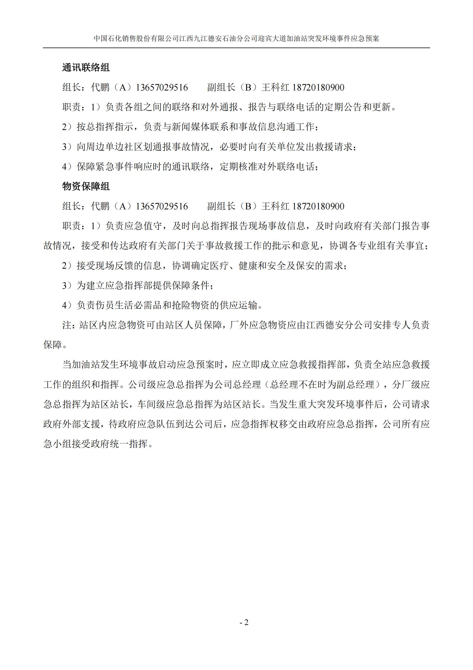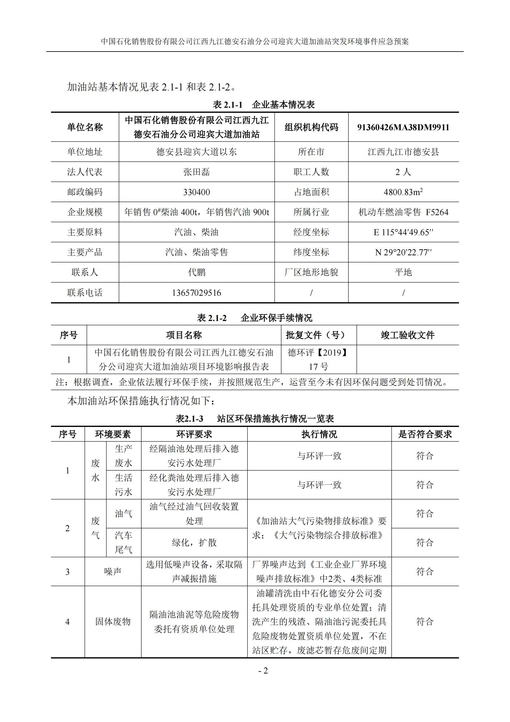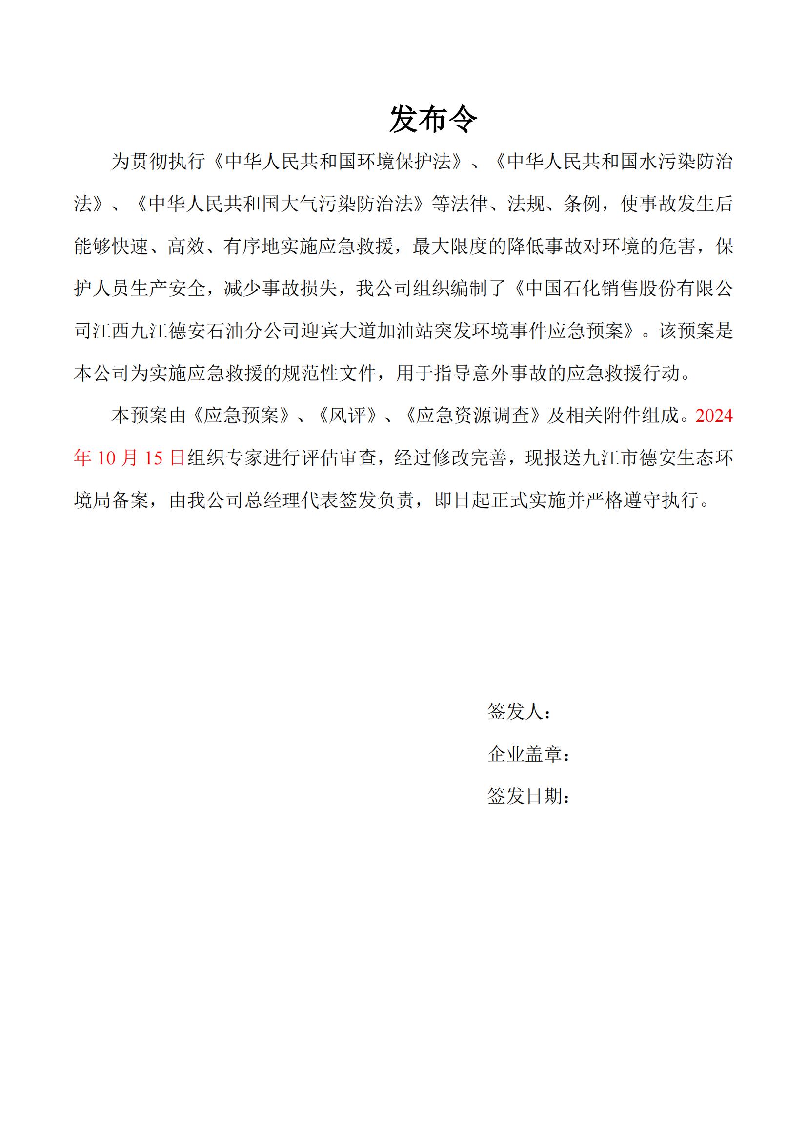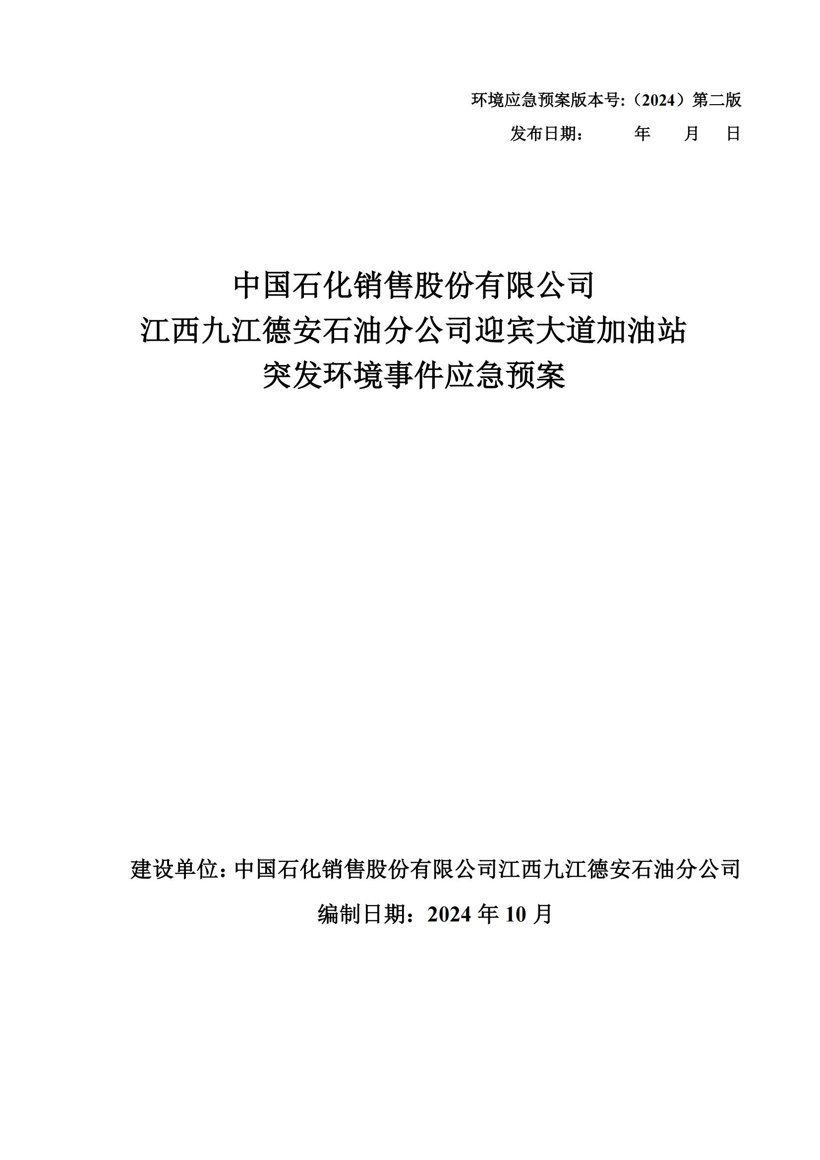 中国石化销售股份有限公司江西九江德安石油分公司迎宾大道加油站突发环境事件应急预案