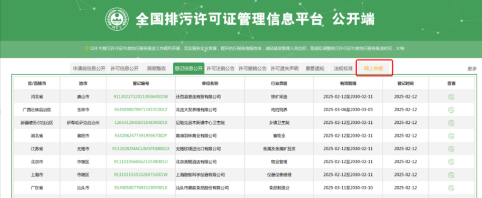 根据全国排污许可证管理信息平台数据,德安县593家排污单位排污登记表有效期于2025年6月底届满,德安县814家排污单位排污登记表有效期于2025年12月底届满,请排污登记管理单位自行查看排污登记有效期,并及时进行排污登记延续或注销。《排污许可管理条例》第四十三条规定:需要填报排污登记表的企业事业单位和其他生产经营者,未依照本条例规定填报排污信息的,由生态环境主管部门责令改正,可以处5万元以下的罚款。排污登记自首次登记有效期为5年,若在有效期届满后继续生产运营的,排污登记单位应在排污登记有效期届满前20日内进行延续登记。(1)浏览器搜索“全国排污许可证管理信息平台公开端(网址:http://permit.mee.gov.cn)”,点击“网上申报”;    (2)输入账号密码登录,进入平台业务办理界面;若忘记账号密码,可通过点击登录页面下方“忘记用户名了?”“忘记密码了?”,输入注册使用的手机号找回;如需要变更绑定手机号或忘记所绑定的手机号,请联系九江市德安生态环境局(0792-4666671)找回或者修改手机号。(4)进入登记页面,点击“登记延续”进行登记,延续时核对登记信息并更新,填报完成后提交,生成登记回执,将登记表和登记回执下载打印,排污单位留存即可。已到期的企业点击“排污登记”进行重新登记。排污单位延续排污登记时,应认真核实排污单位名称、注册地址、法定代表人或者实际负责人、联系方式、生产经营场所地址、行业类别、统一社会信用代码或组织机构代码、主要产品及产能等排污单位基本情况,污染物排放去向,执行的污染物排放标准以及采取的污染防治措施等信息记载是否准确,如实填报延续登记内容,涉及产生工业固废和工业噪声的单位还应补充相应模块信息填报。进入延续填报界面,对主要产品信息、原料使用信息、涉VOCs辅料使用信息表、废气排放信息、废水排放信息、工业固体废物排放信息等内容进行完善,同时对“工业噪声”部分进行补充。根据相关通知规定,《国民经济行业分类》(GB/T4754)属于工业行业(行业门类为B、C、D)的,且依据《固定污染源排污许可分类管理名录(2019年版)》属于第3至99类应当纳入排污许可管理的排污单位(含重点管理、简化管理、排污登记),须填报工业噪声相关内容。畜禽养殖、加油站、储油库、码头、环境治理业、环境卫生管理、火葬场、汽修场所、医疗机构等不属于工业行业(行业门类为B、C、D)或者不属于《排污许可名录》第3至99类应当纳入排污许可管理的排污单位(含重点管理、简化管理、排污登记),无须填报工业噪声相关内容。排污登记表有效期内,排污登记信息发生变动的,应当自发生变动之日起20日内进行变更登记。排污单位因关闭等原因不再排污的,应当及时在全国排污许可证管理信息平台注销排污登记表。因生产和排污情况发生变化等原因,依法需要申领排污许可证的,应按规定及时申请取得排污许可证并注销排污登记表。排污单位若关停,不再排放污染物,应及时进行排污登记注销。(4)排污登记不收费!排污登记操作简单,各排污单位可自行从全国排污许可证管理信息平台进行登记,办理事项不收取任何费用。另外,生态环境部门从未委托任何服务机构开展排污登记有偿代办服务,大家谨防上当受骗!