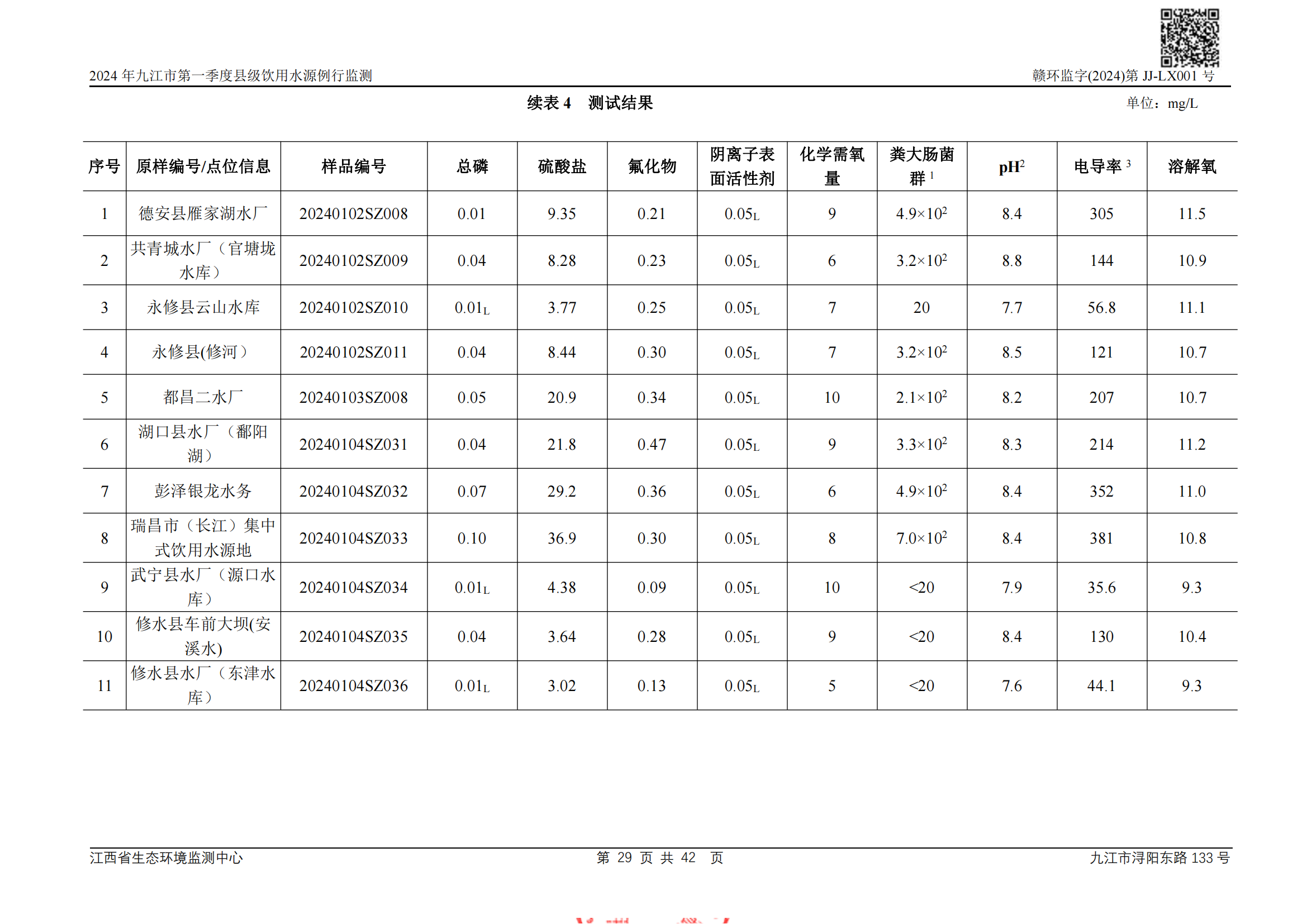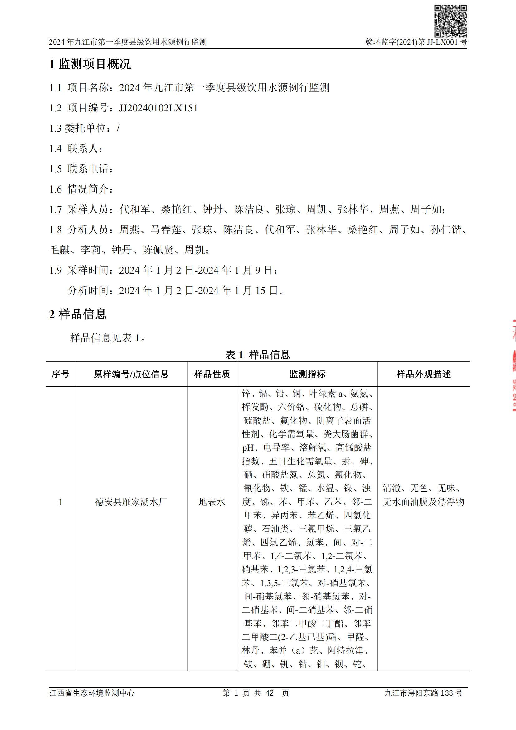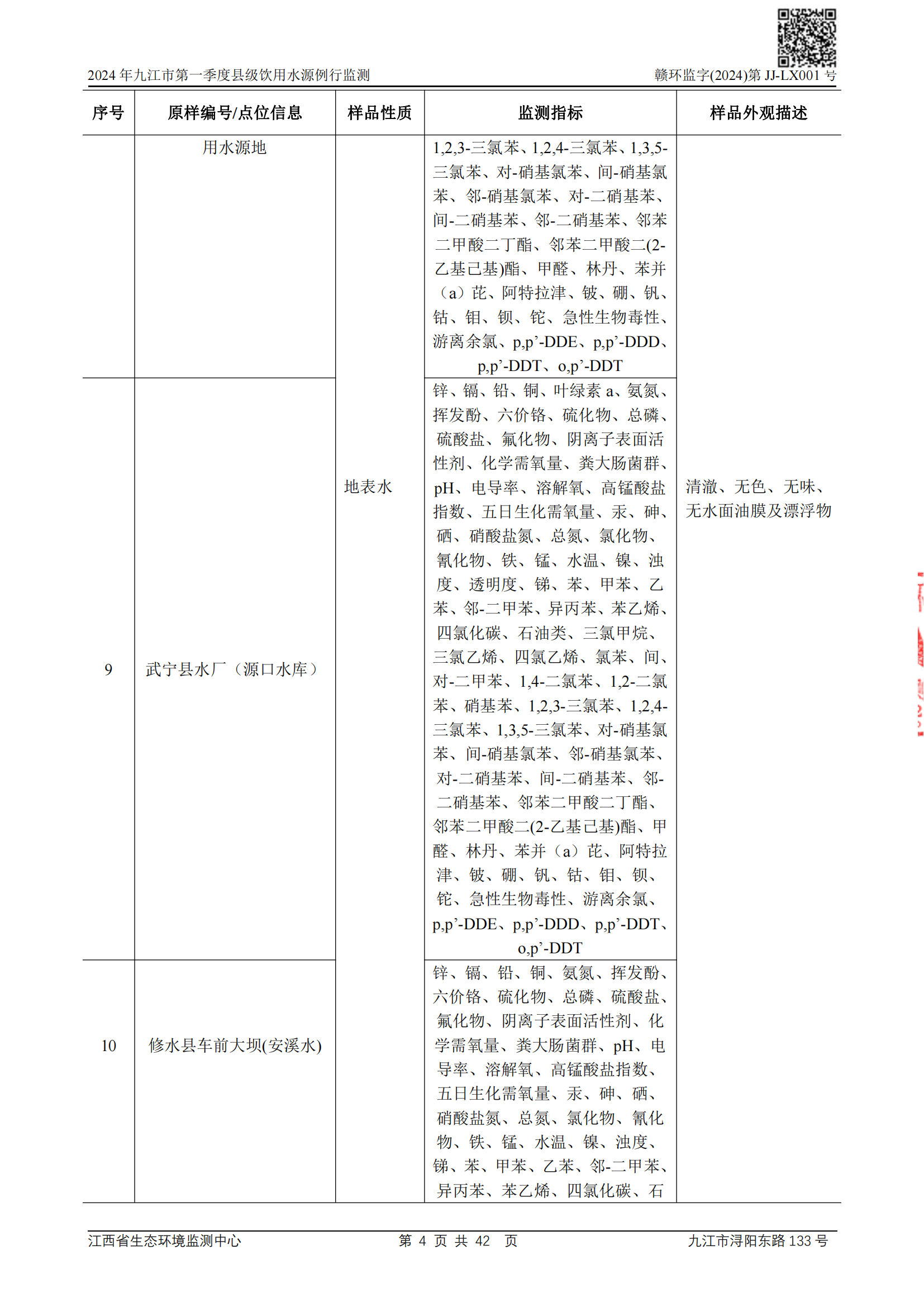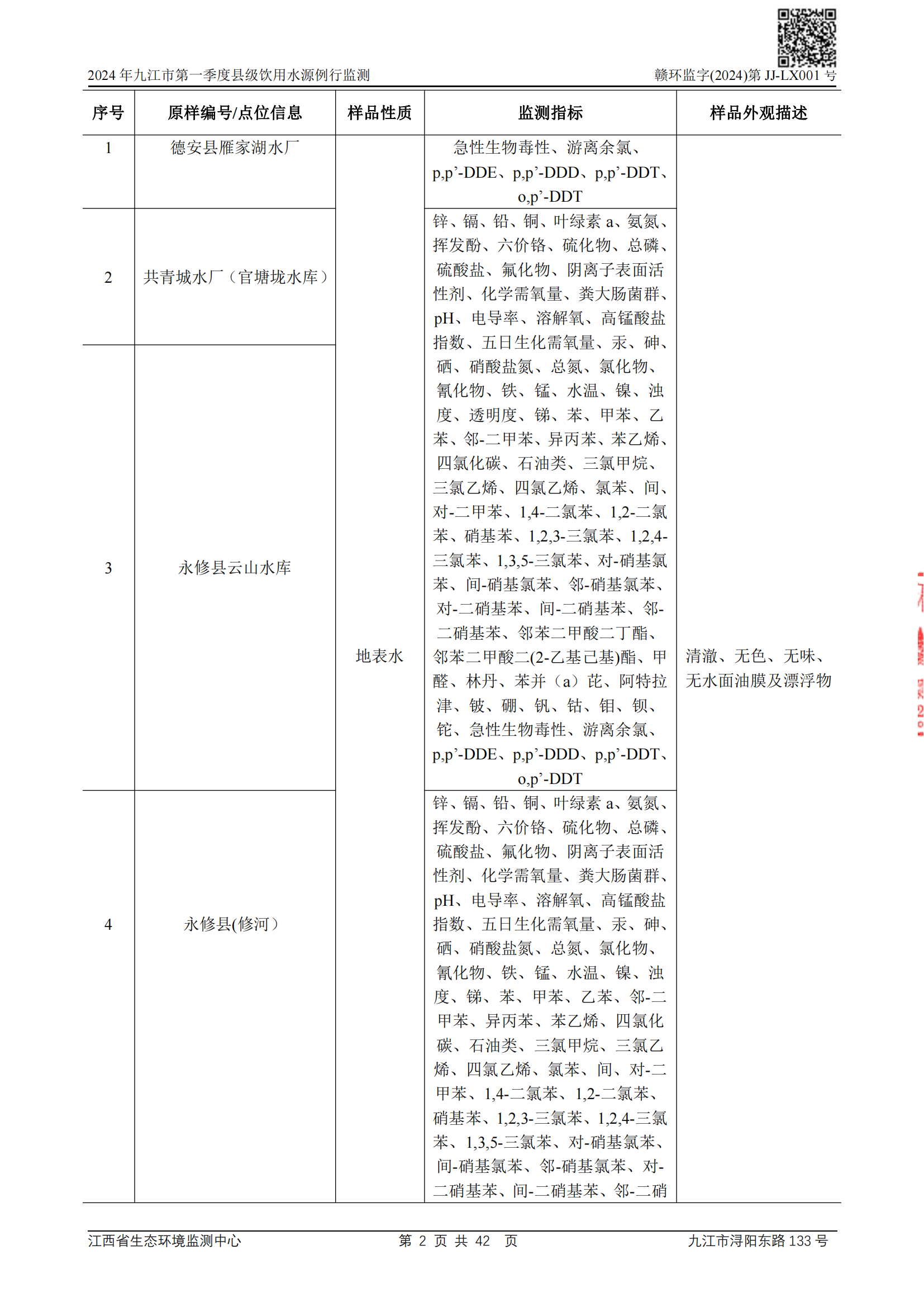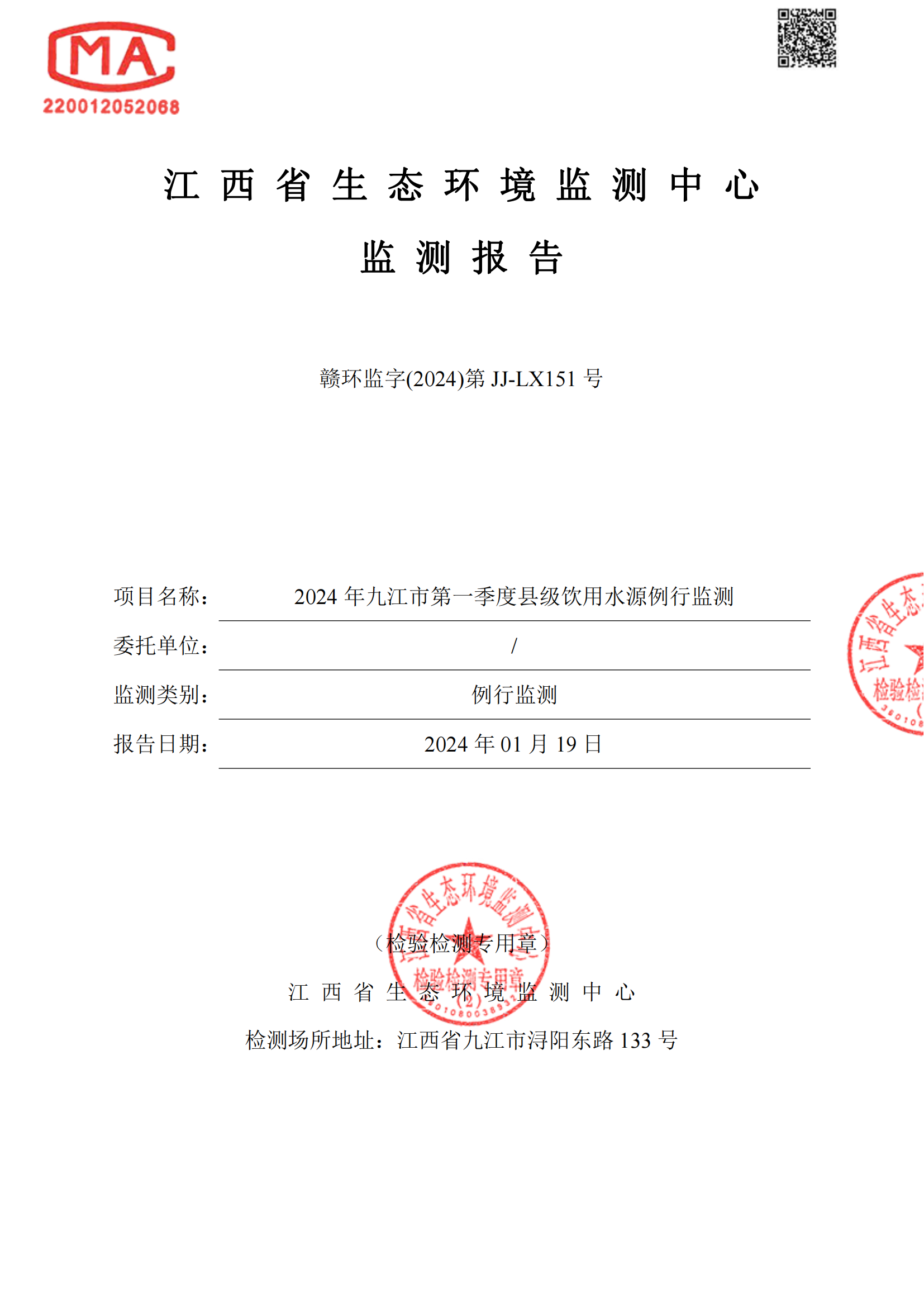 2024年九江市第一季度县级饮用水源例行监测监测报告