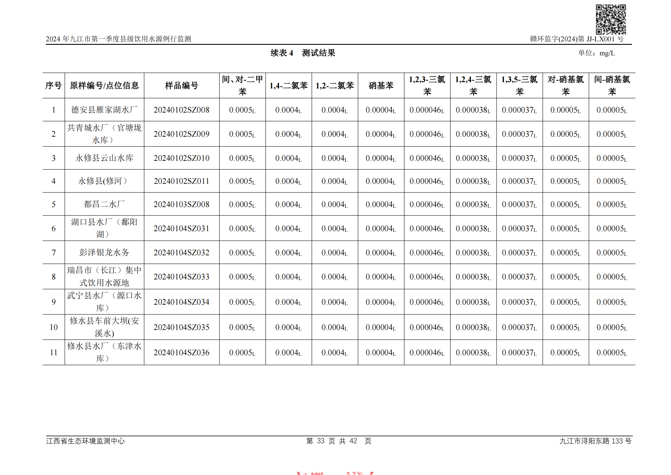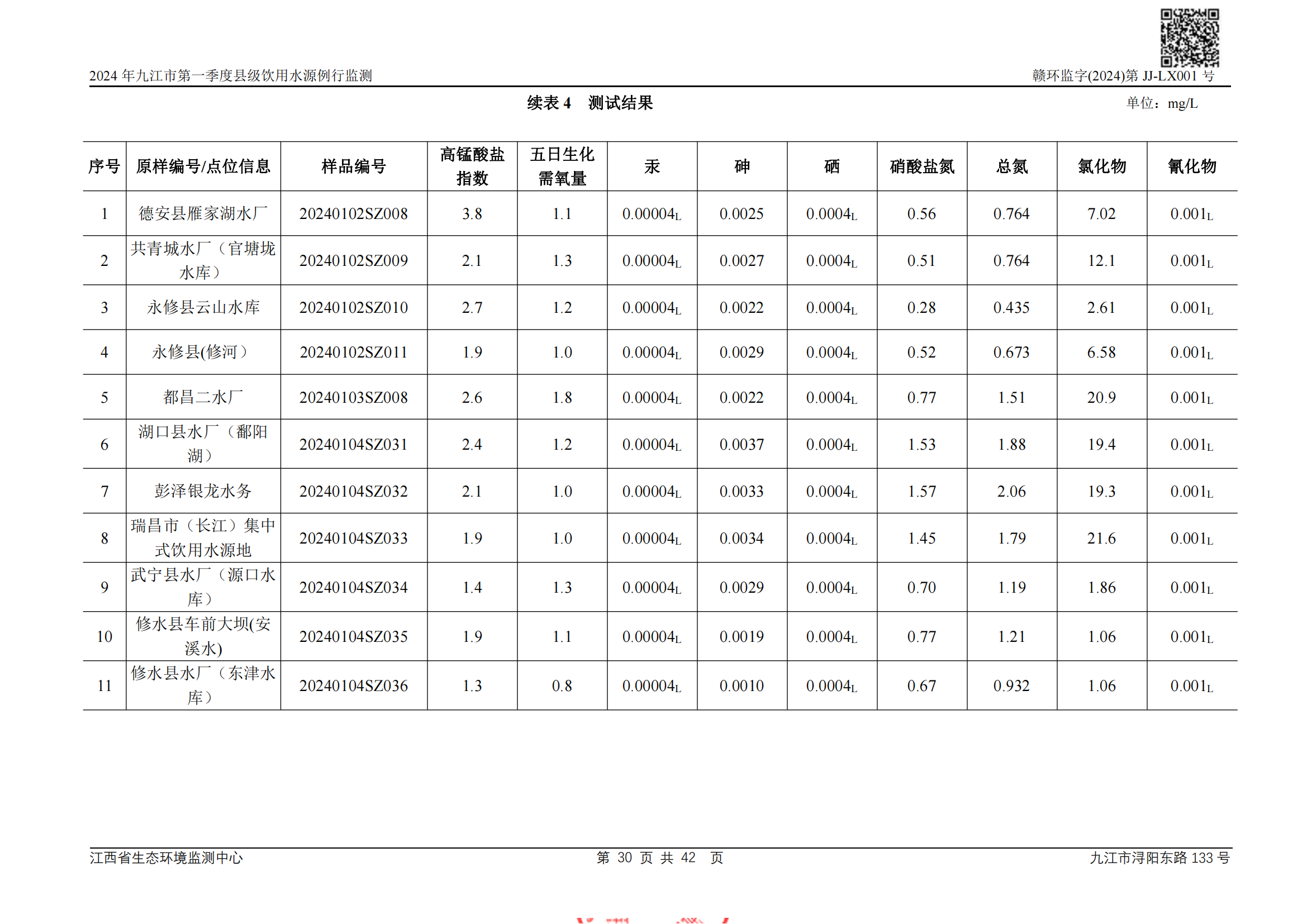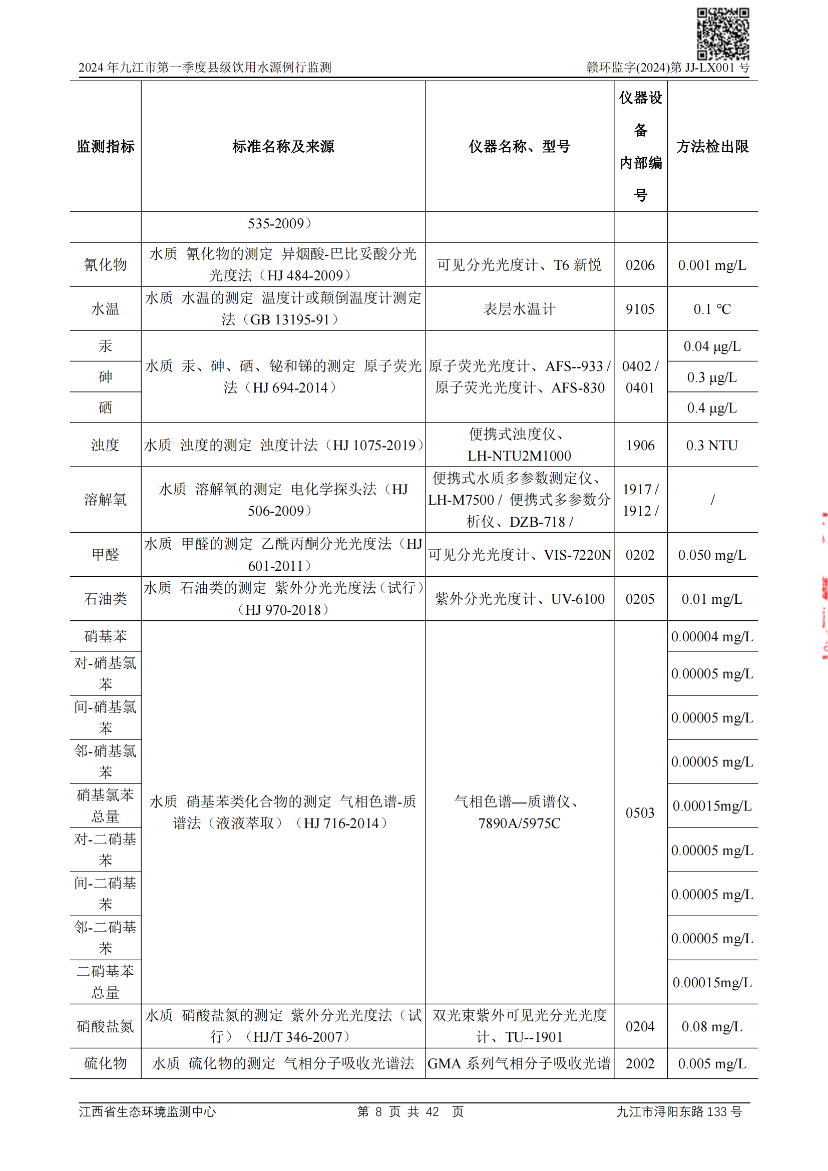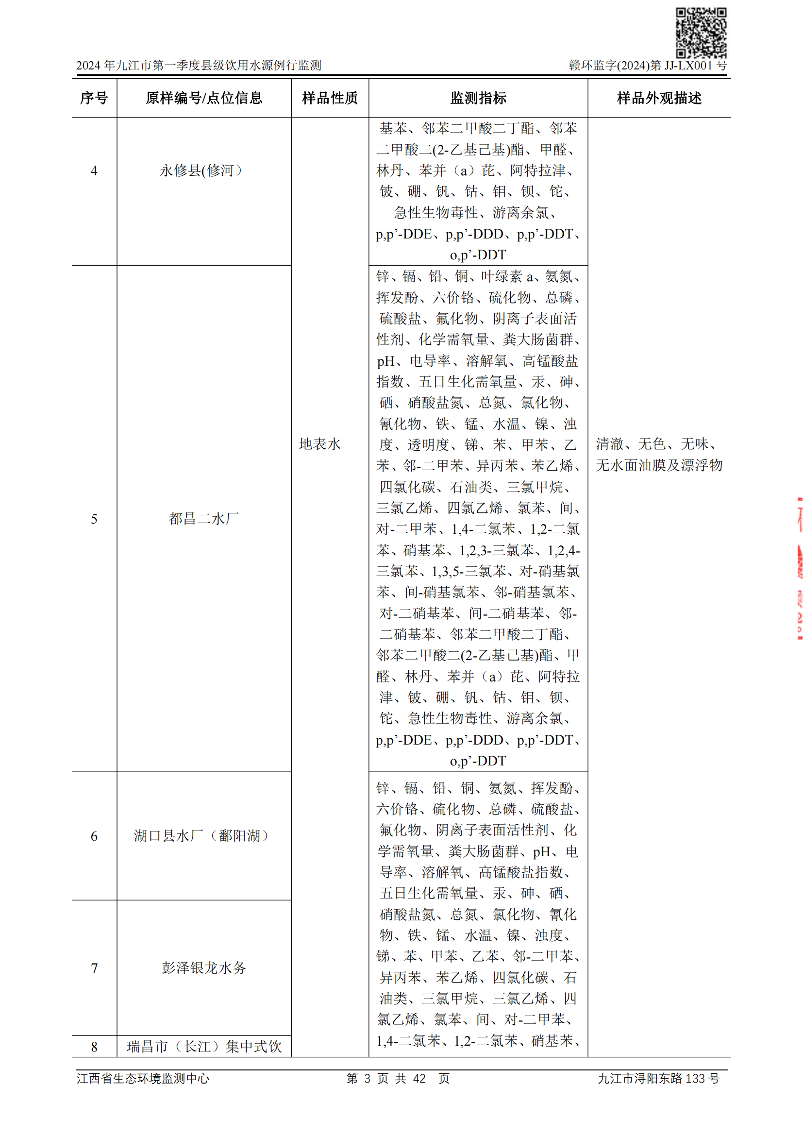 2024年九江市第一季度县级饮用水源例行监测监测报告
