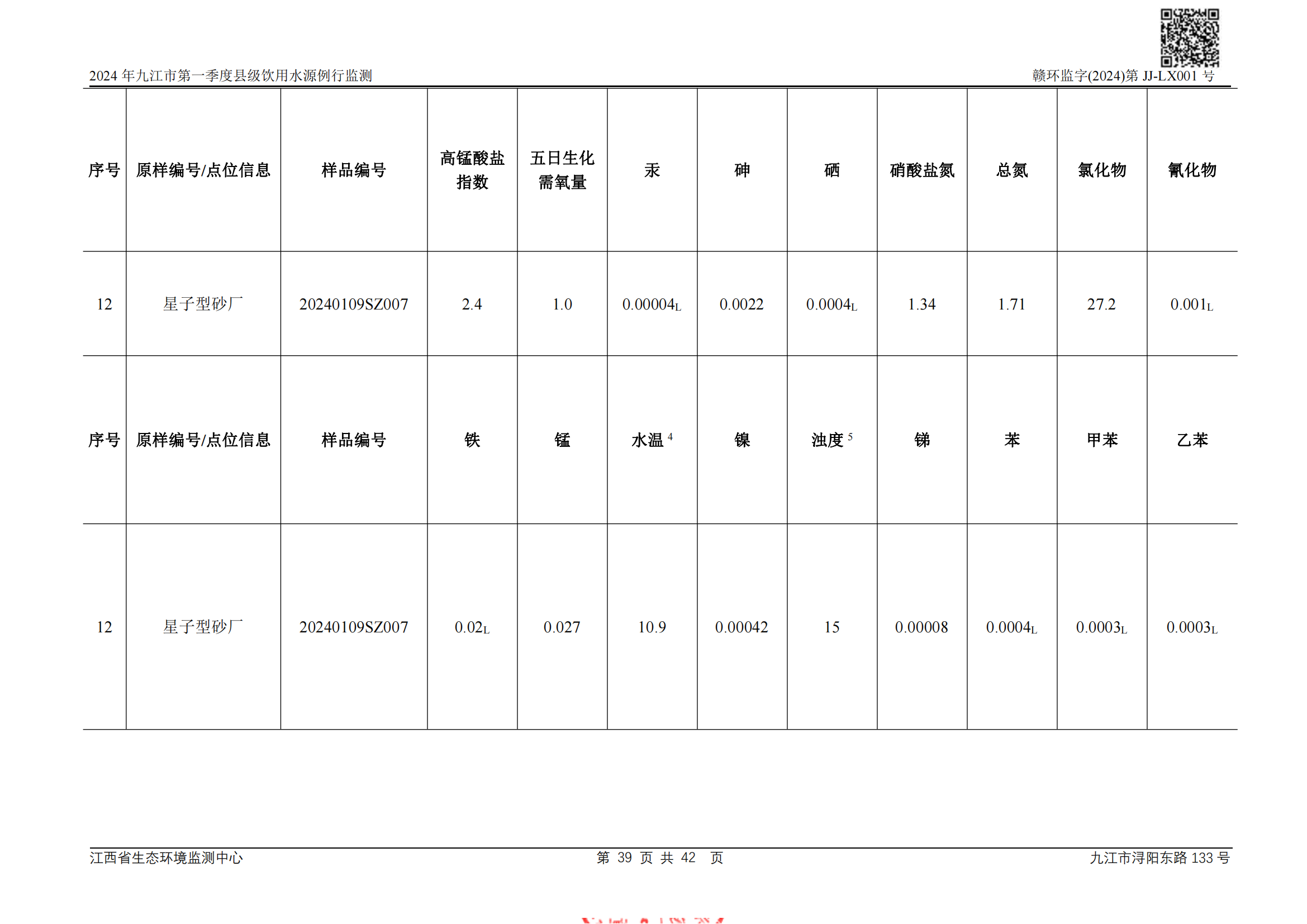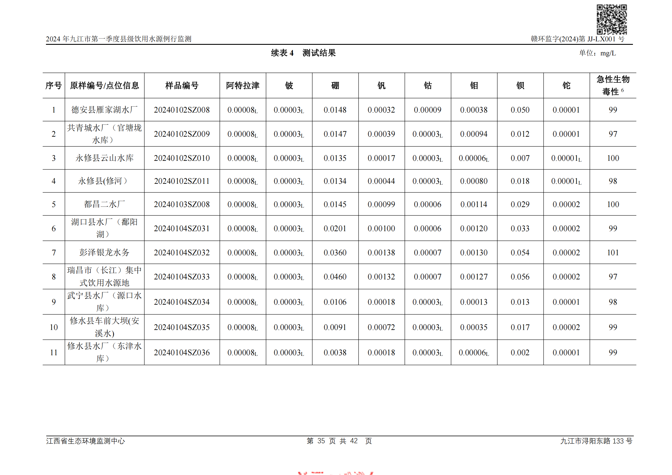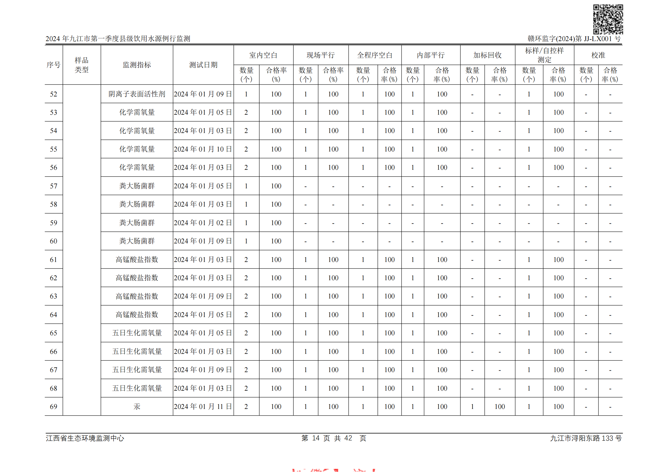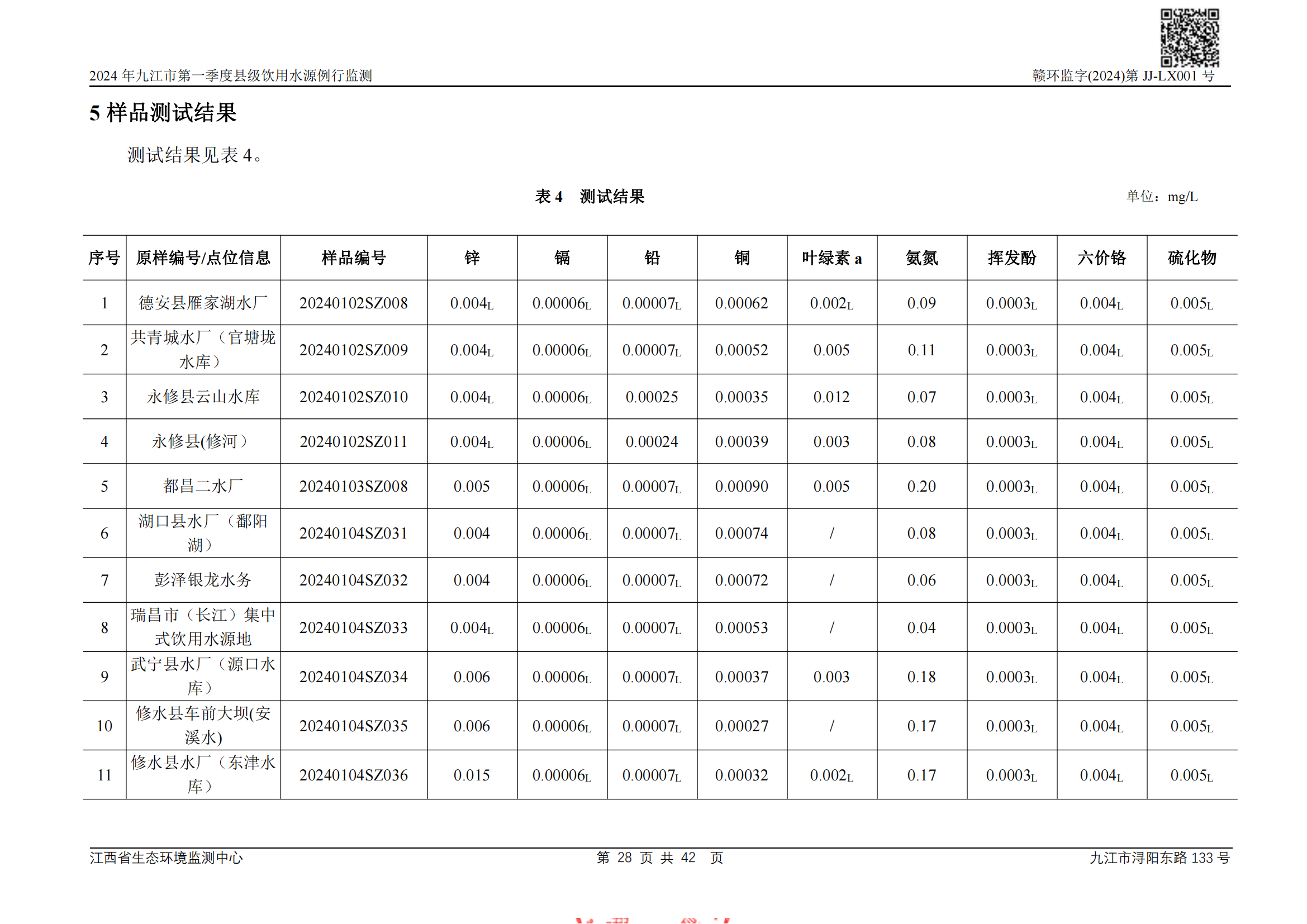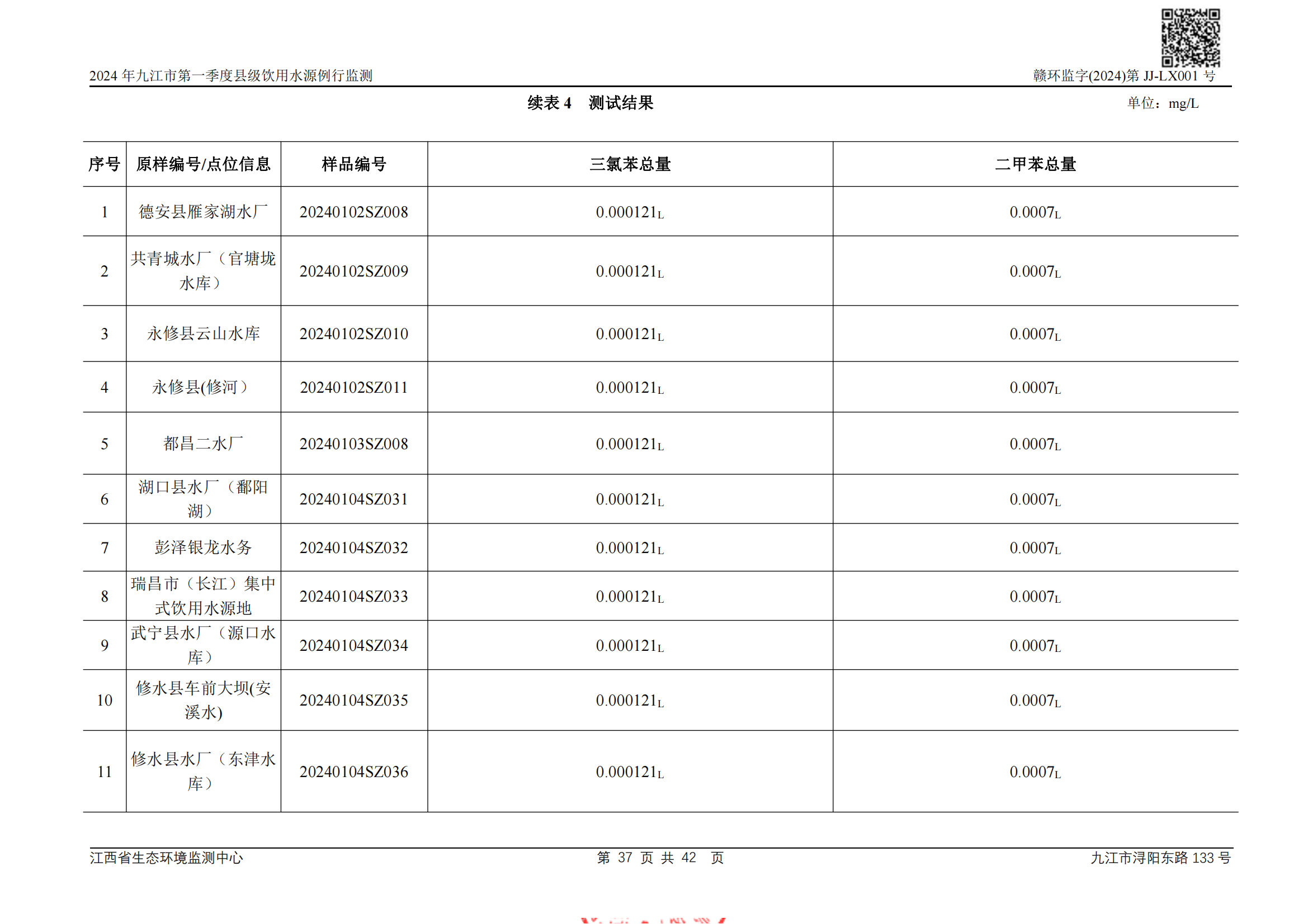 2024年九江市第一季度县级饮用水源例行监测监测报告