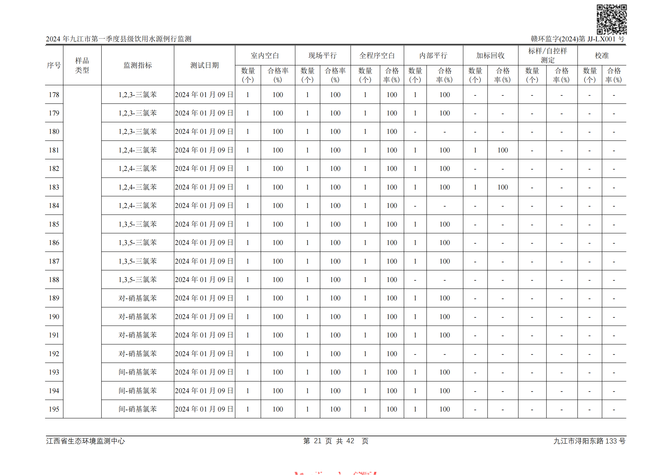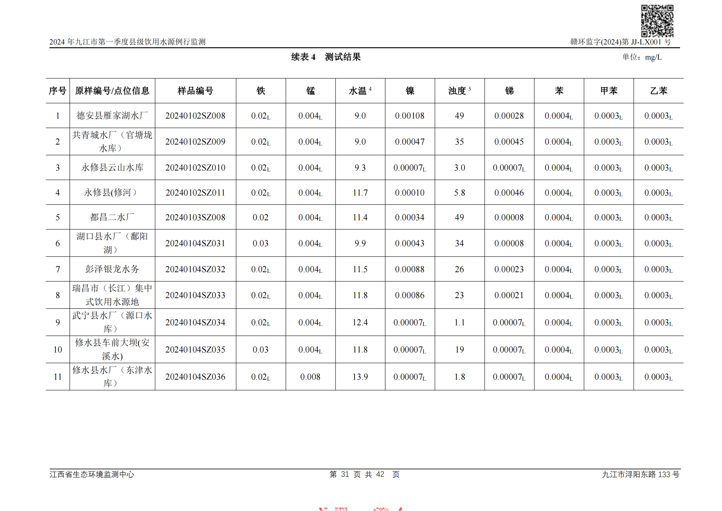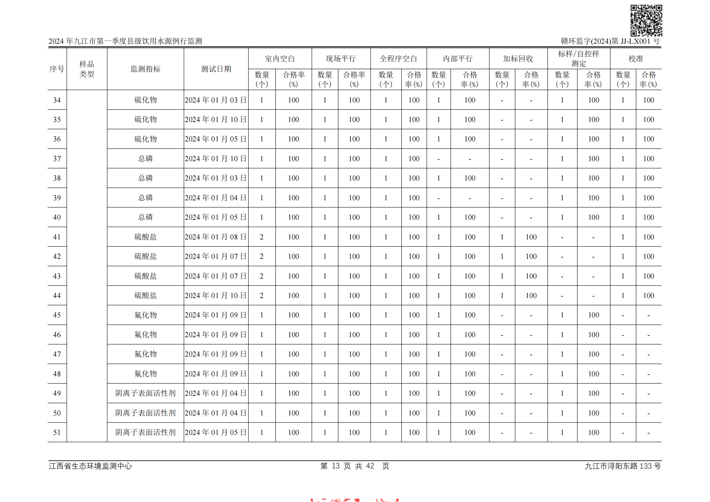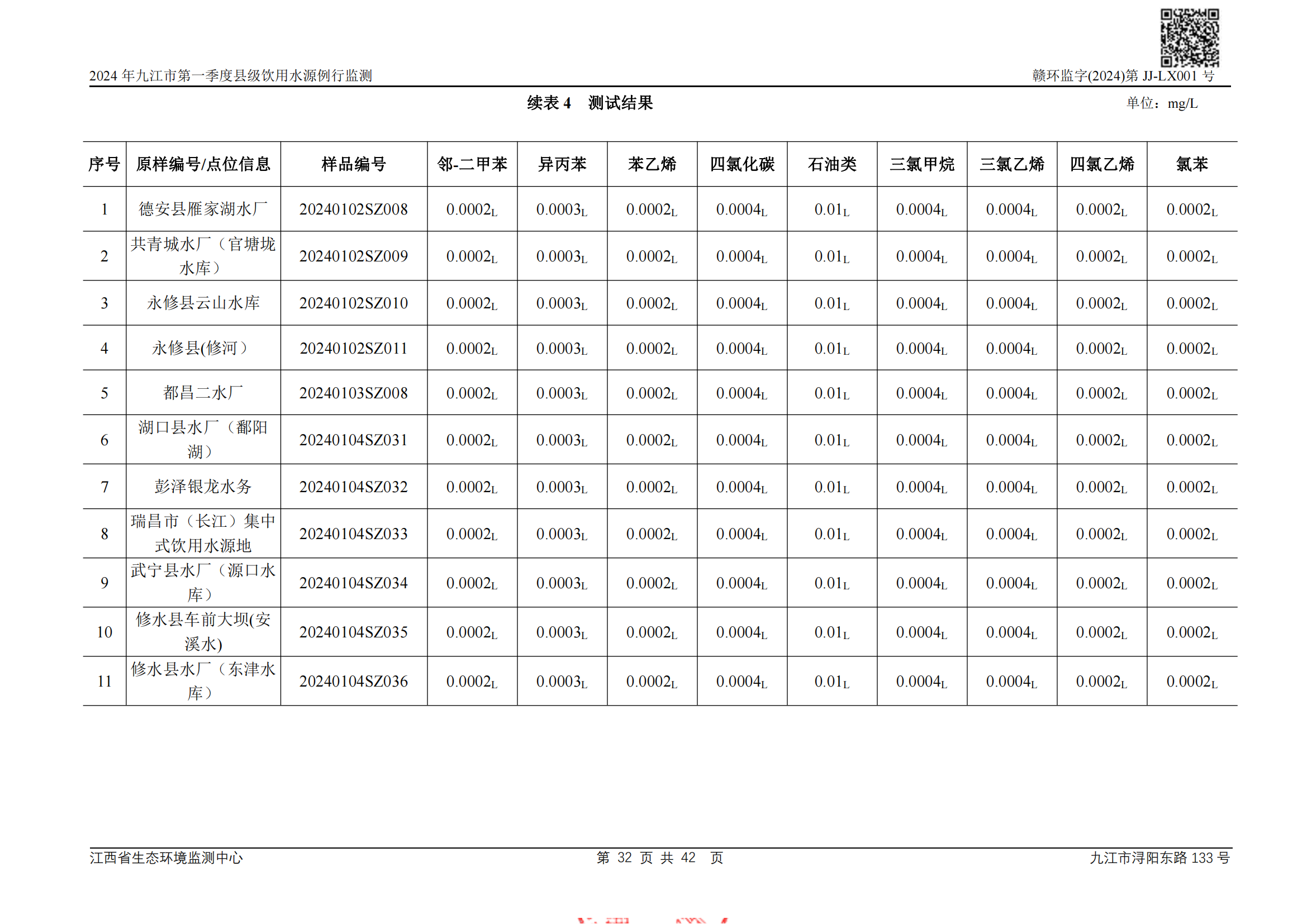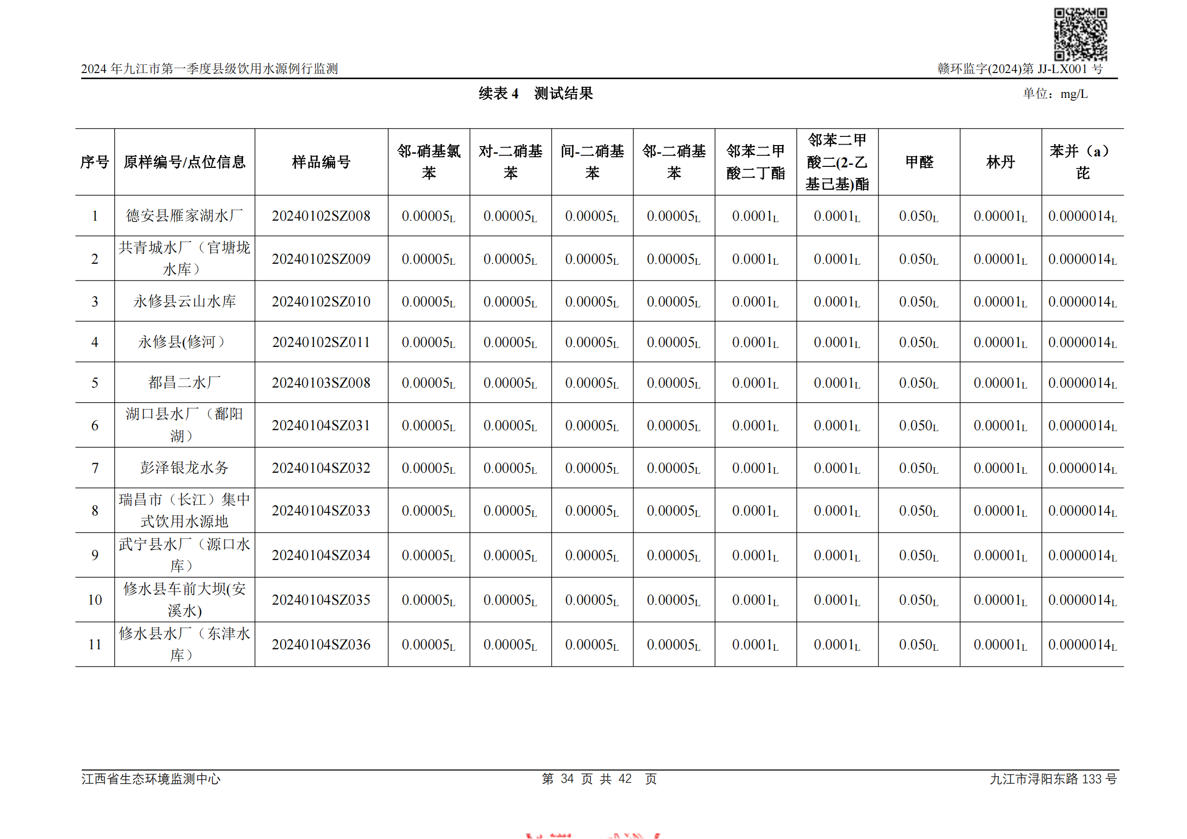 2024年九江市第一季度县级饮用水源例行监测监测报告