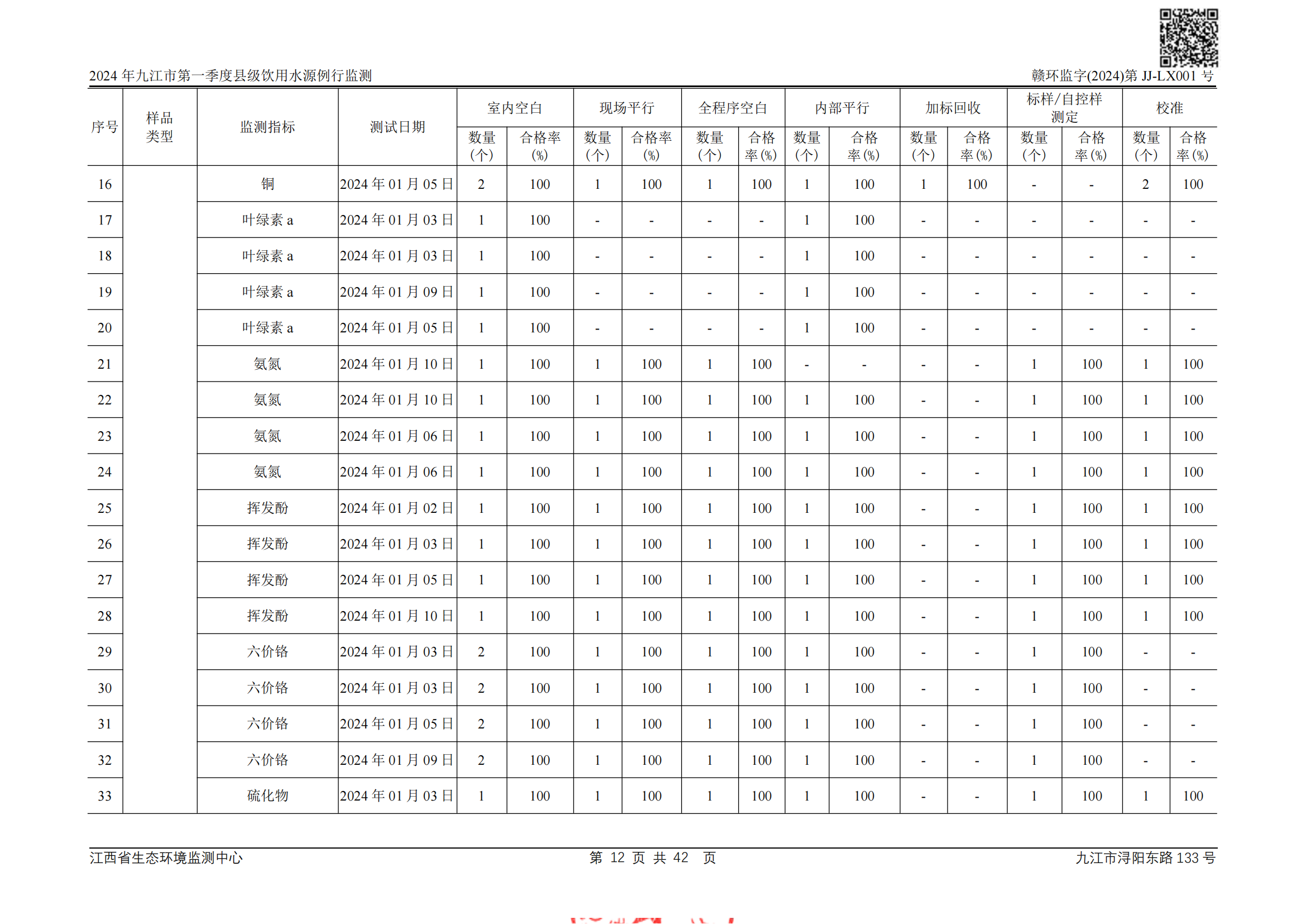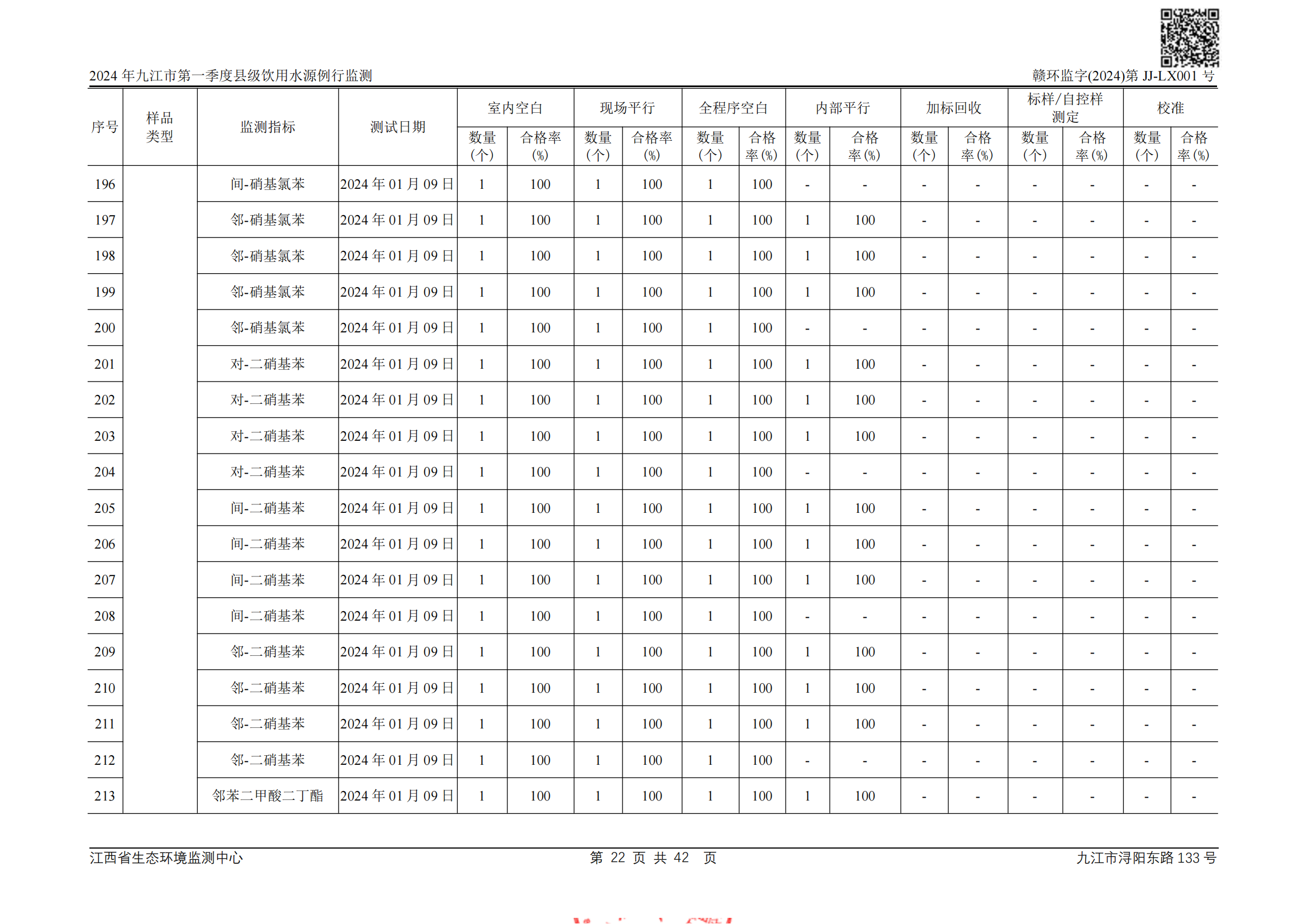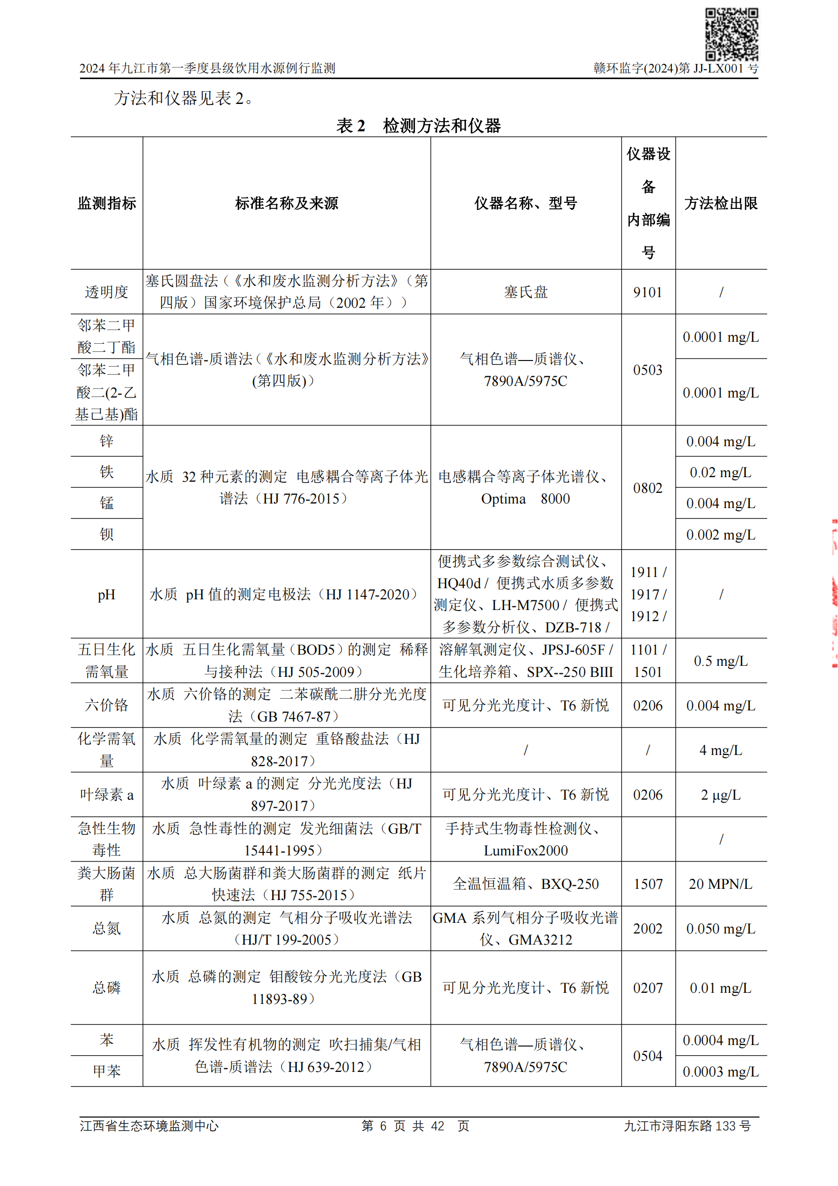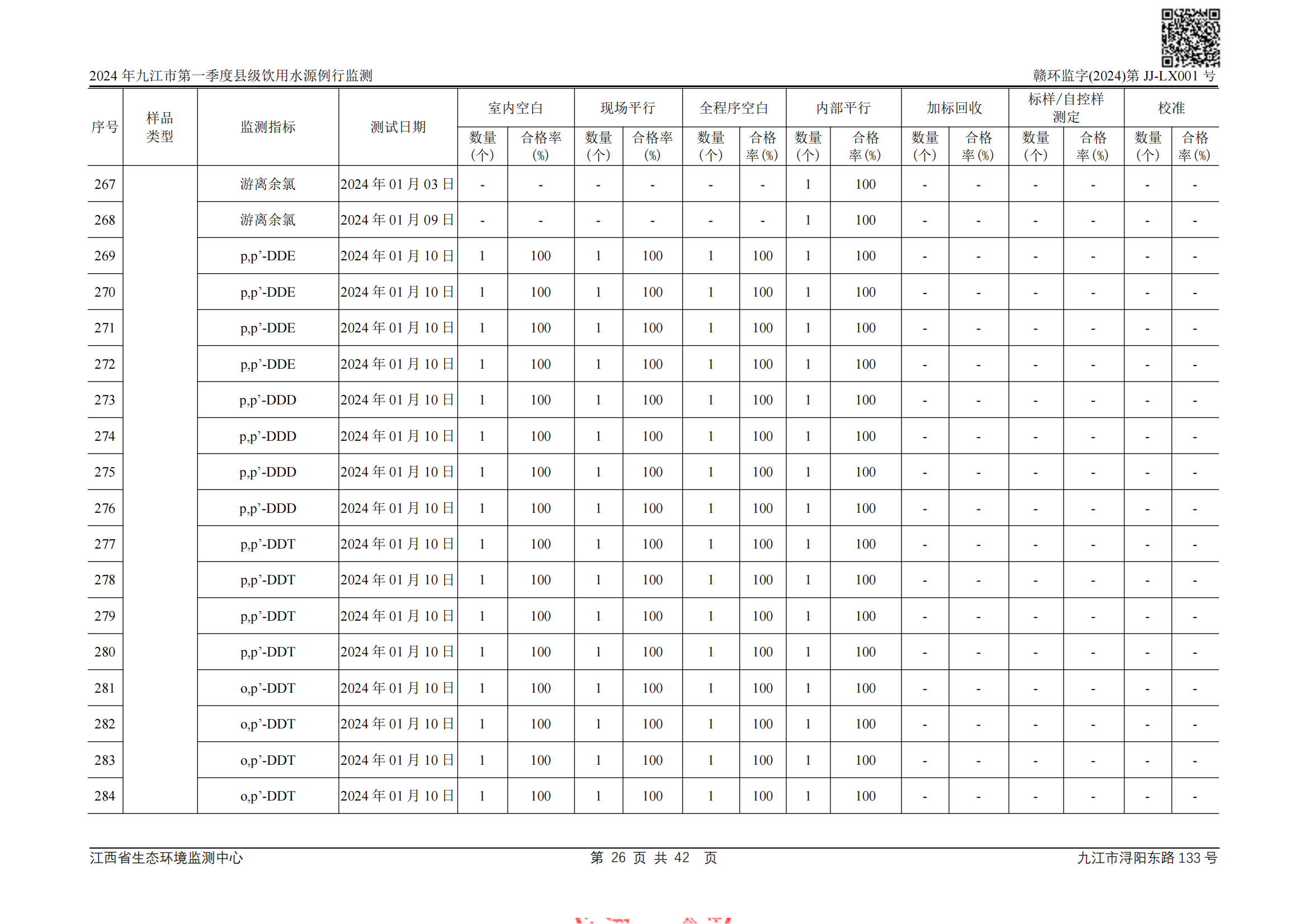 2024年九江市第一季度县级饮用水源例行监测监测报告