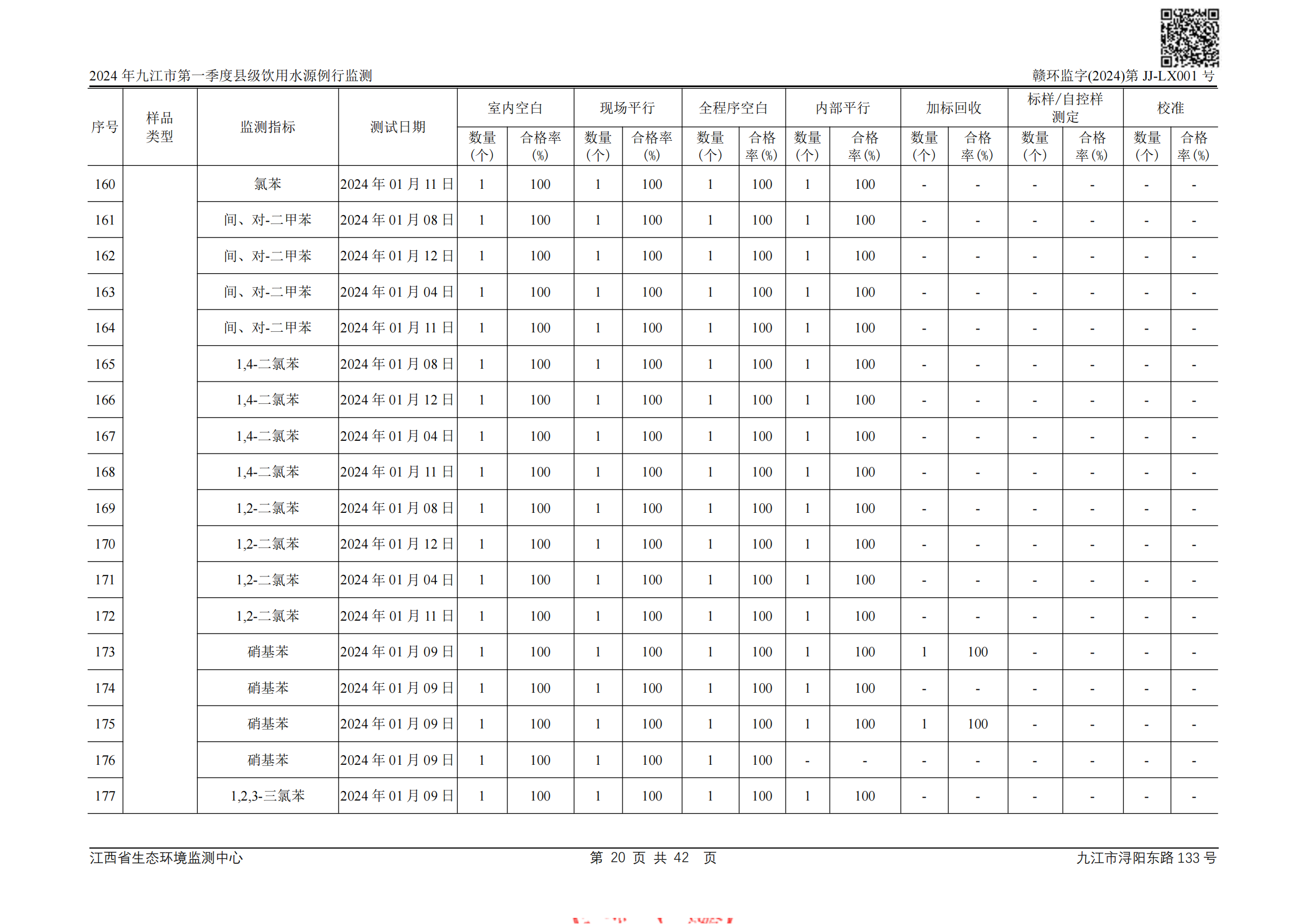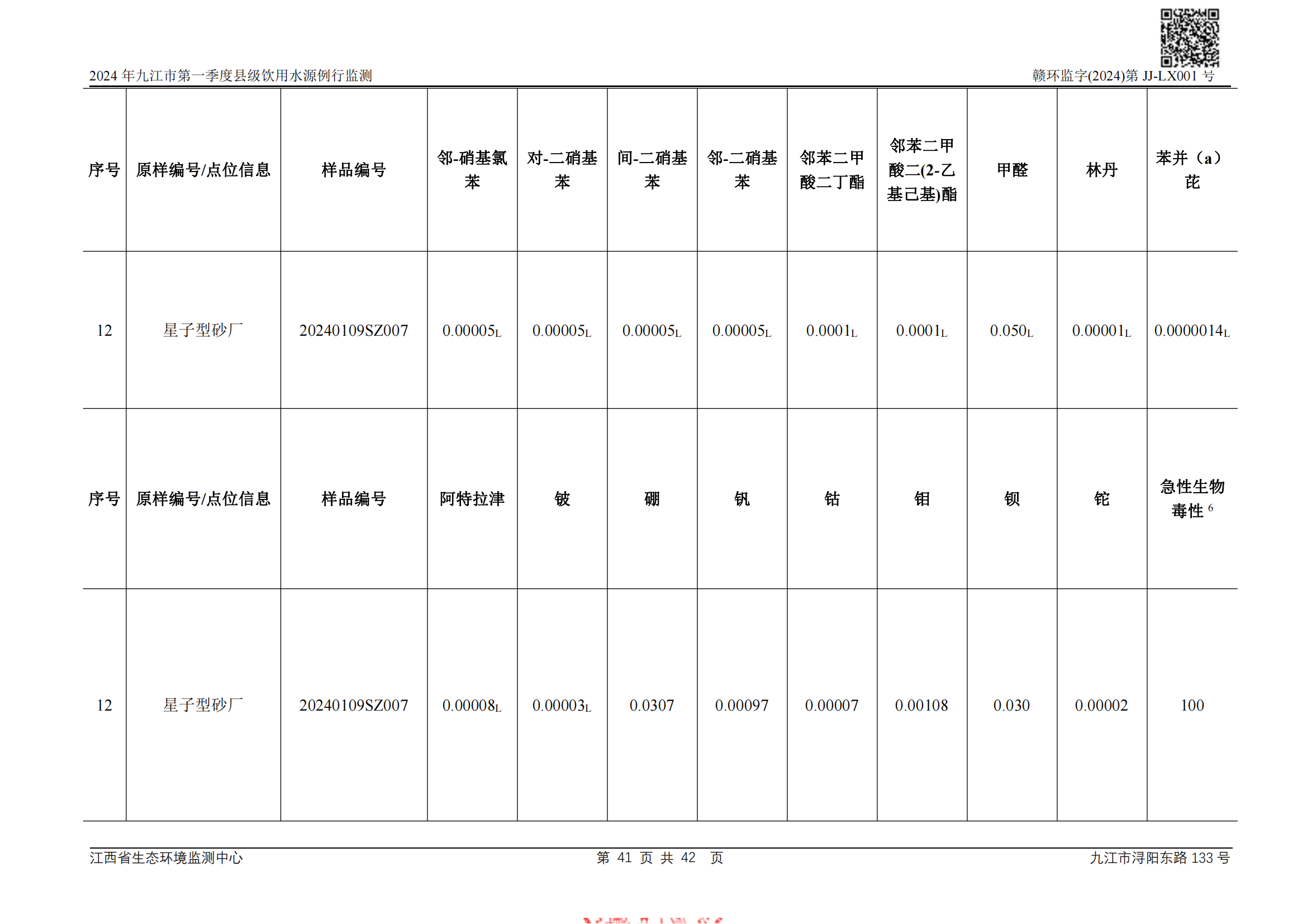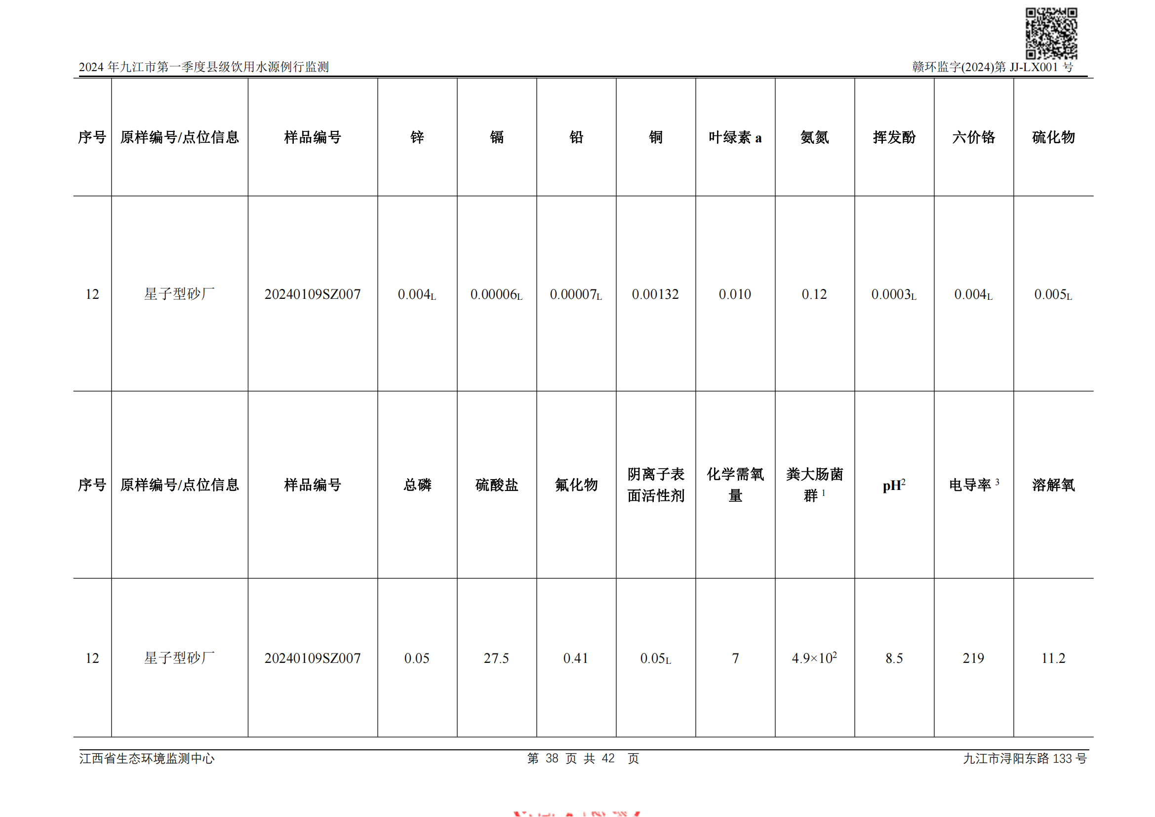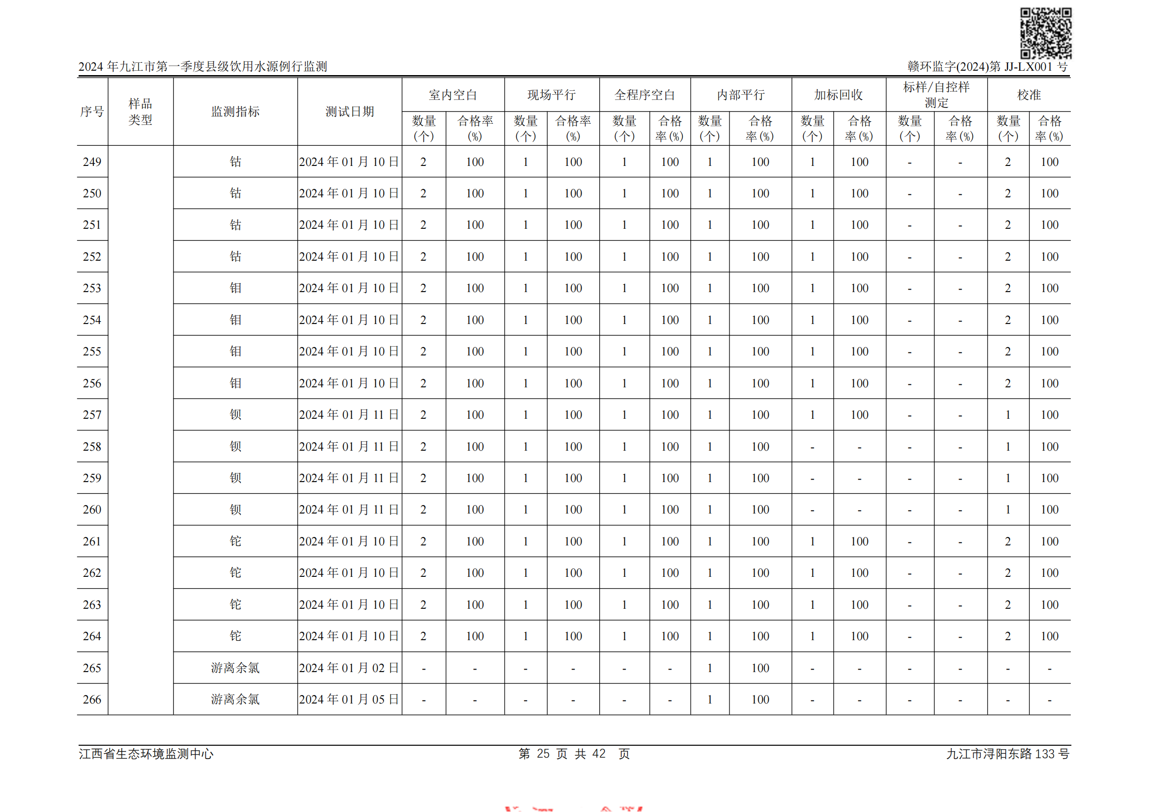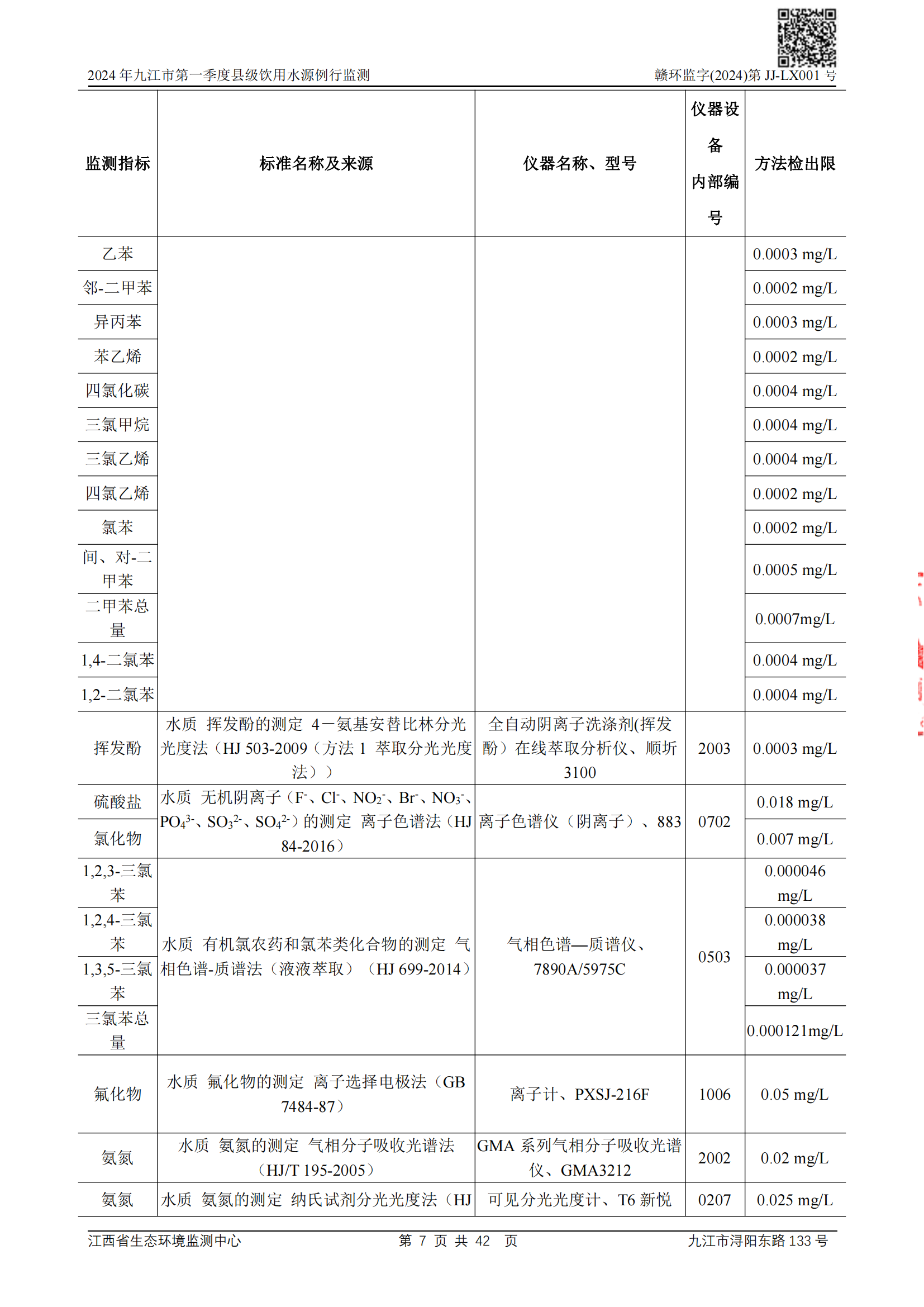 2024年九江市第一季度县级饮用水源例行监测监测报告
