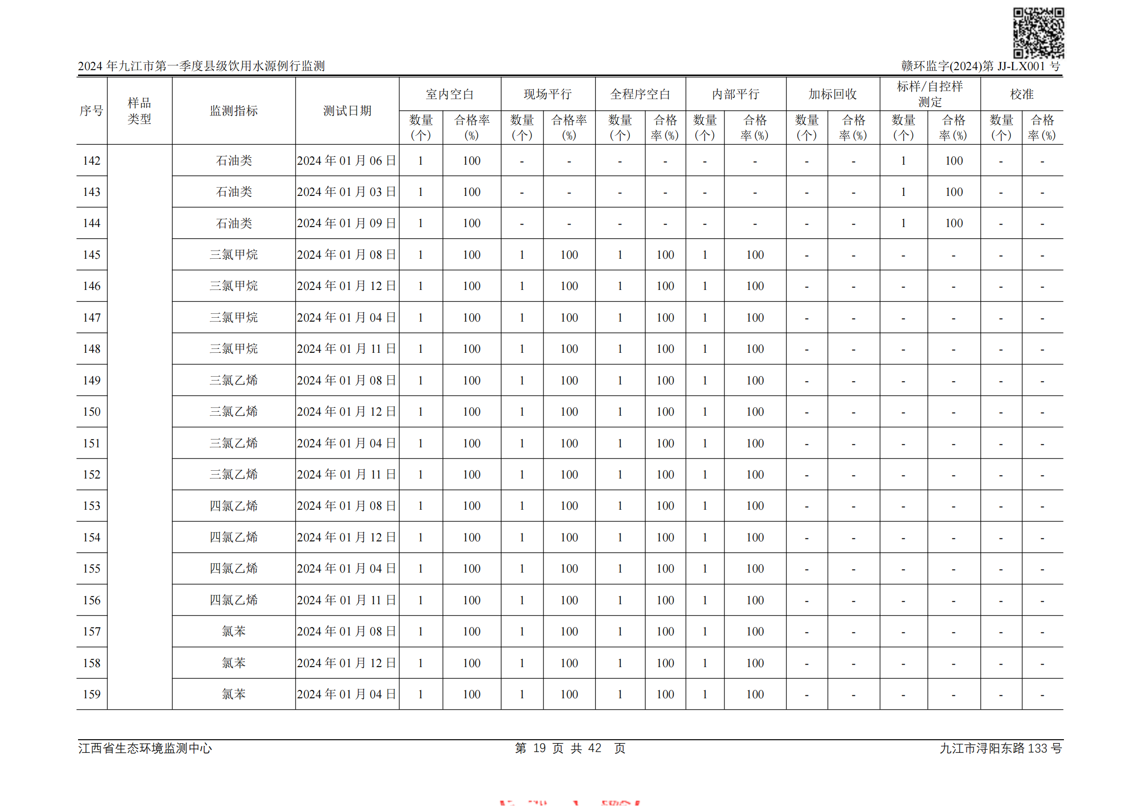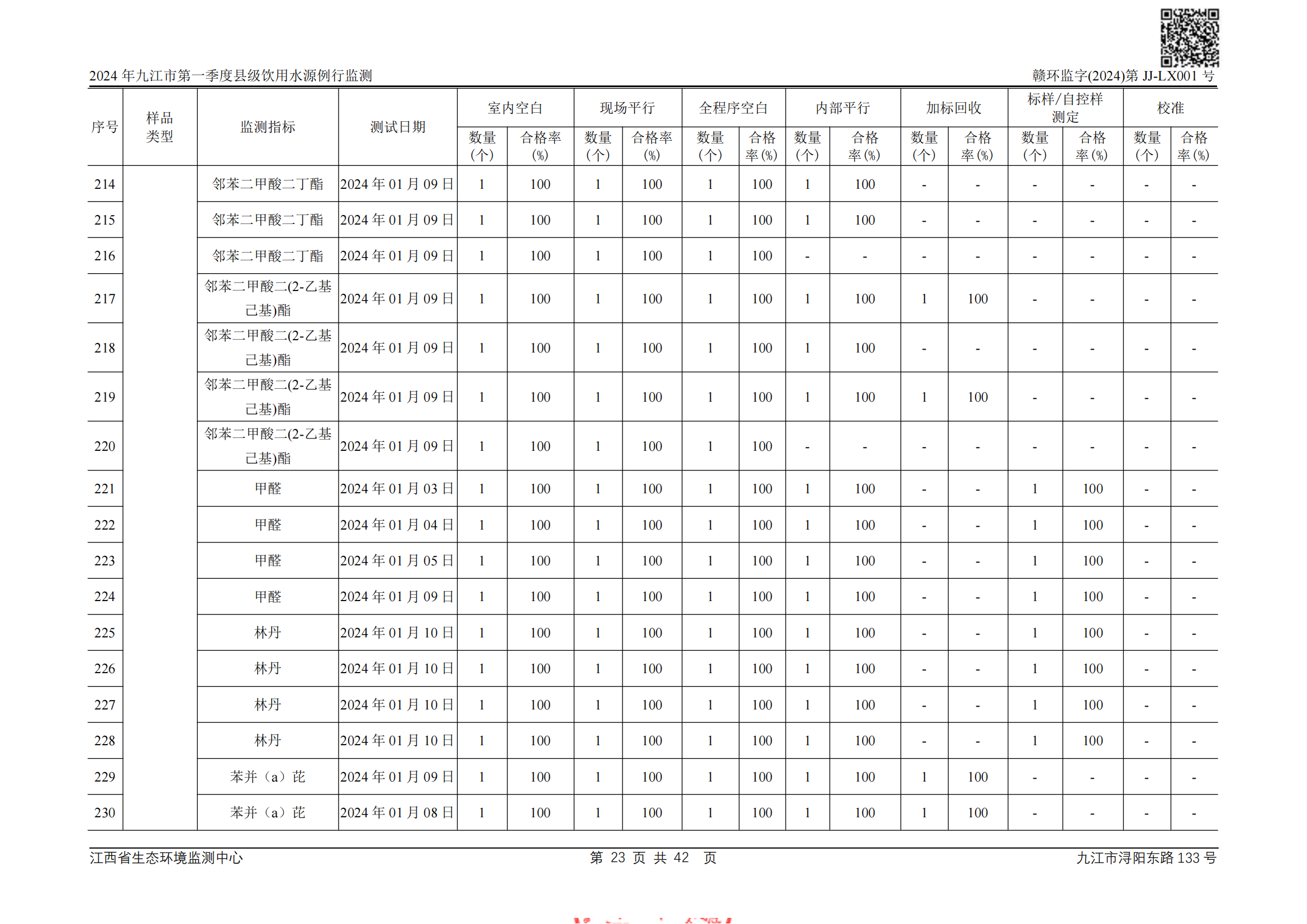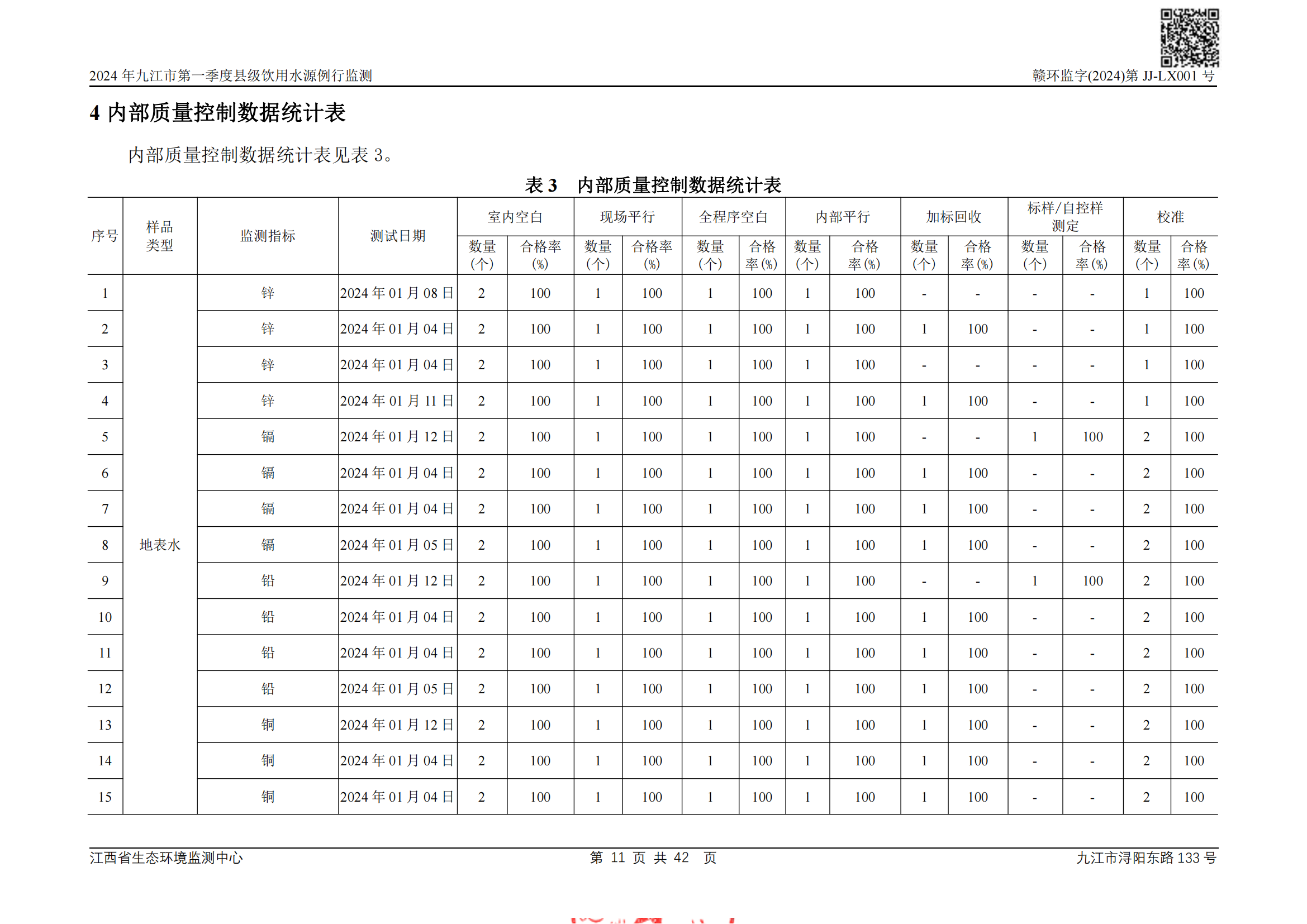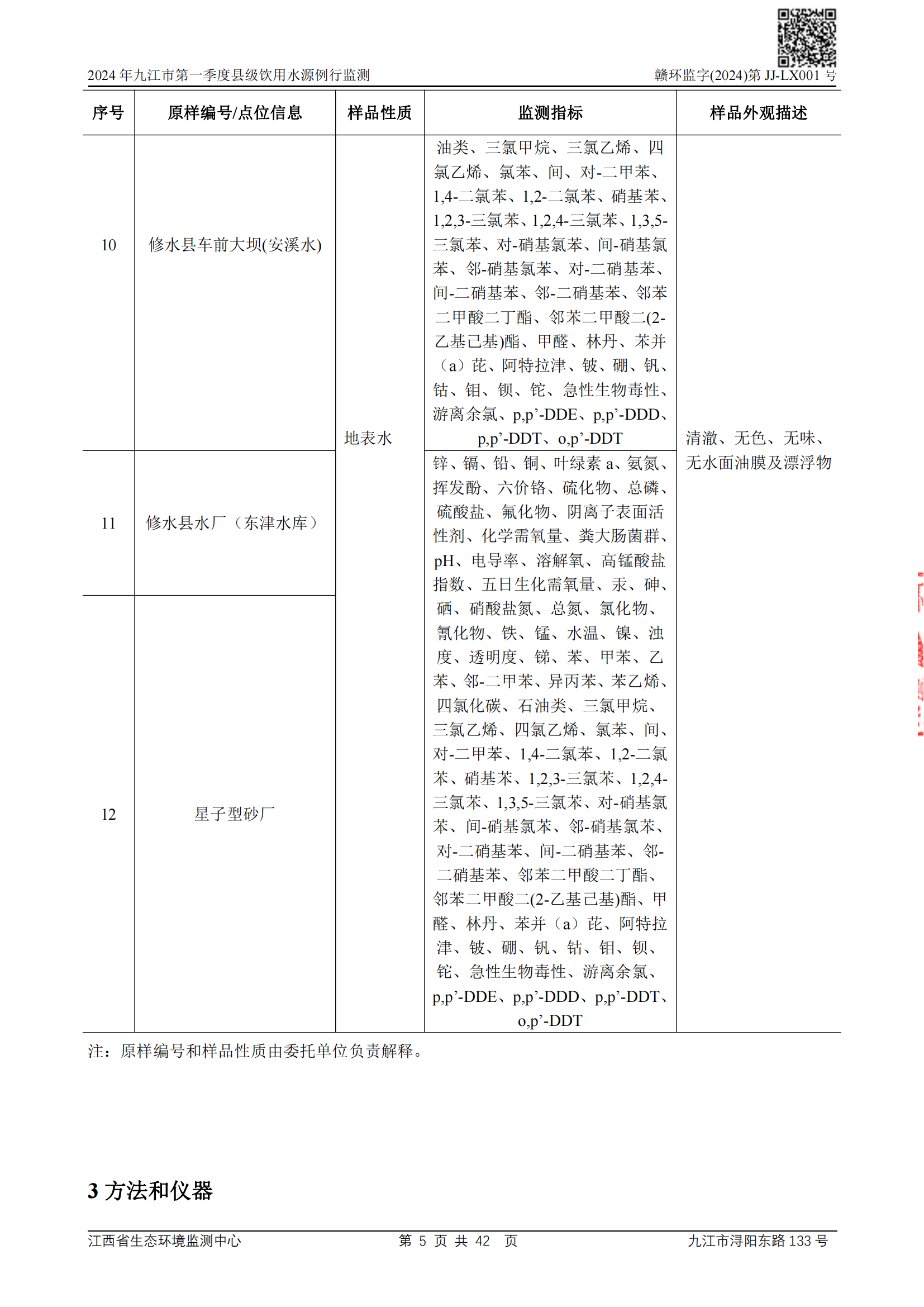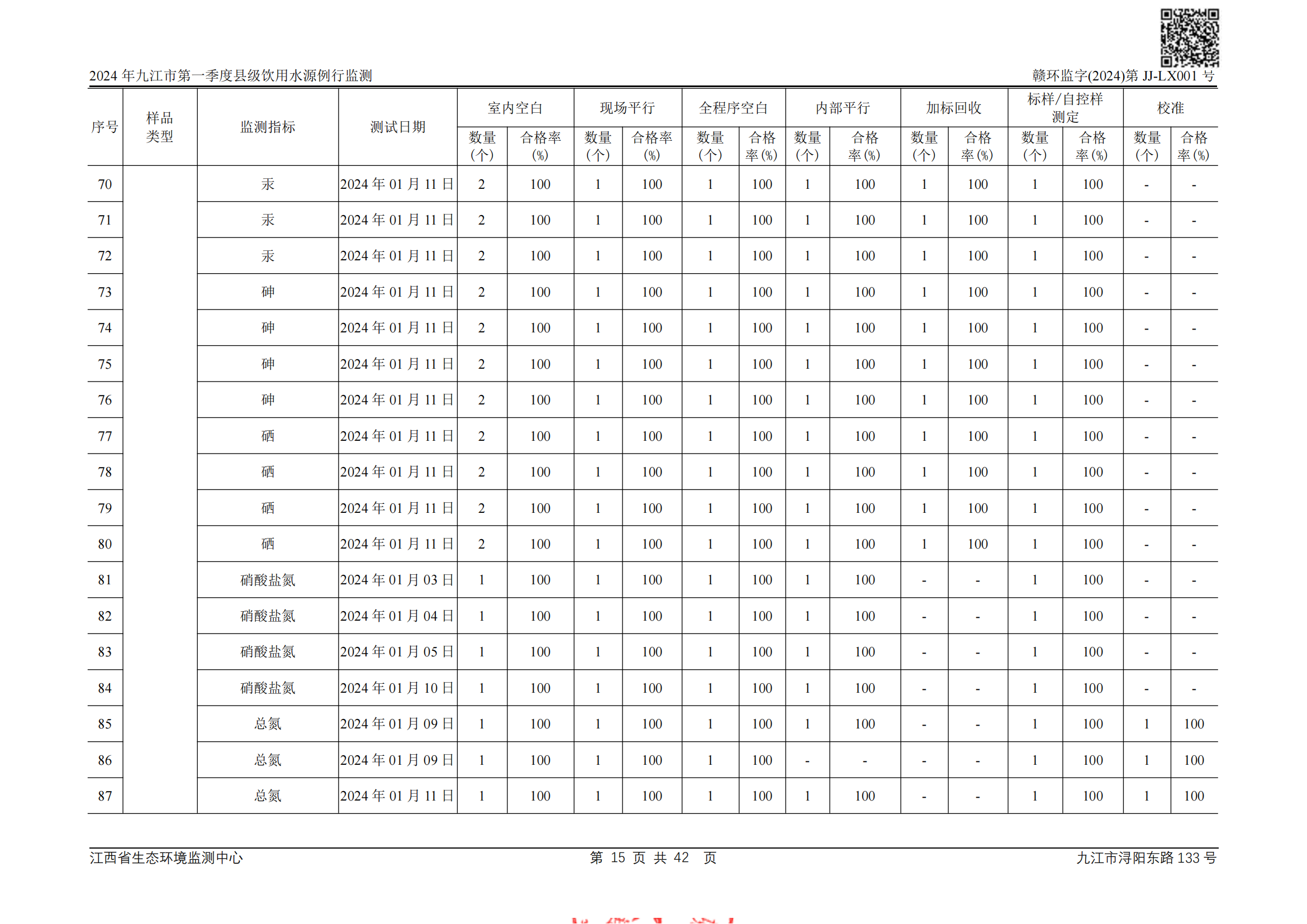 2024年九江市第一季度县级饮用水源例行监测监测报告