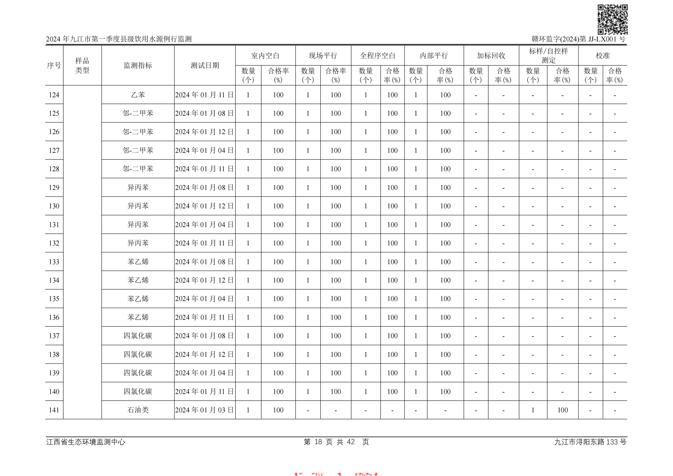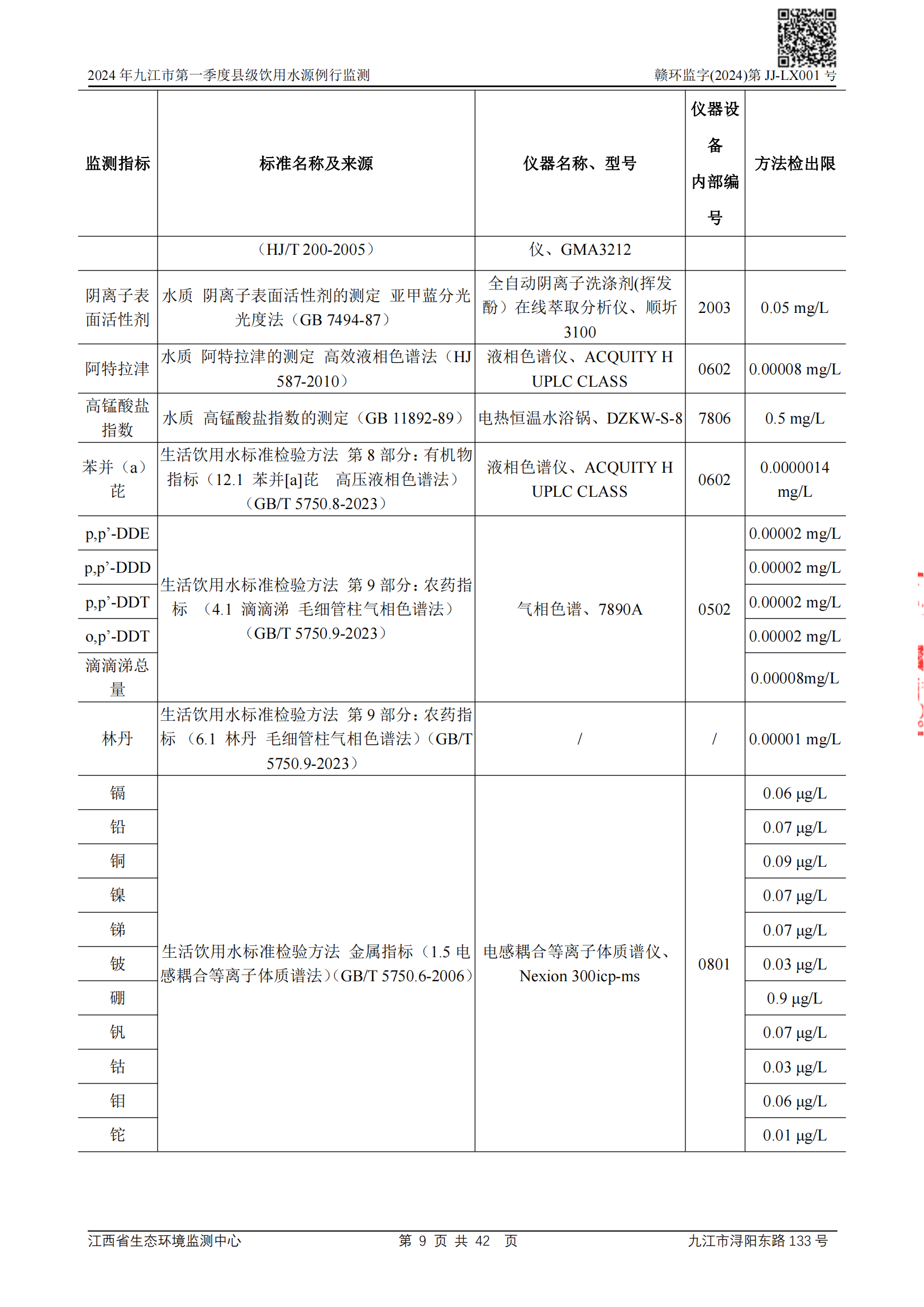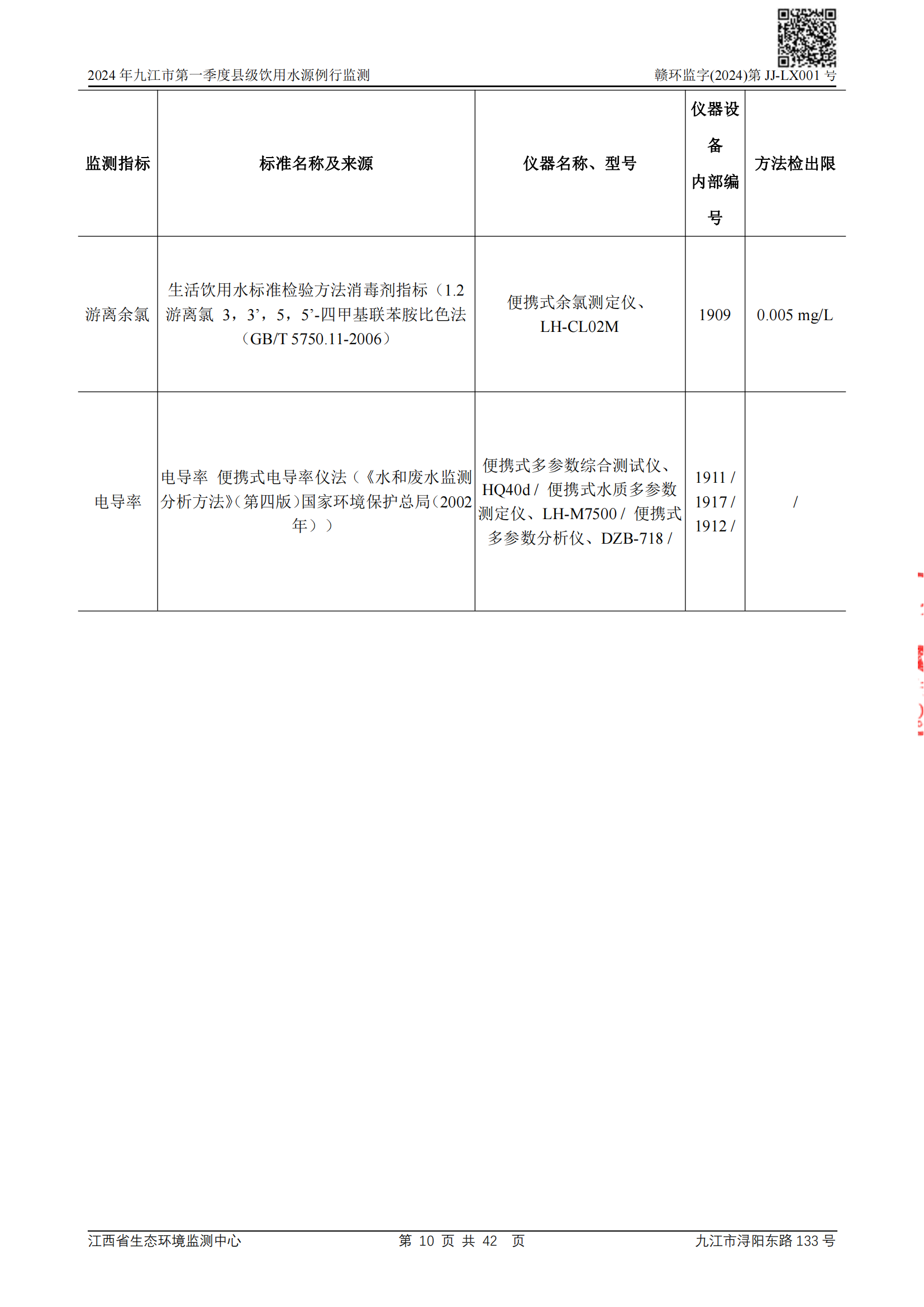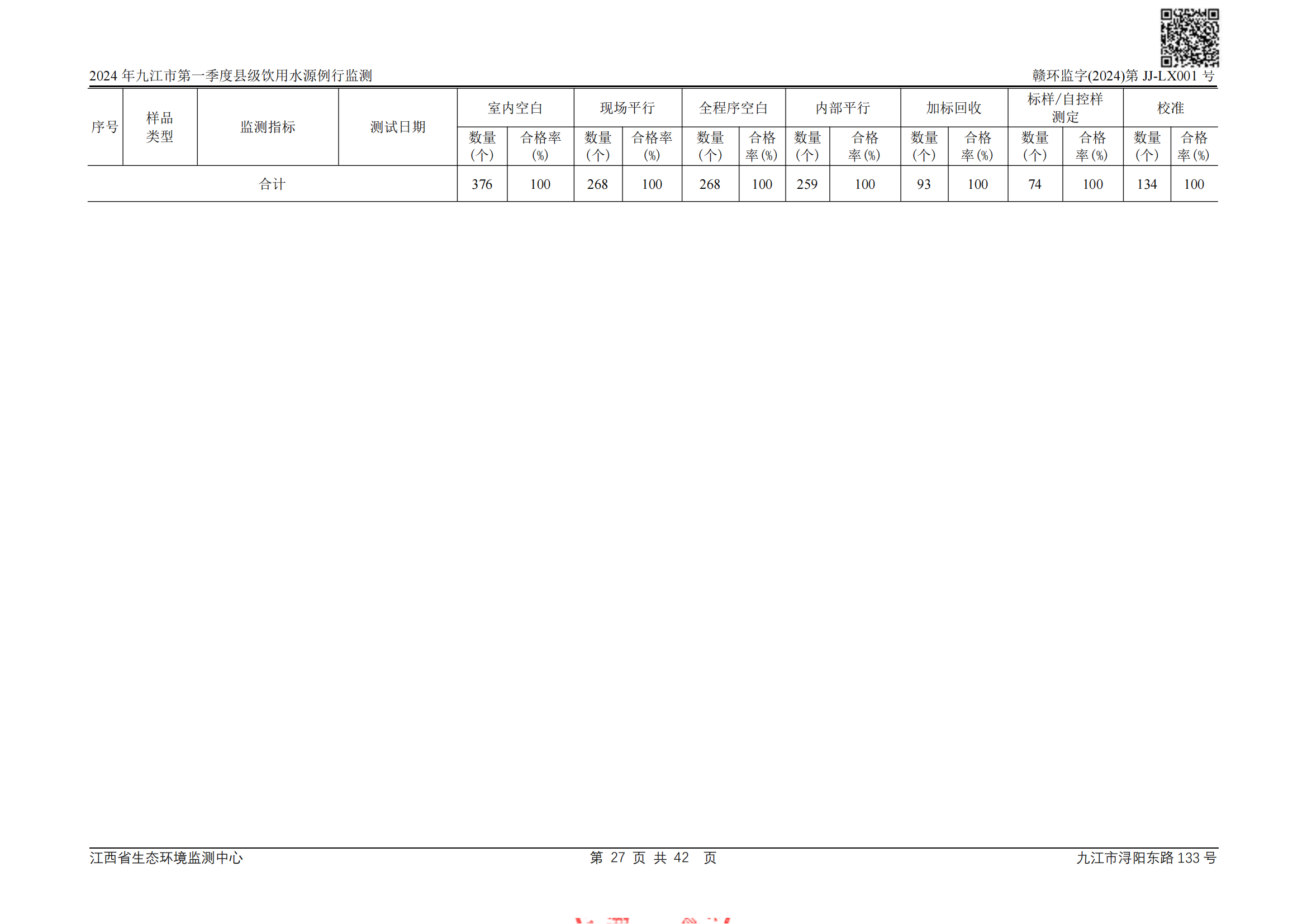 2024年九江市第一季度县级饮用水源例行监测监测报告
