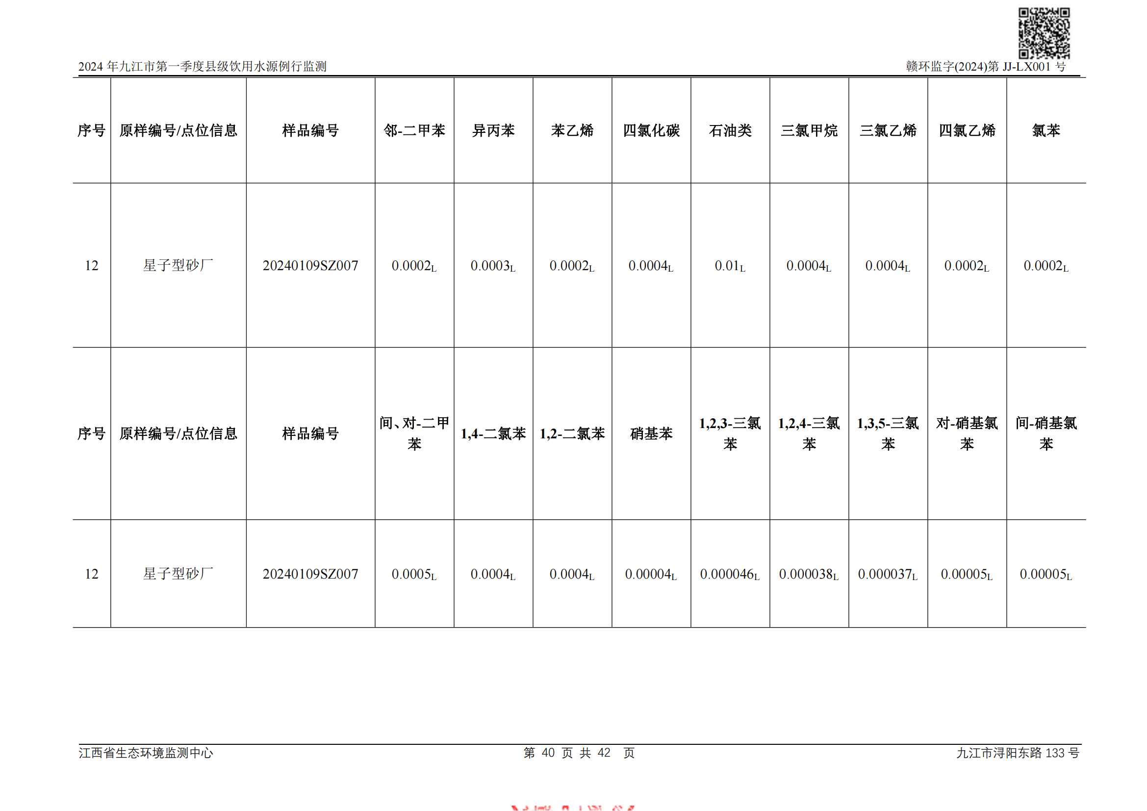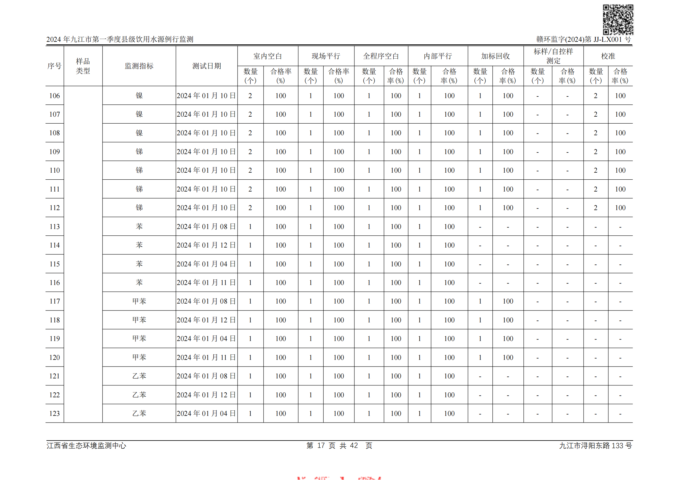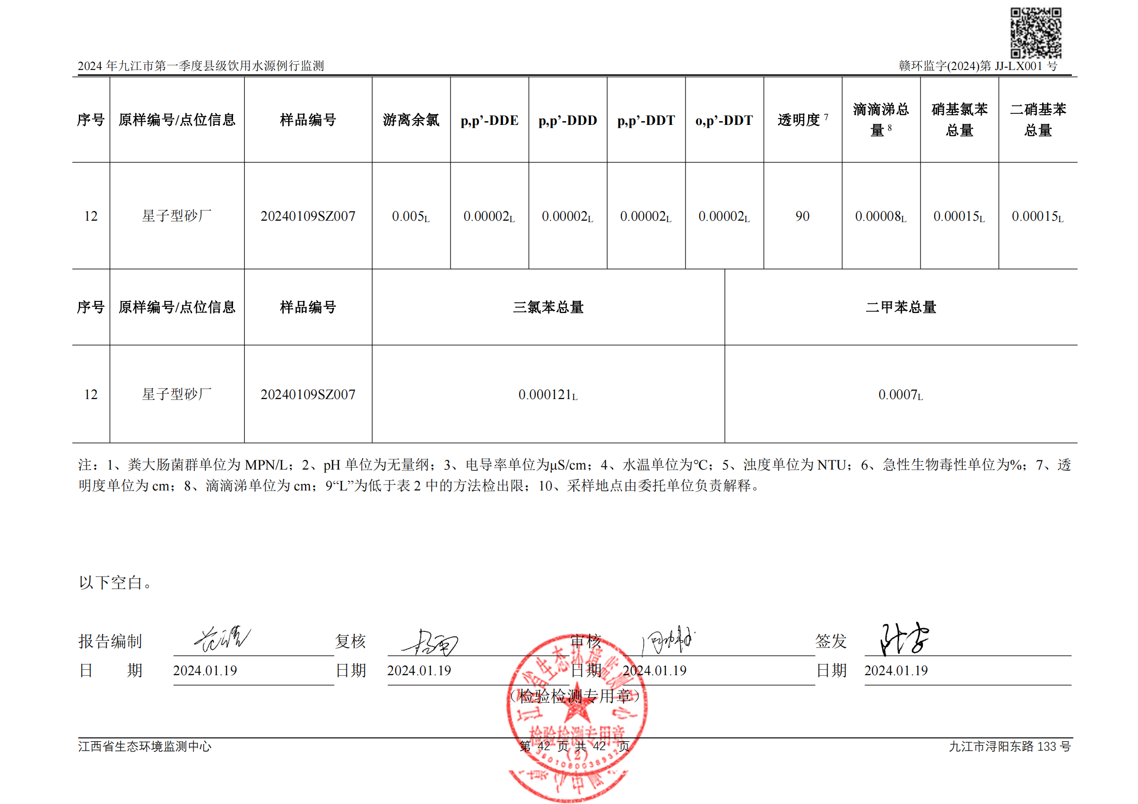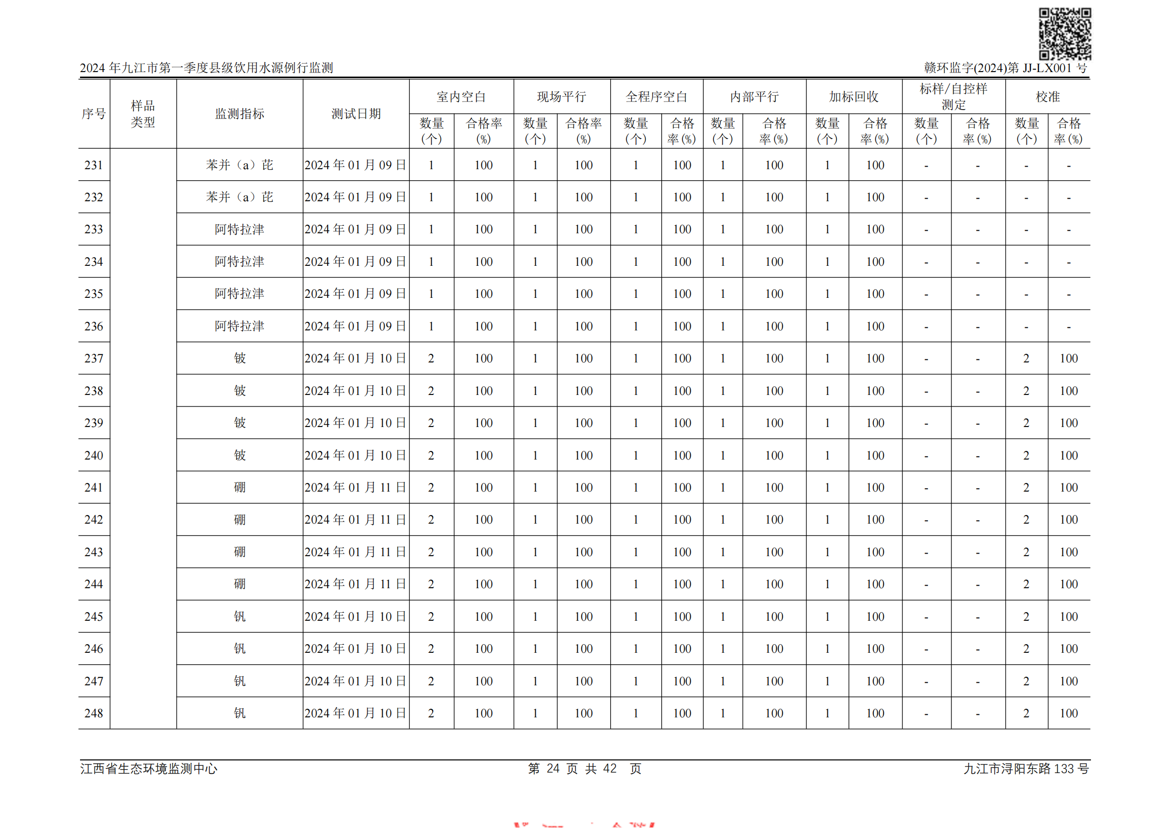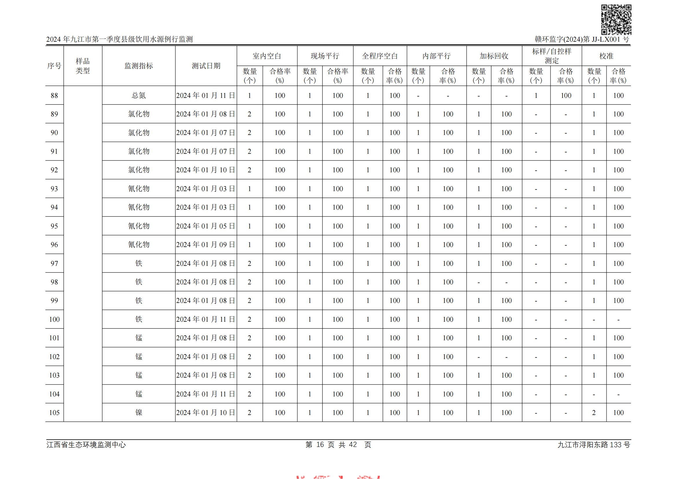 2024年九江市第一季度县级饮用水源例行监测监测报告