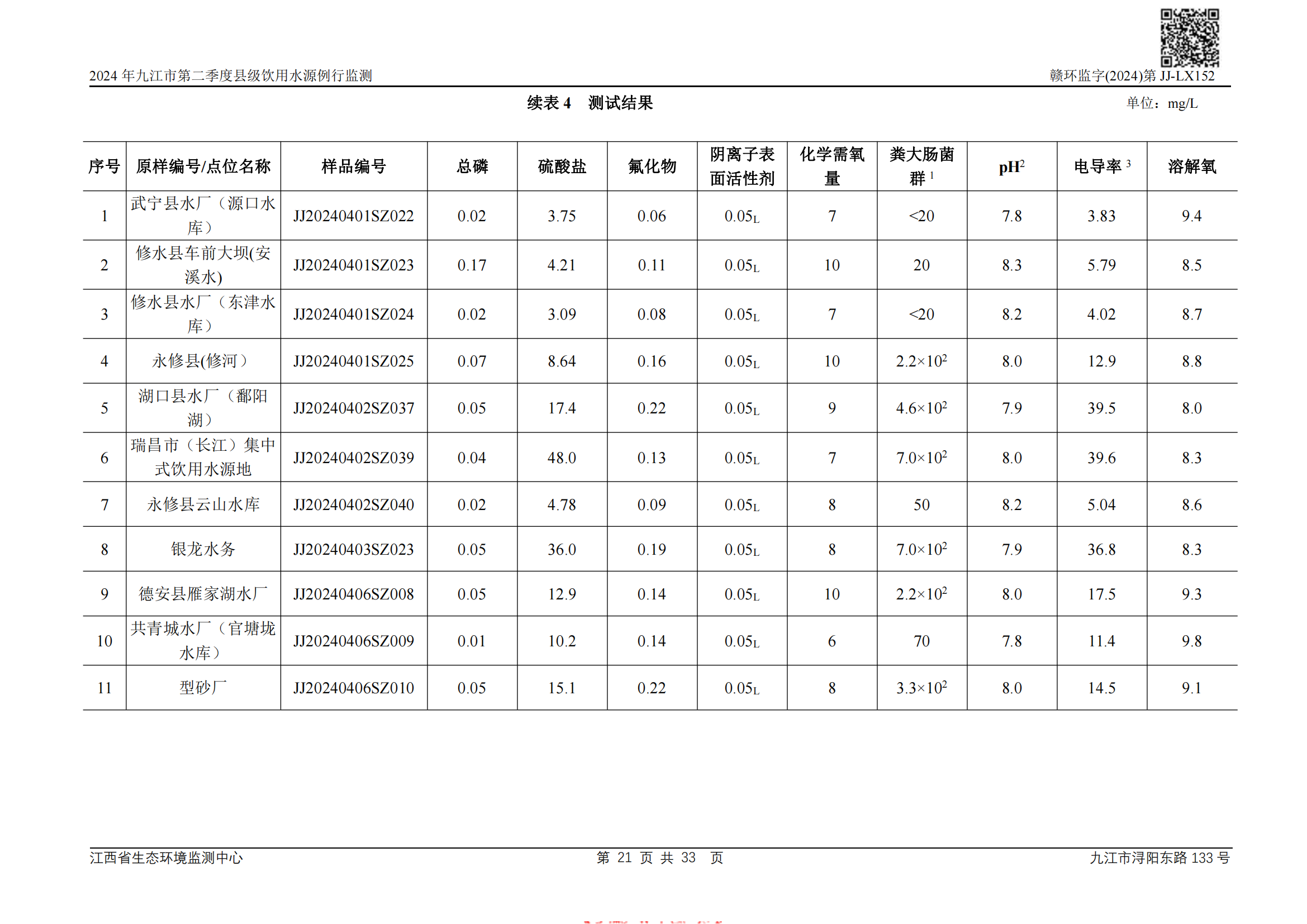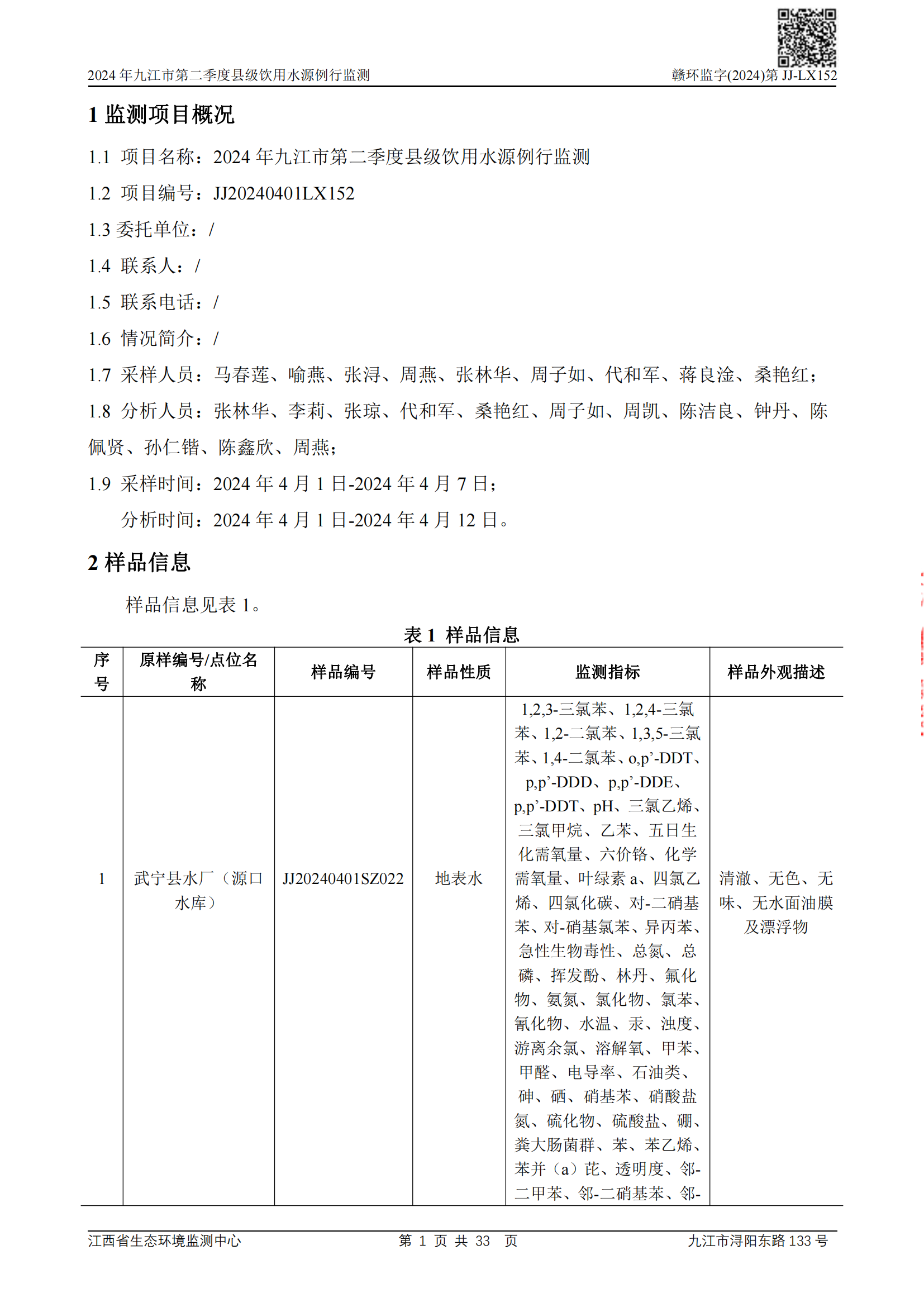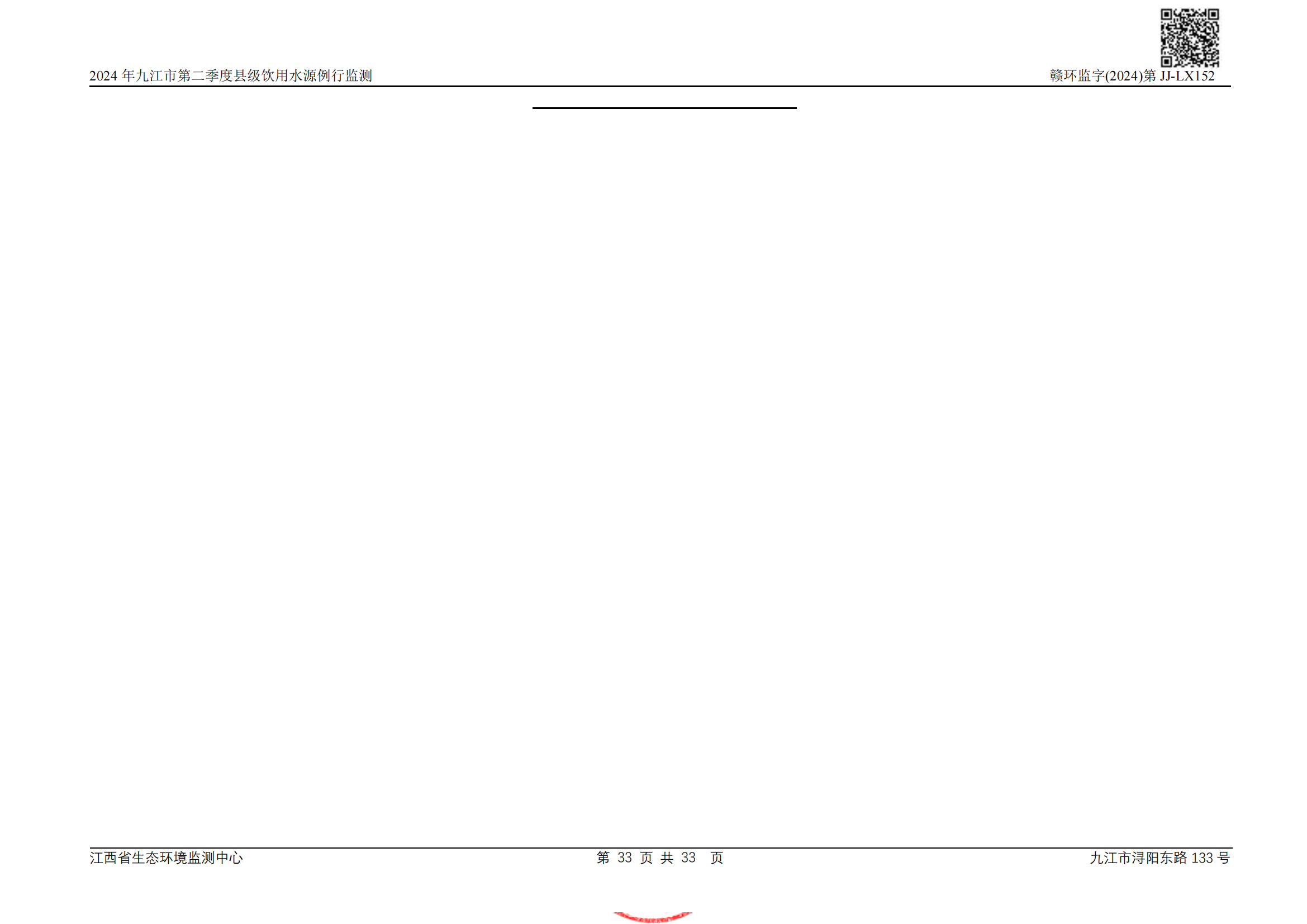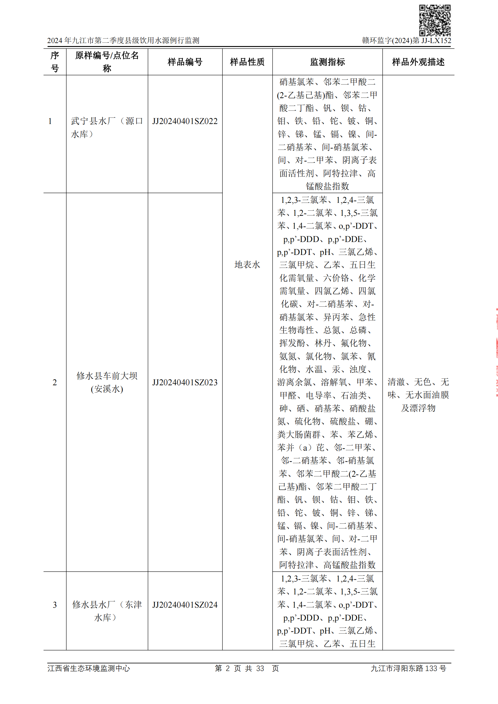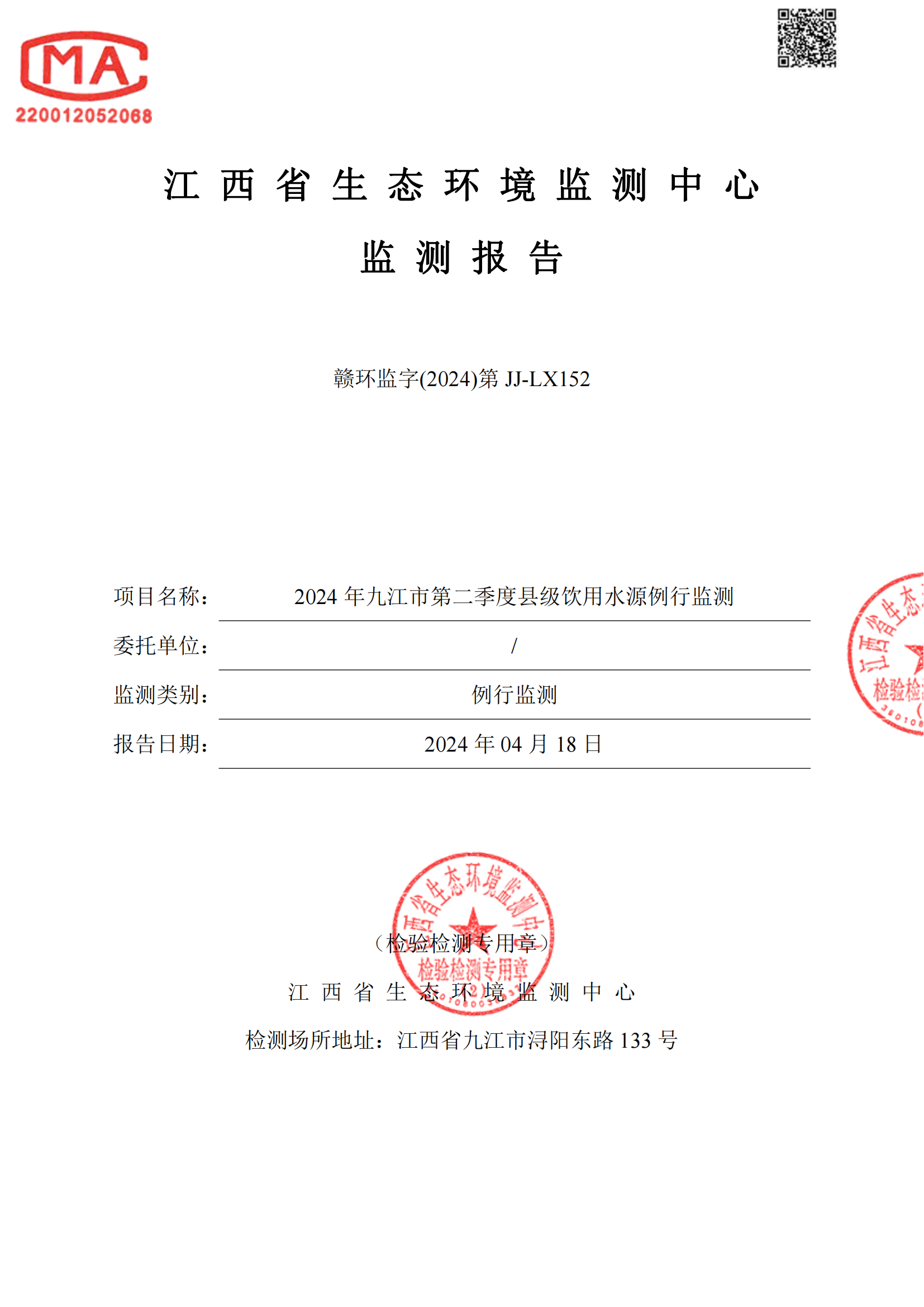 2024年九江市第二季度县级饮用水源例行监测监测报告