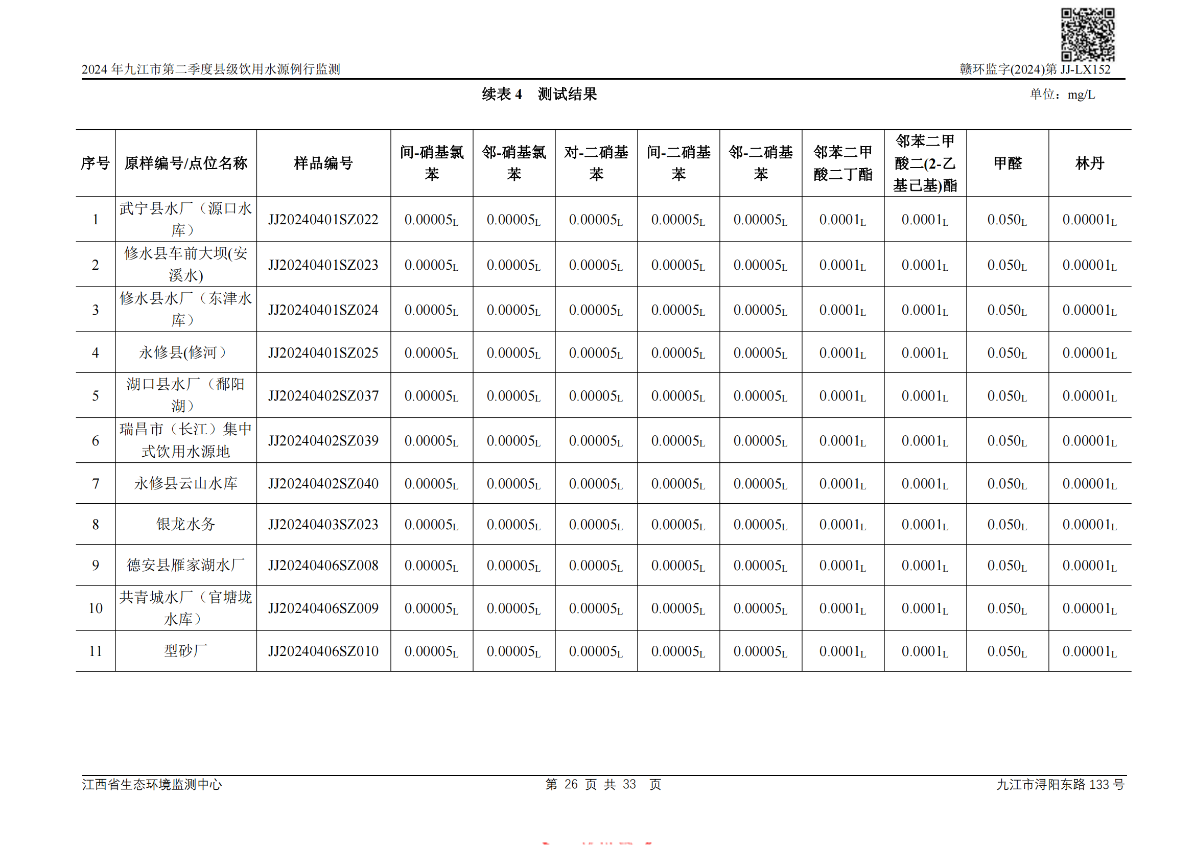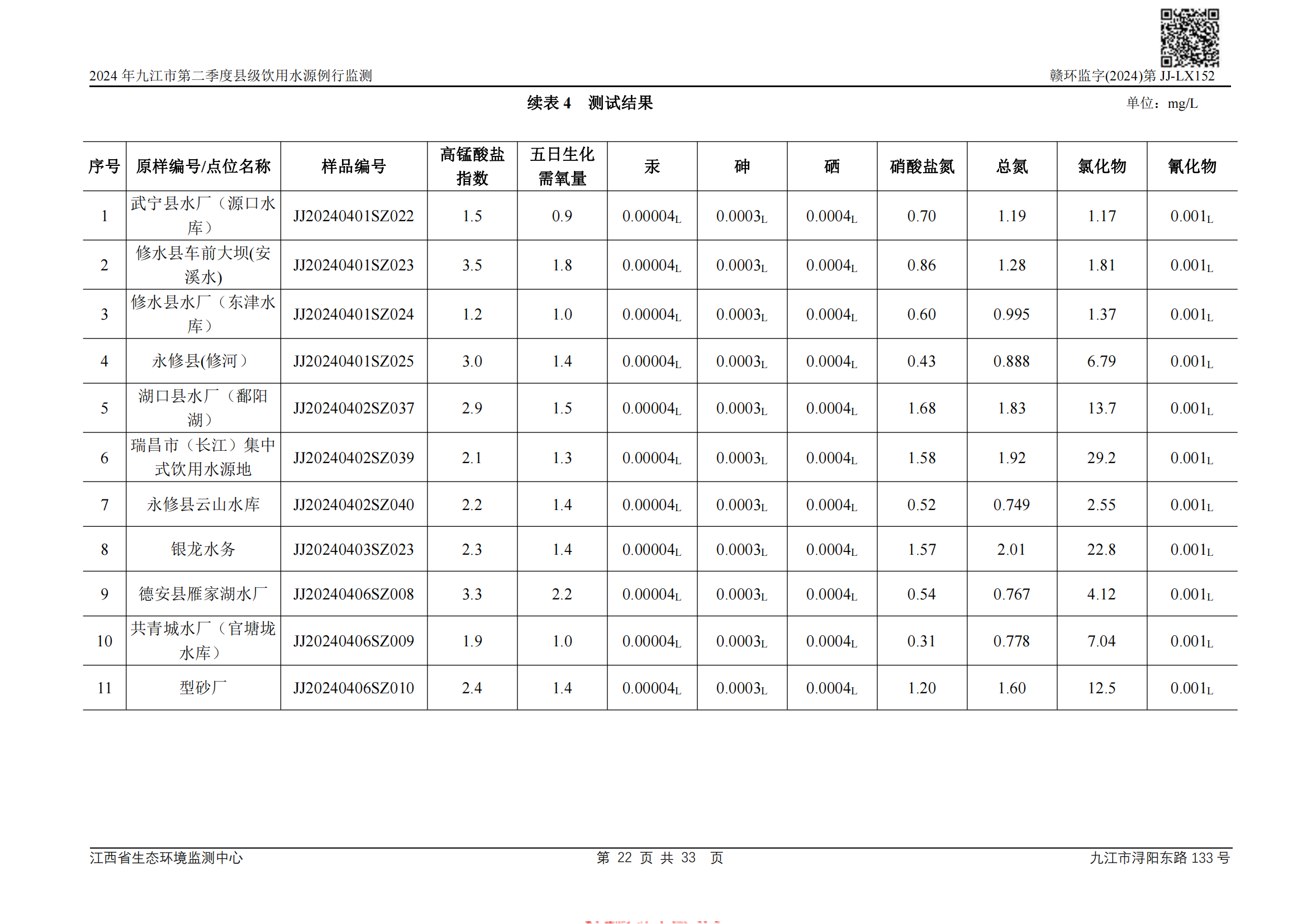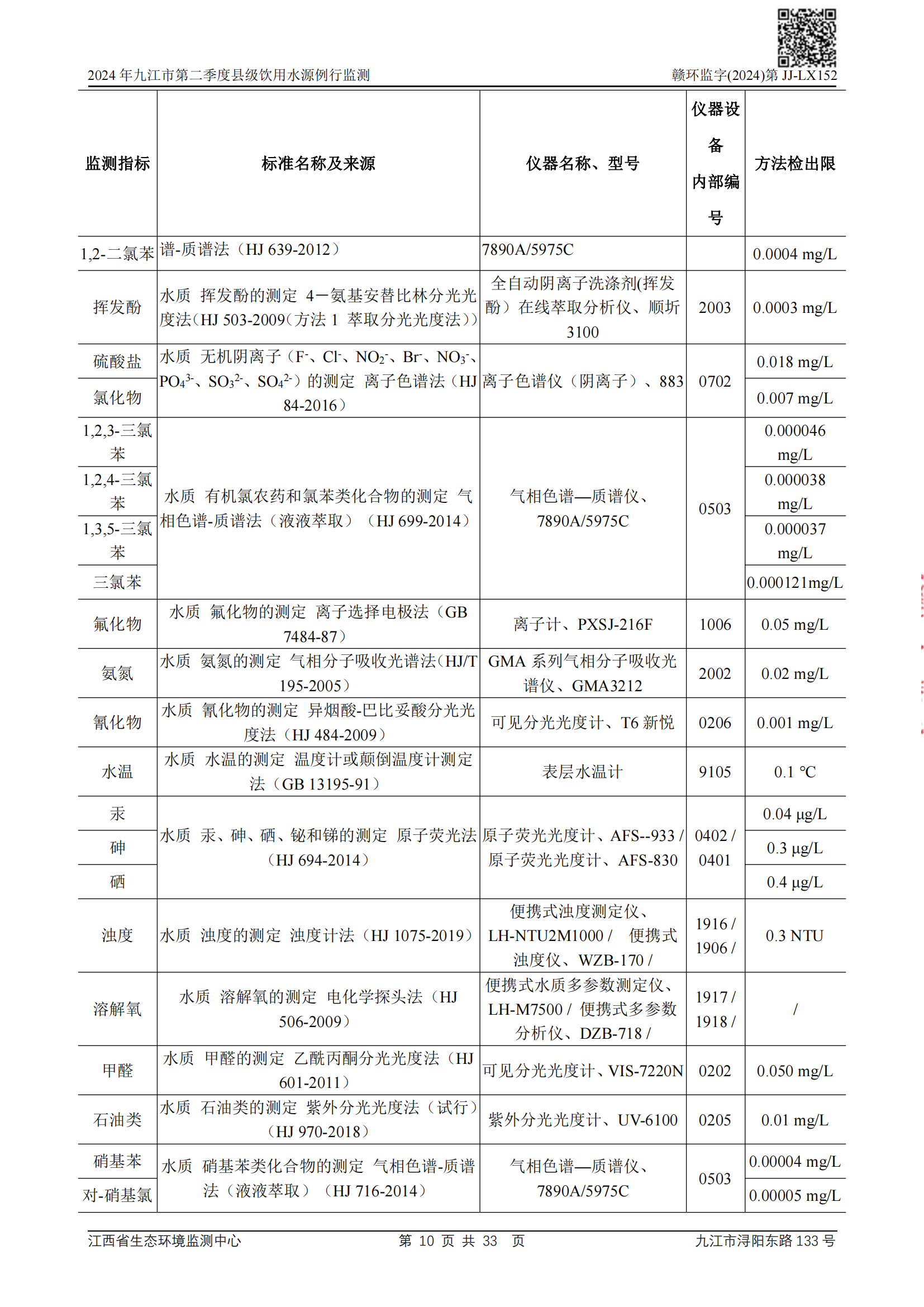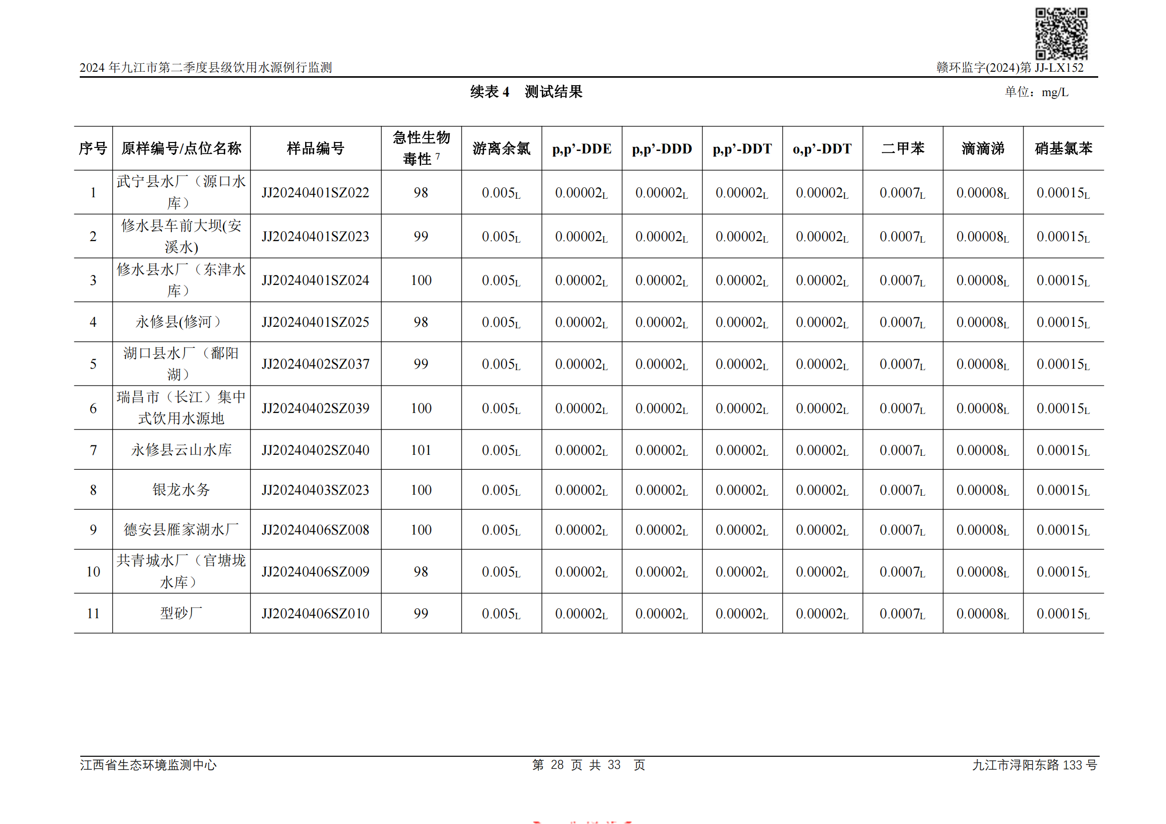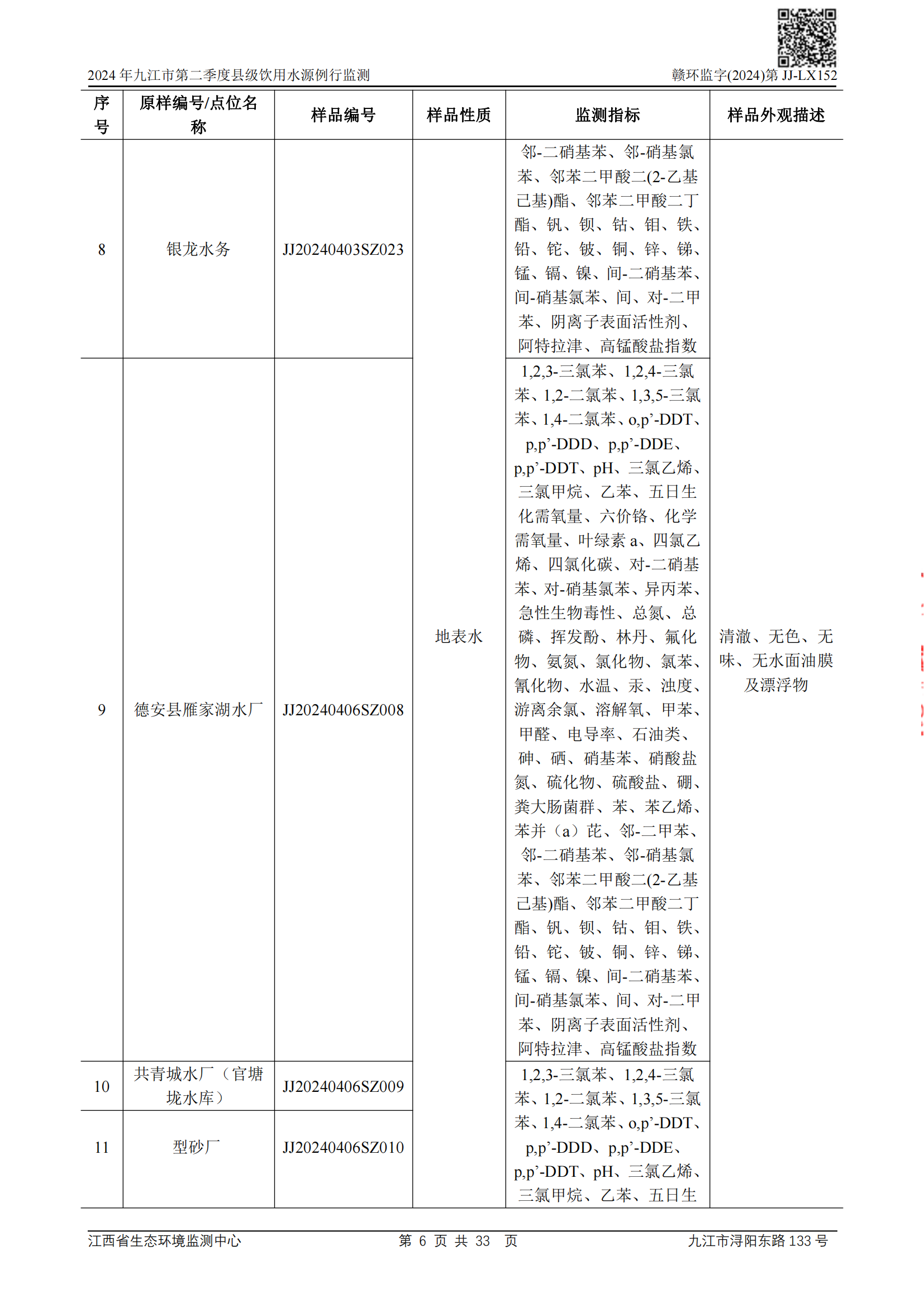 2024年九江市第二季度县级饮用水源例行监测监测报告