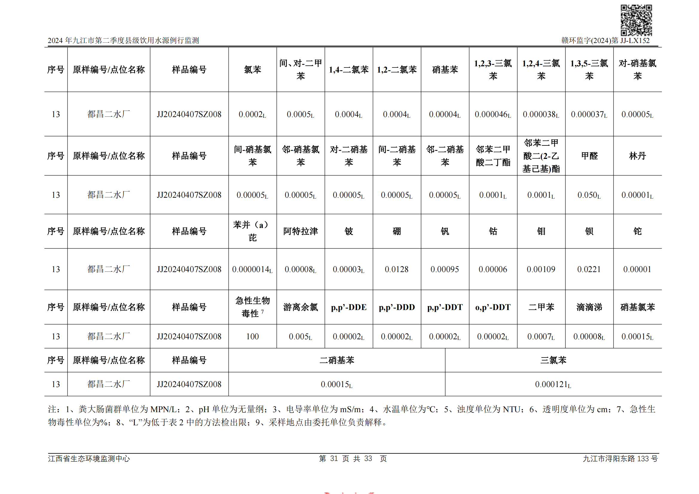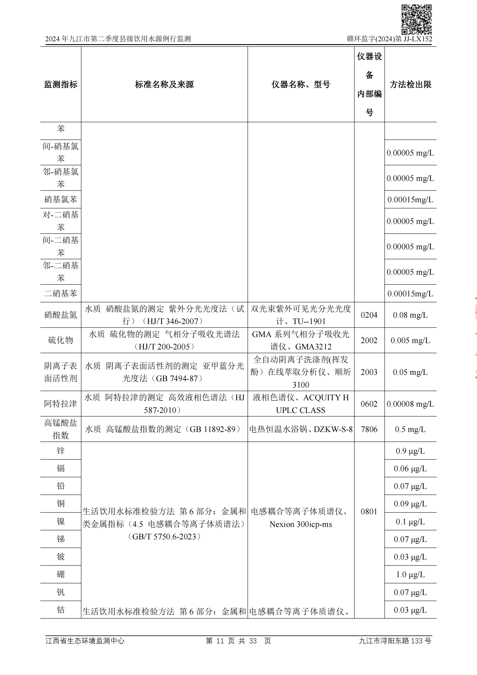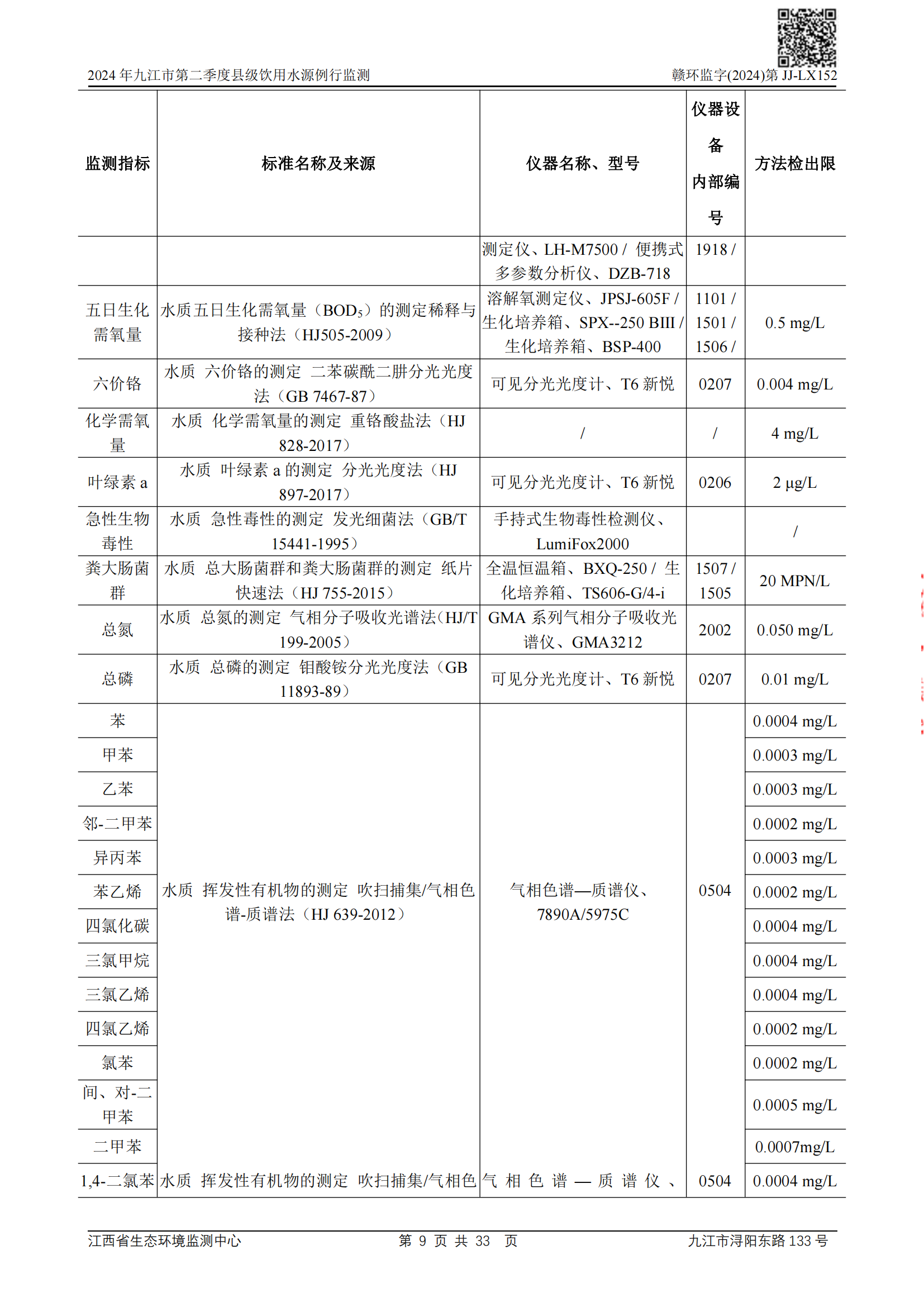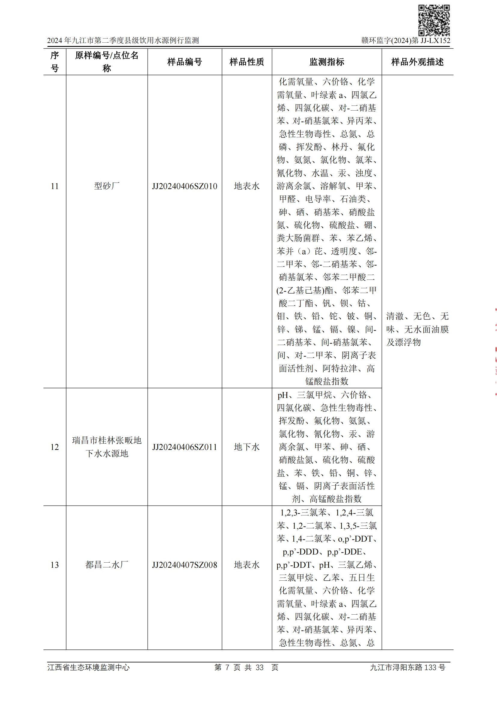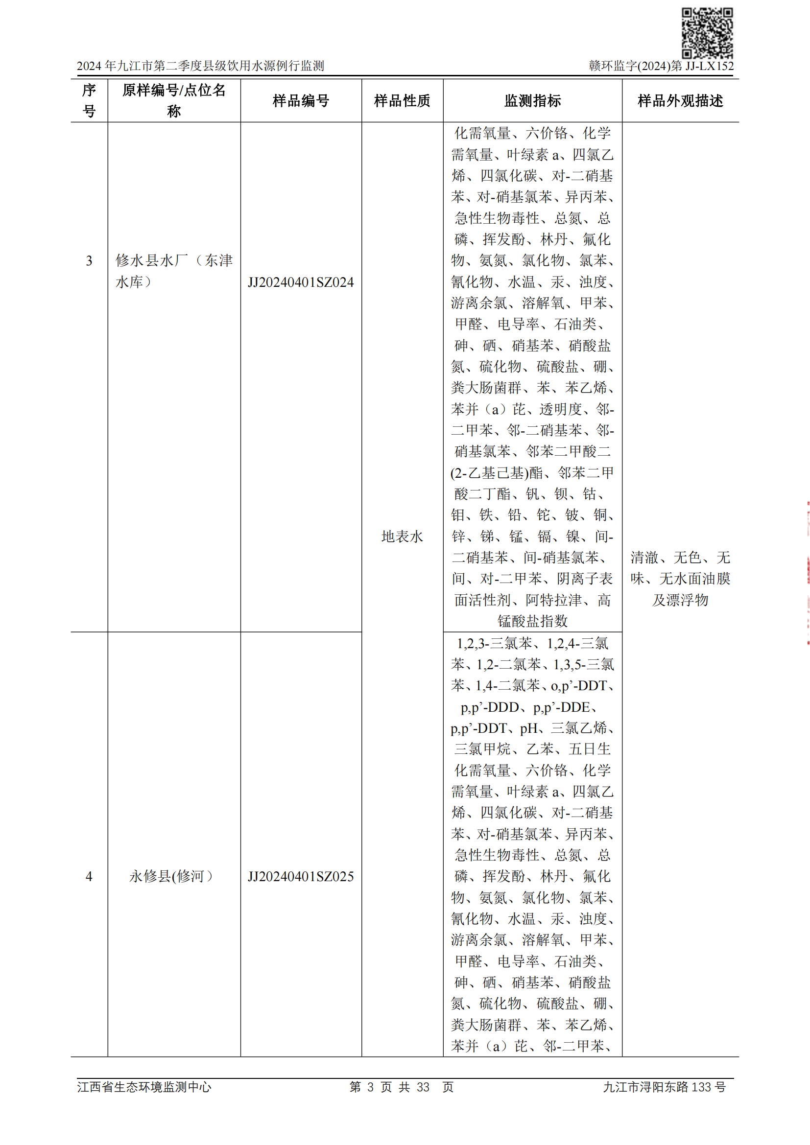 2024年九江市第二季度县级饮用水源例行监测监测报告