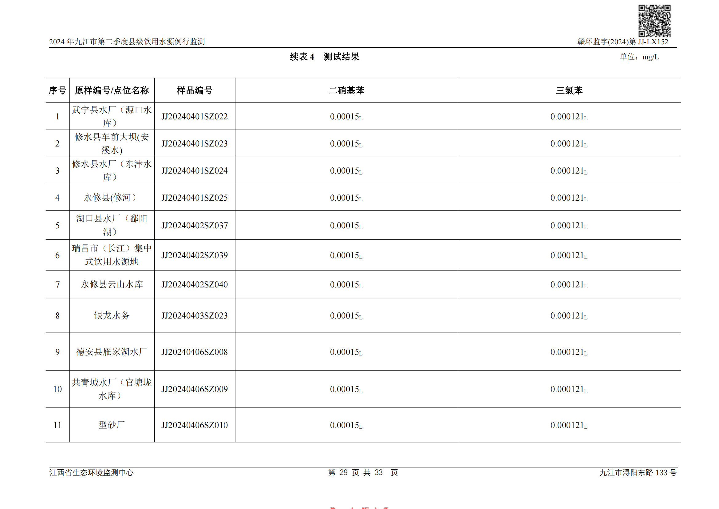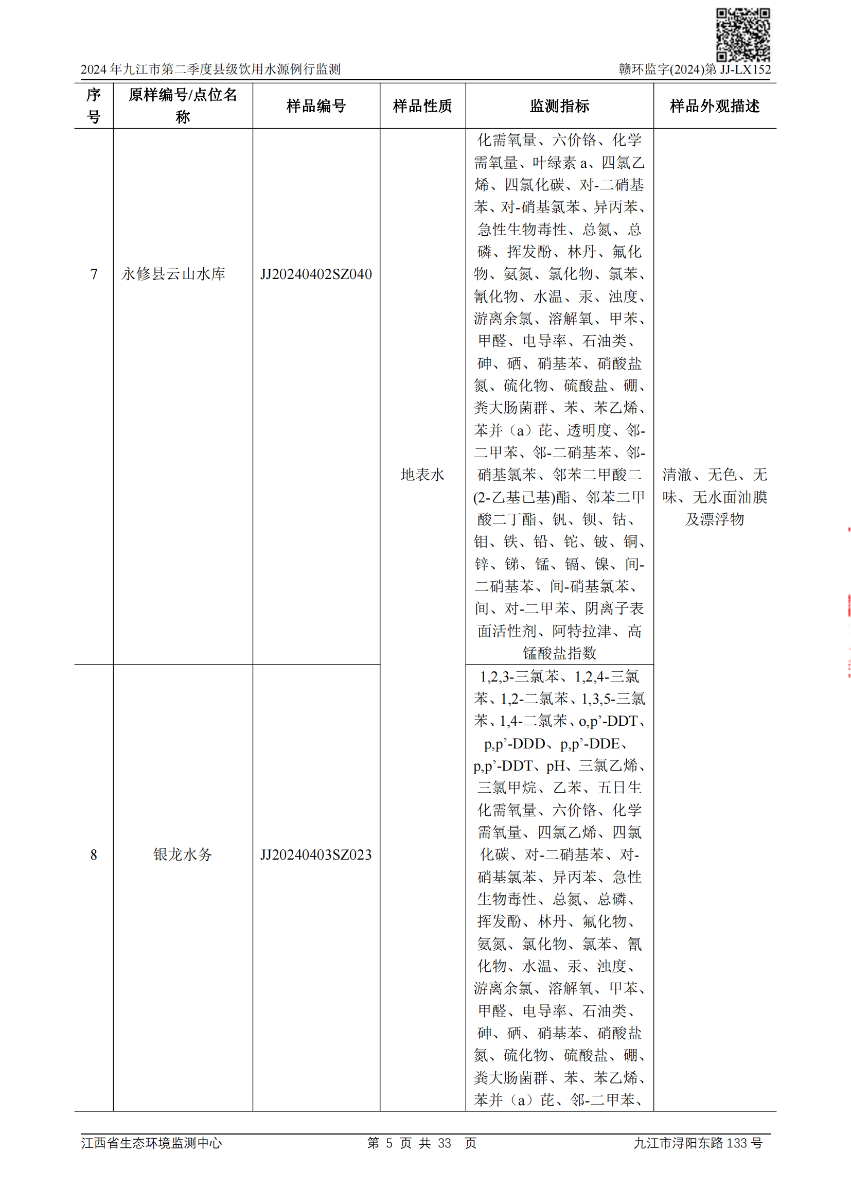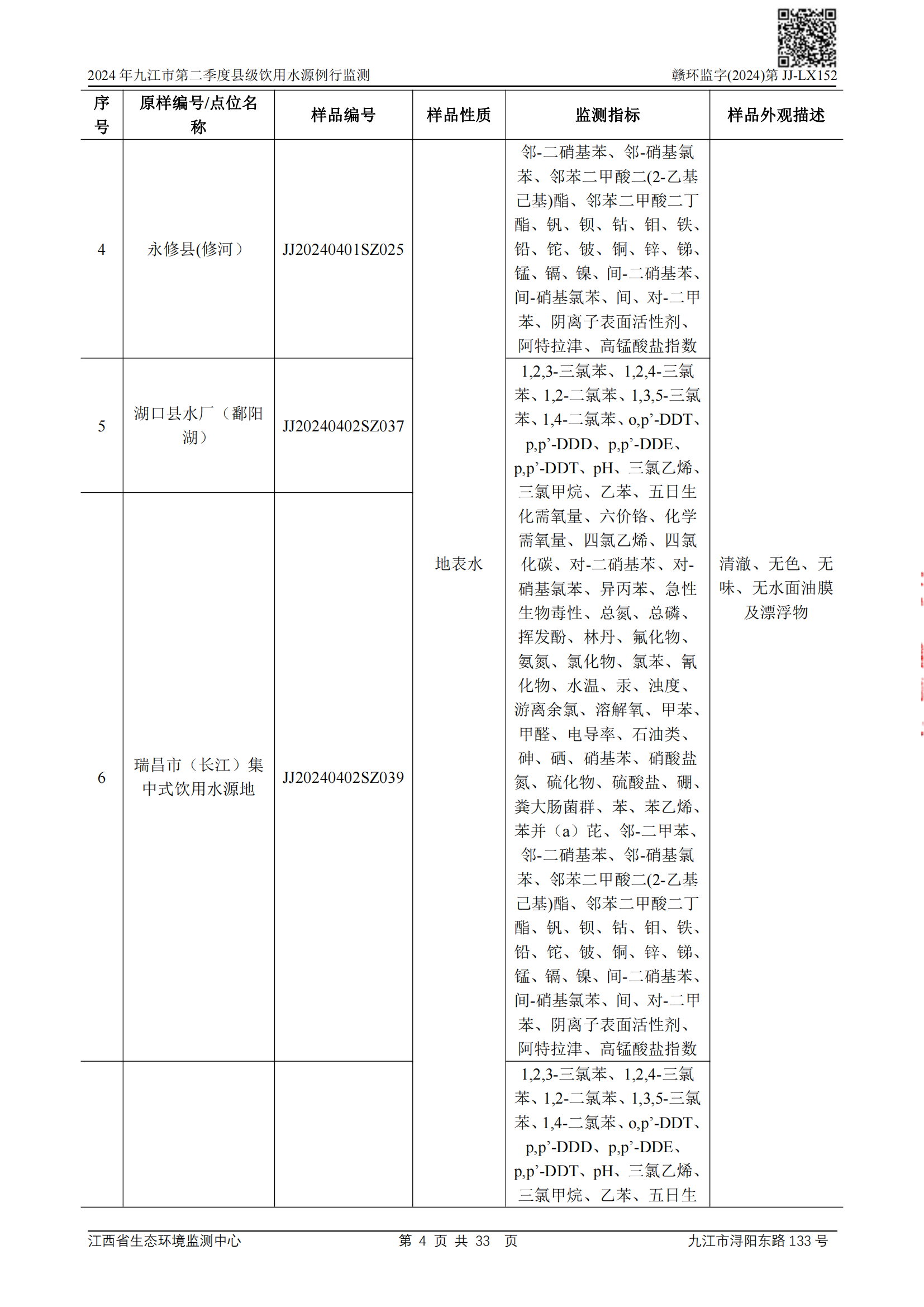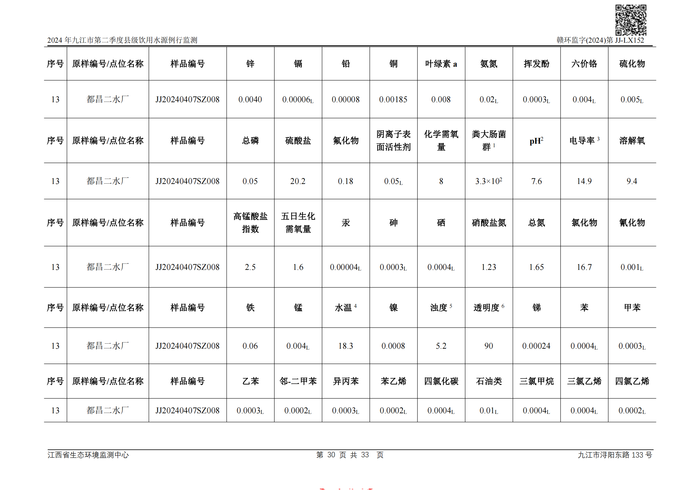 2024年九江市第二季度县级饮用水源例行监测监测报告