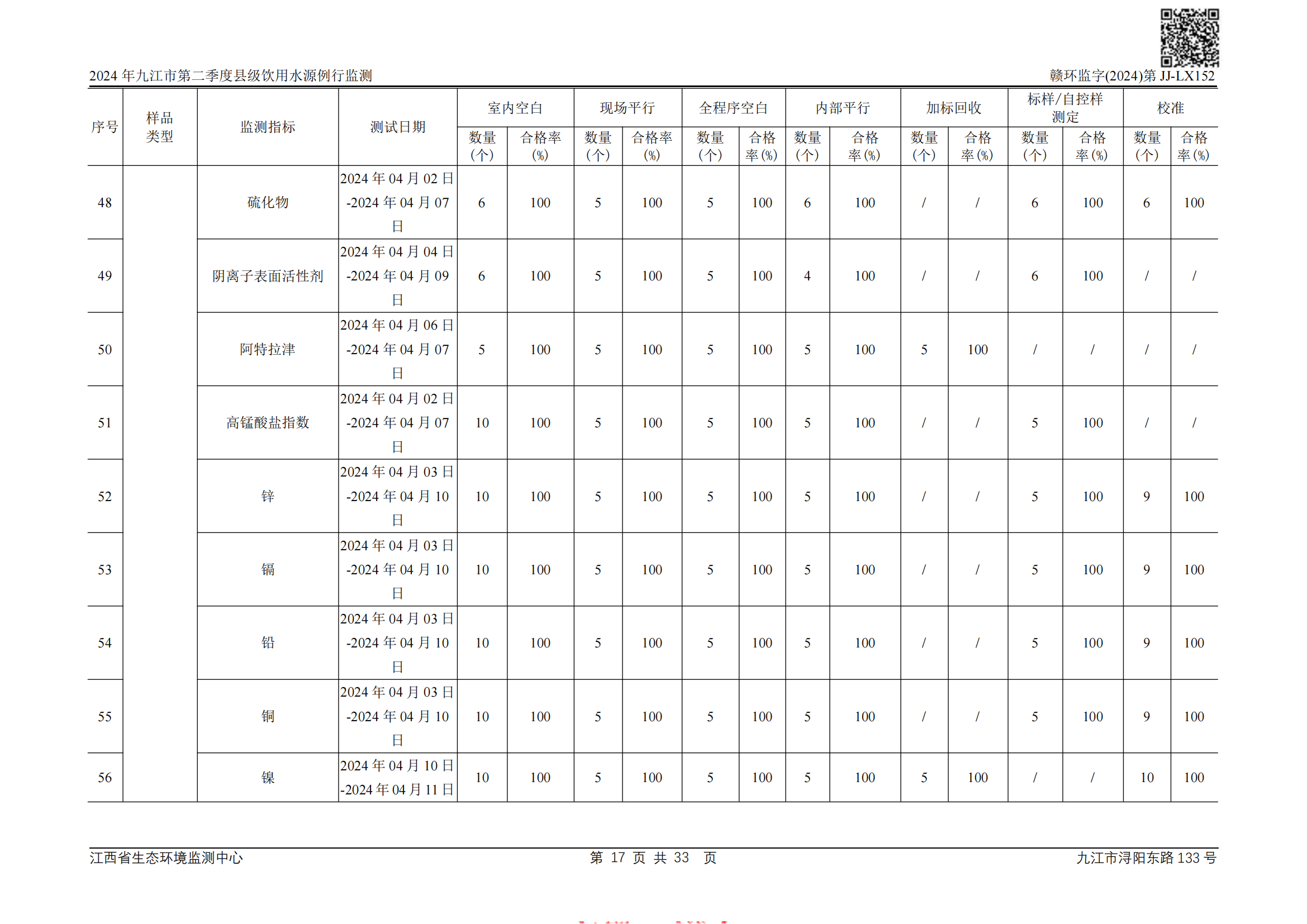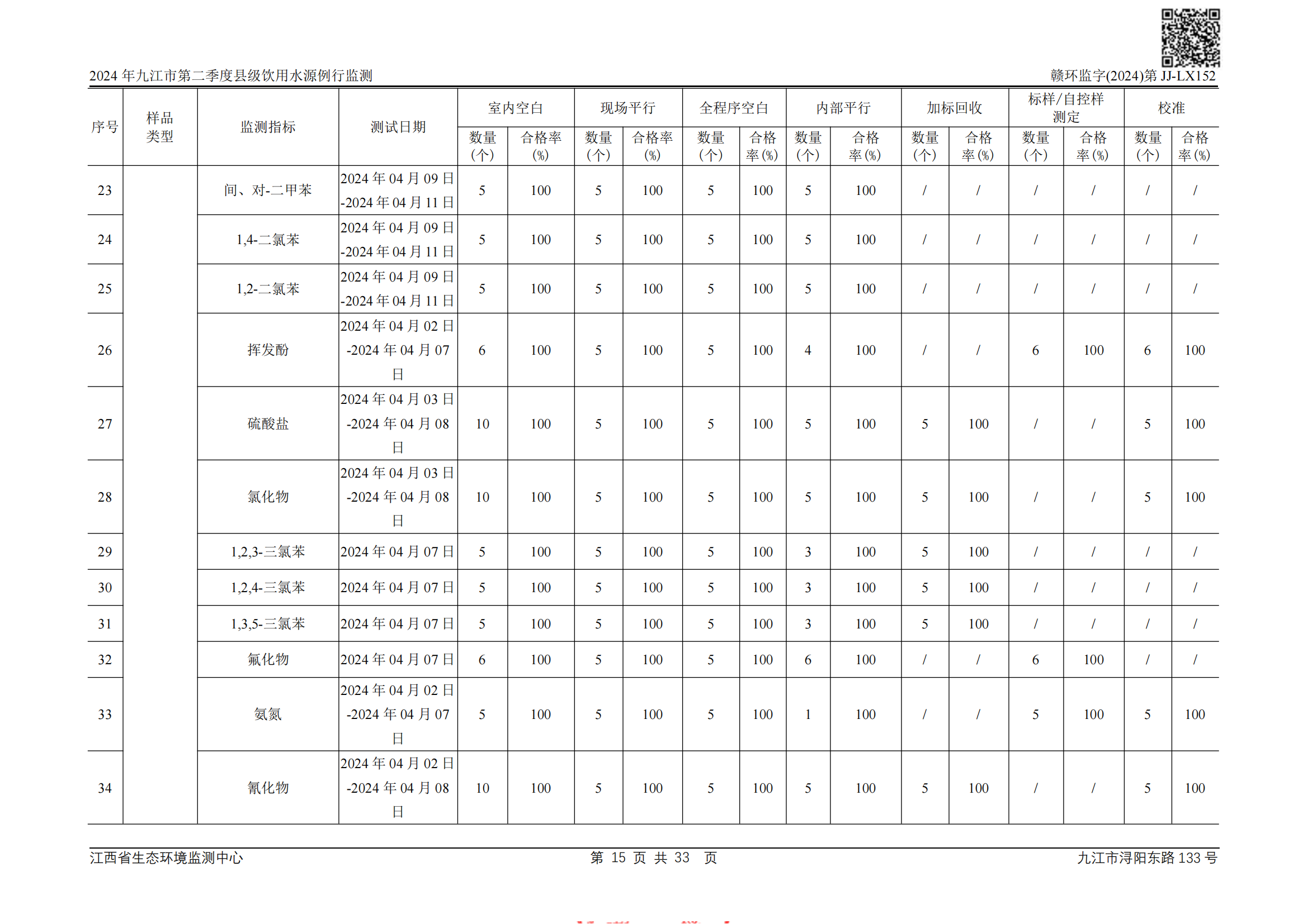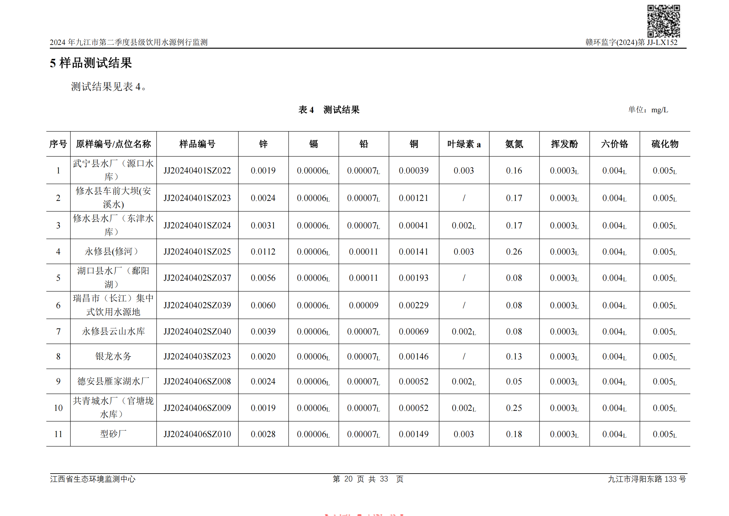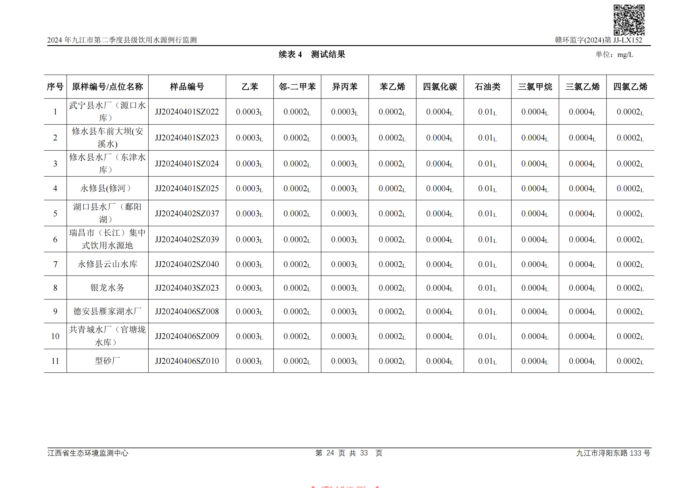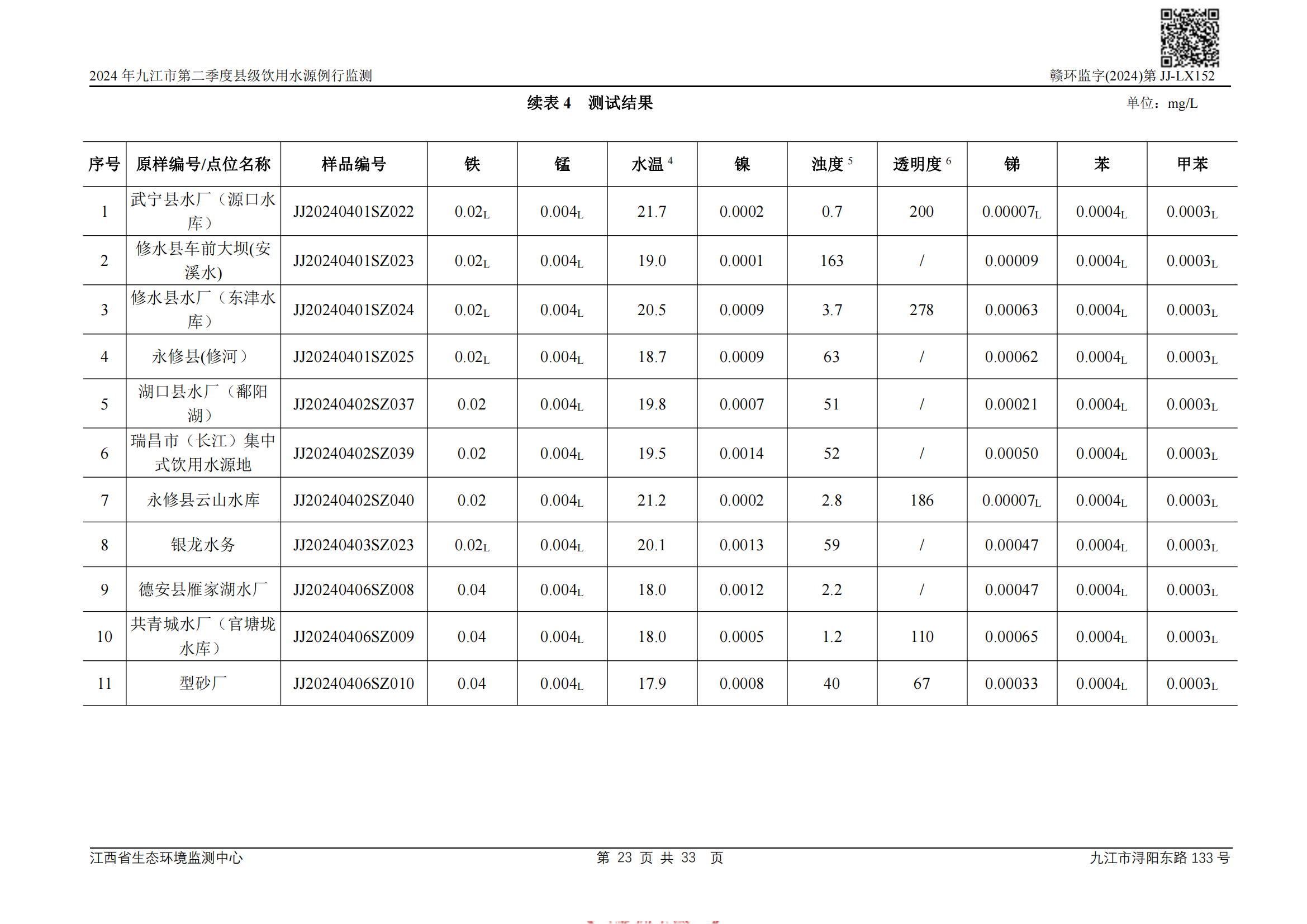2024年九江市第二季度县级饮用水源例行监测监测报告