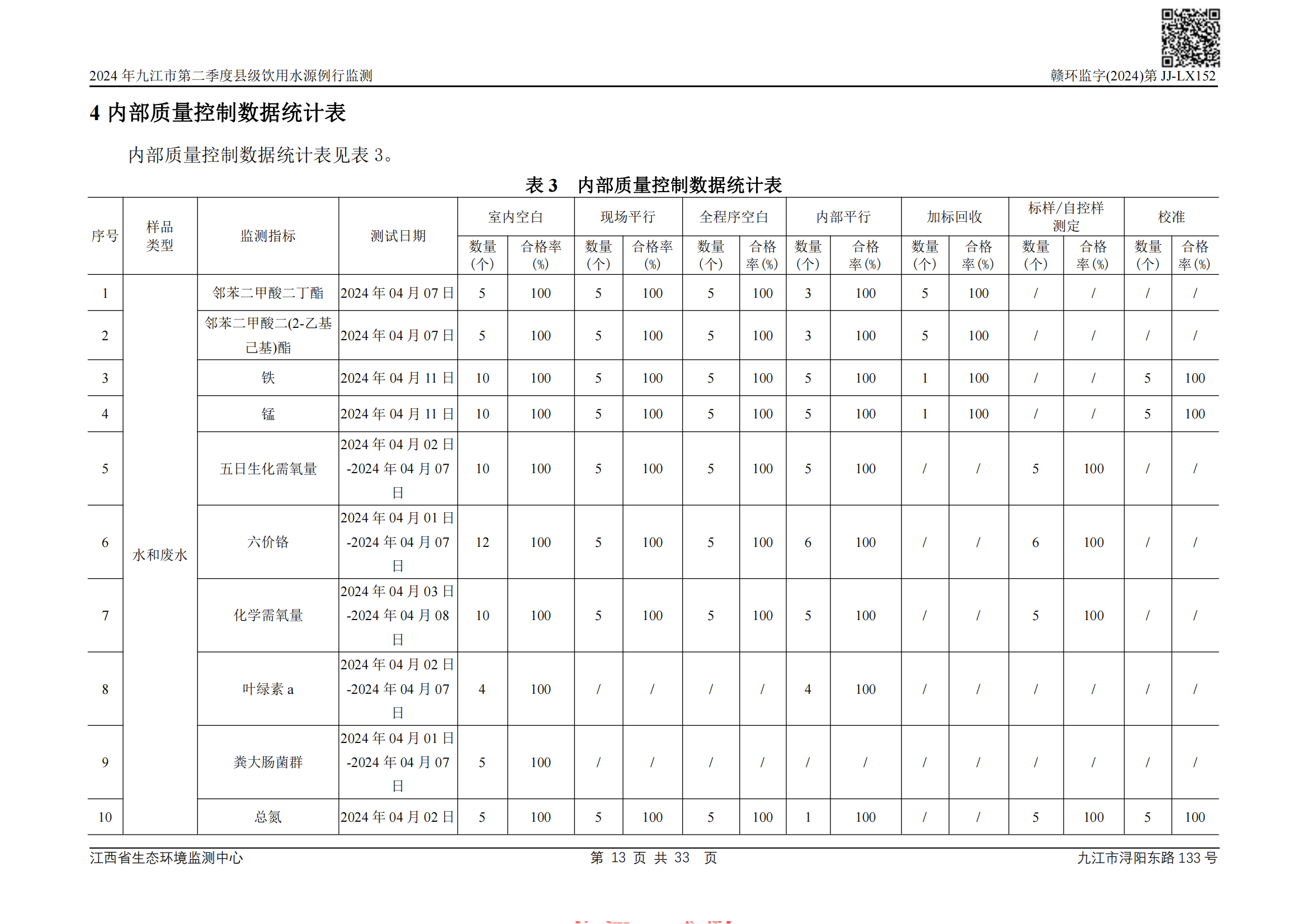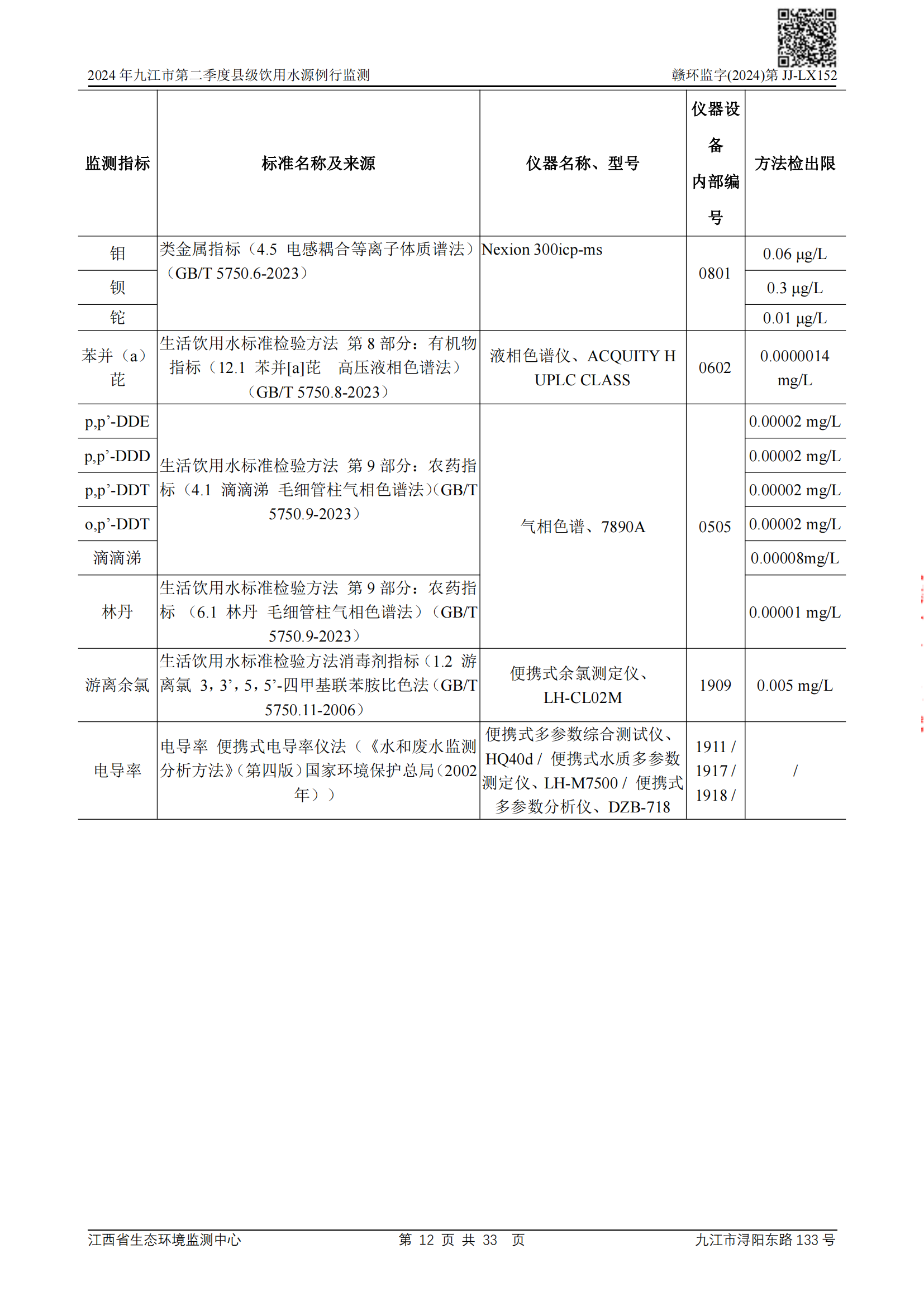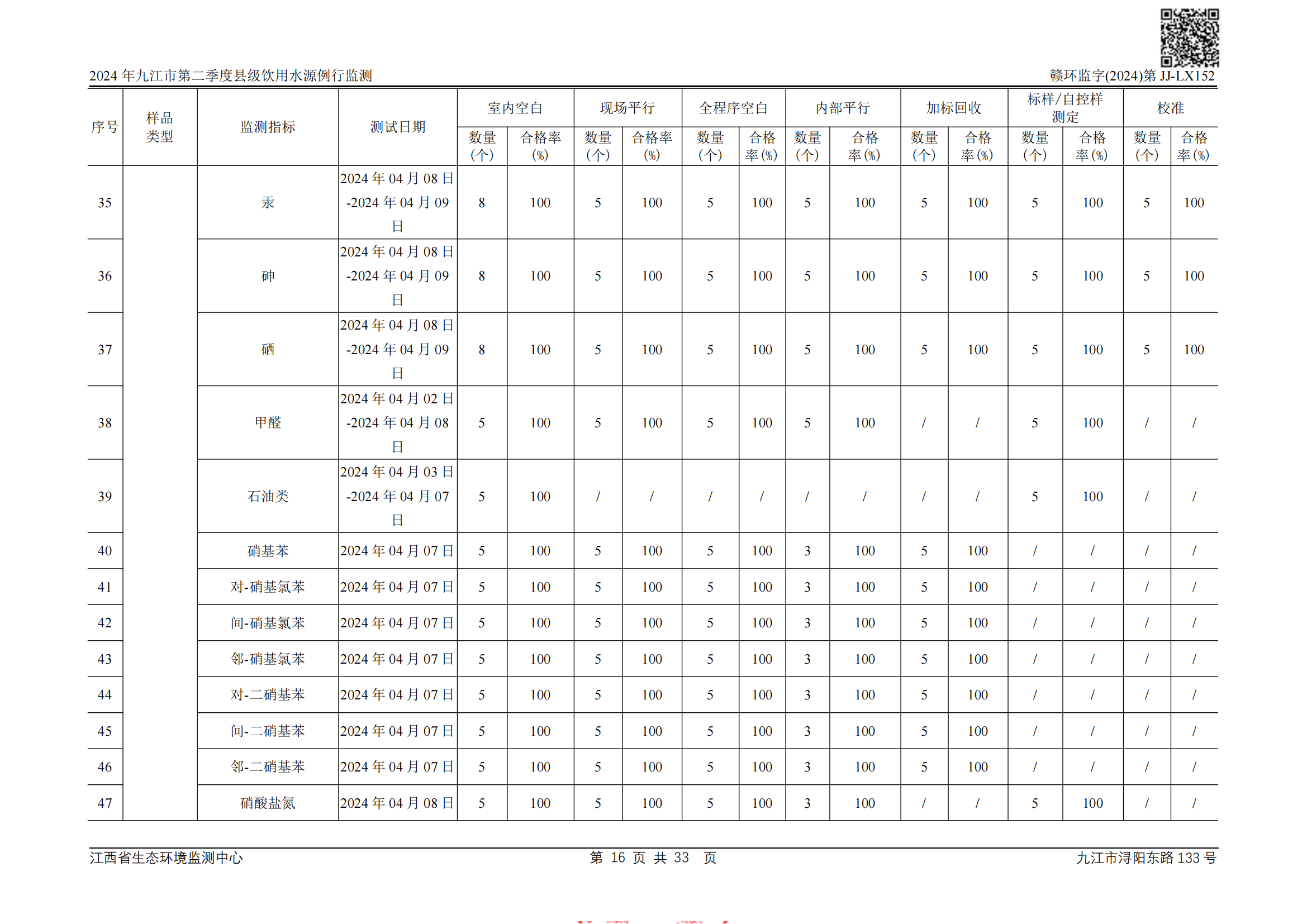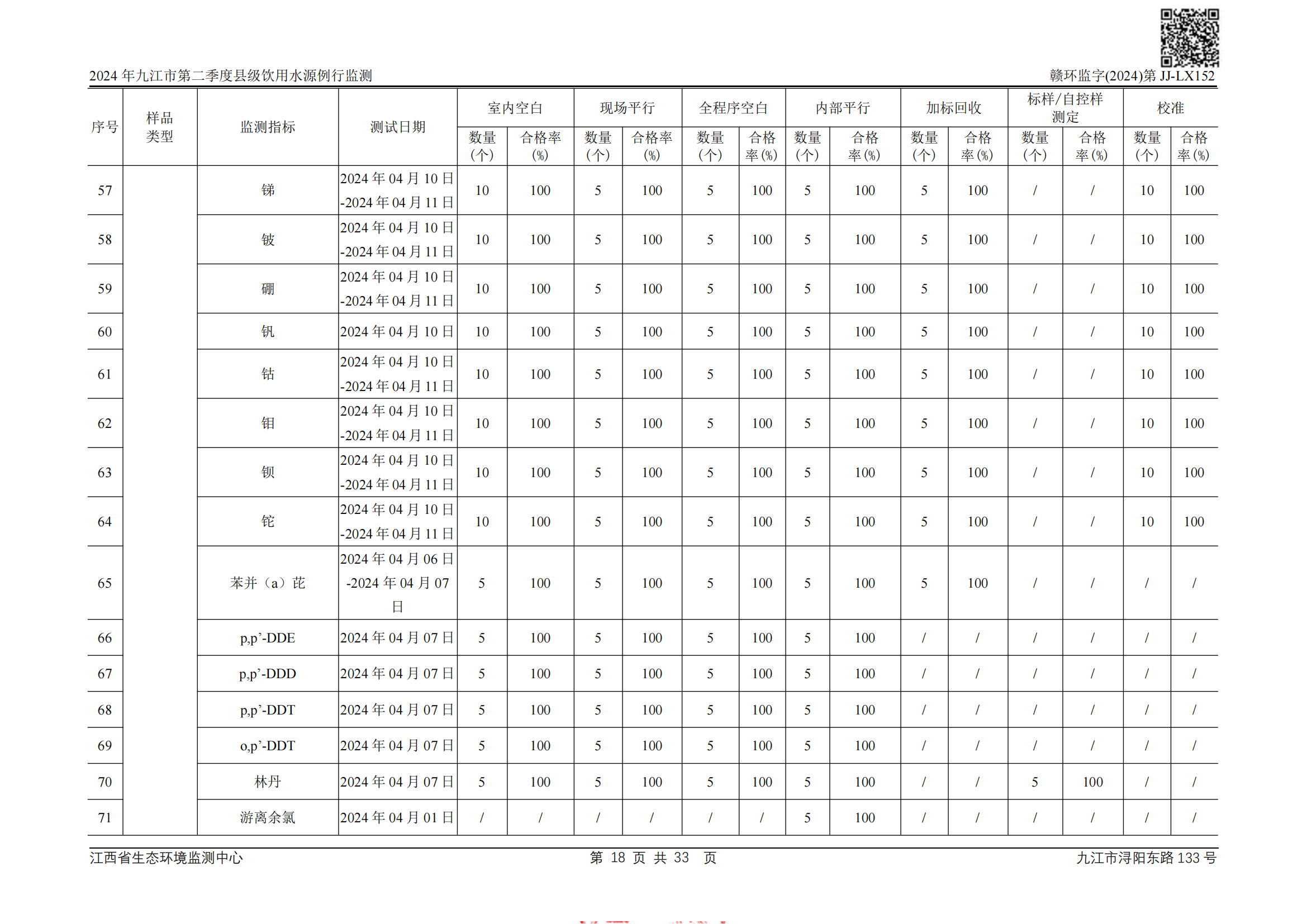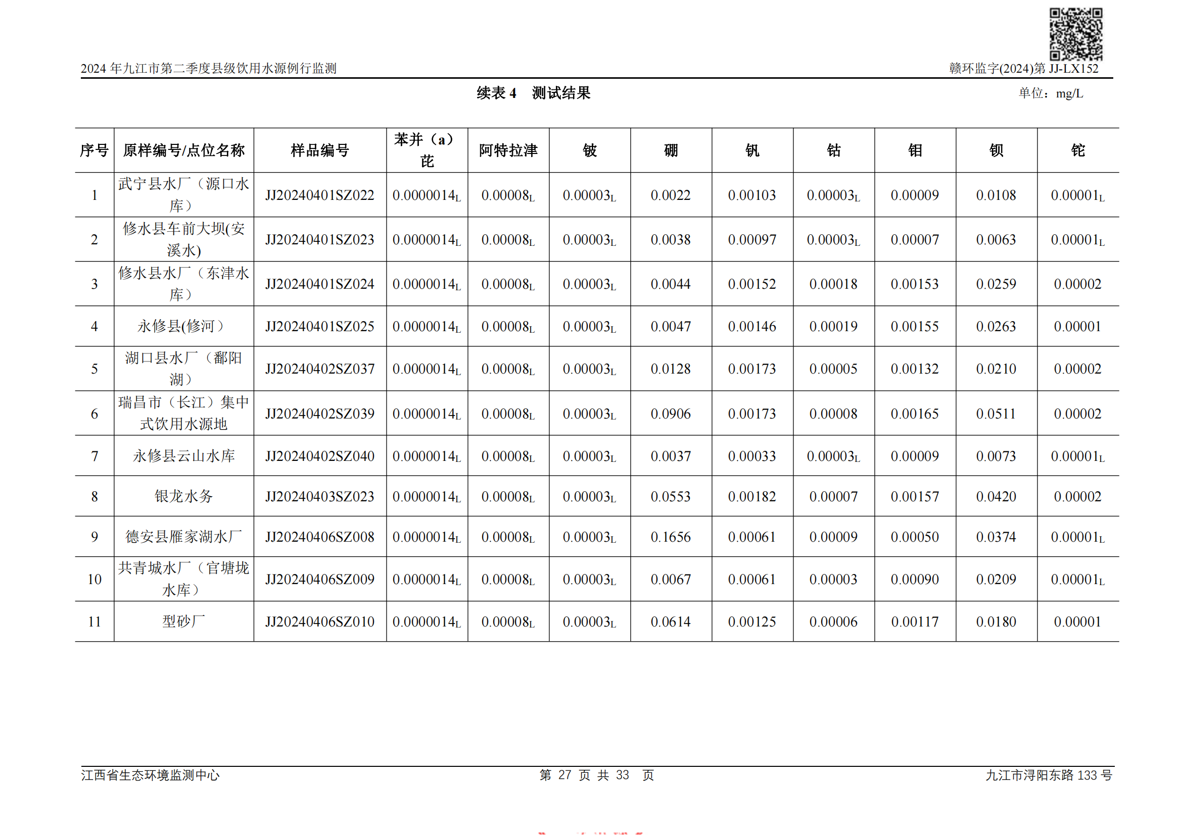 2024年九江市第二季度县级饮用水源例行监测监测报告