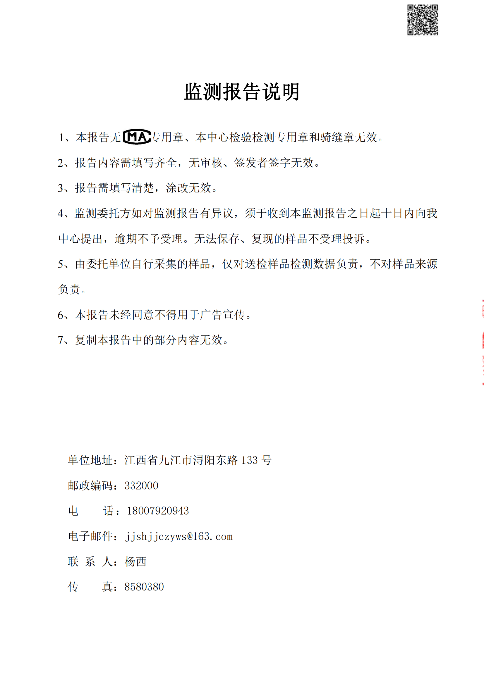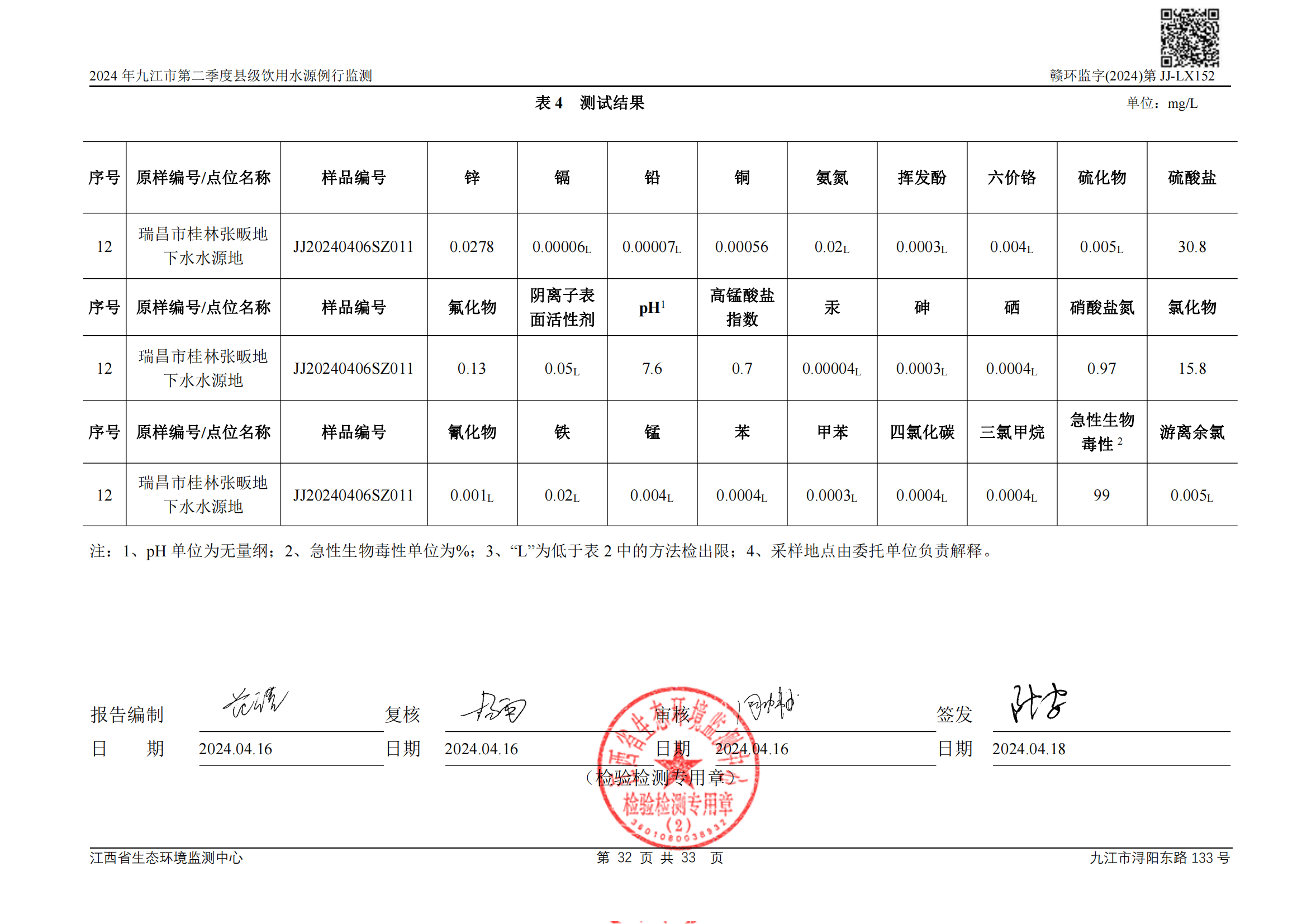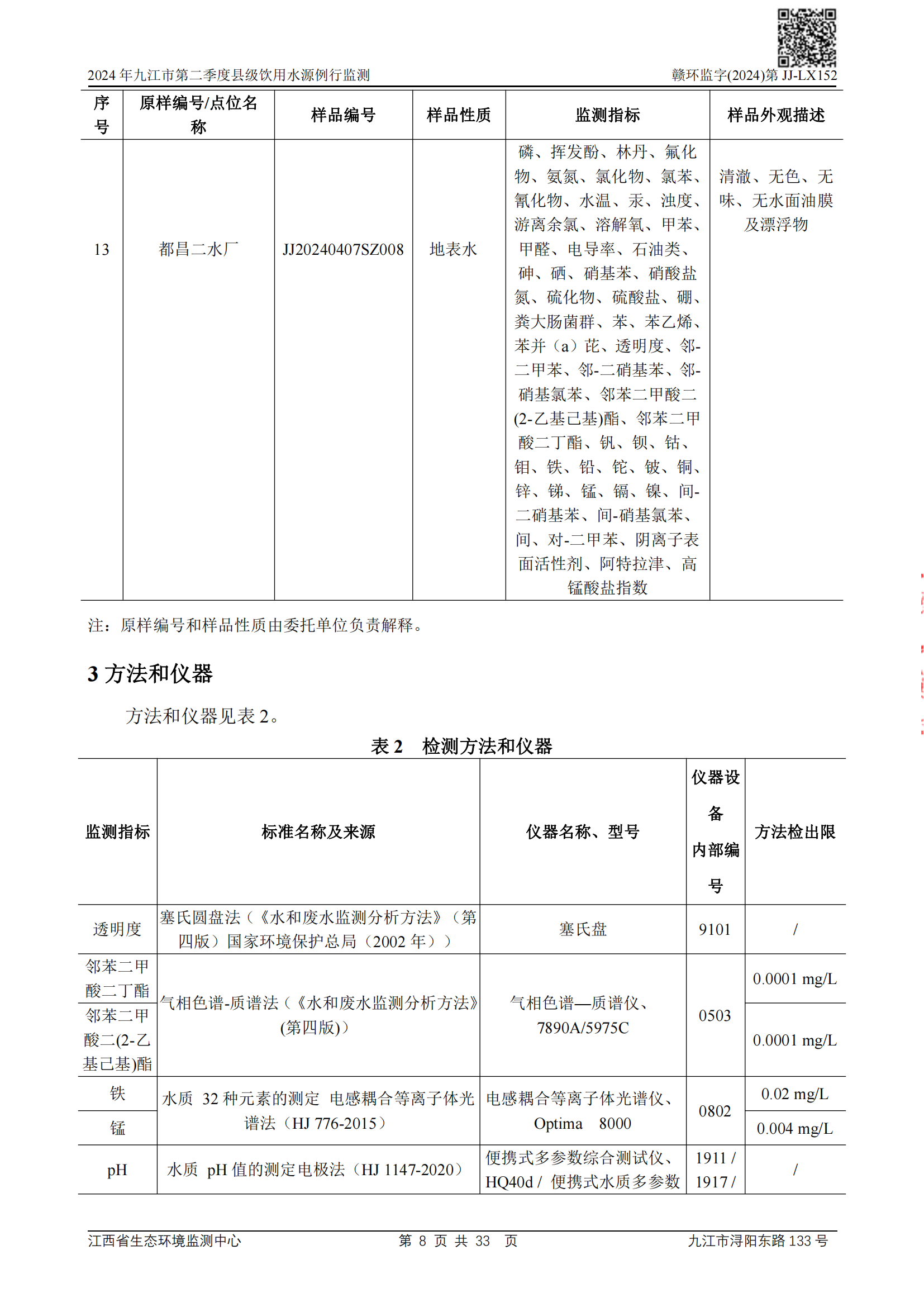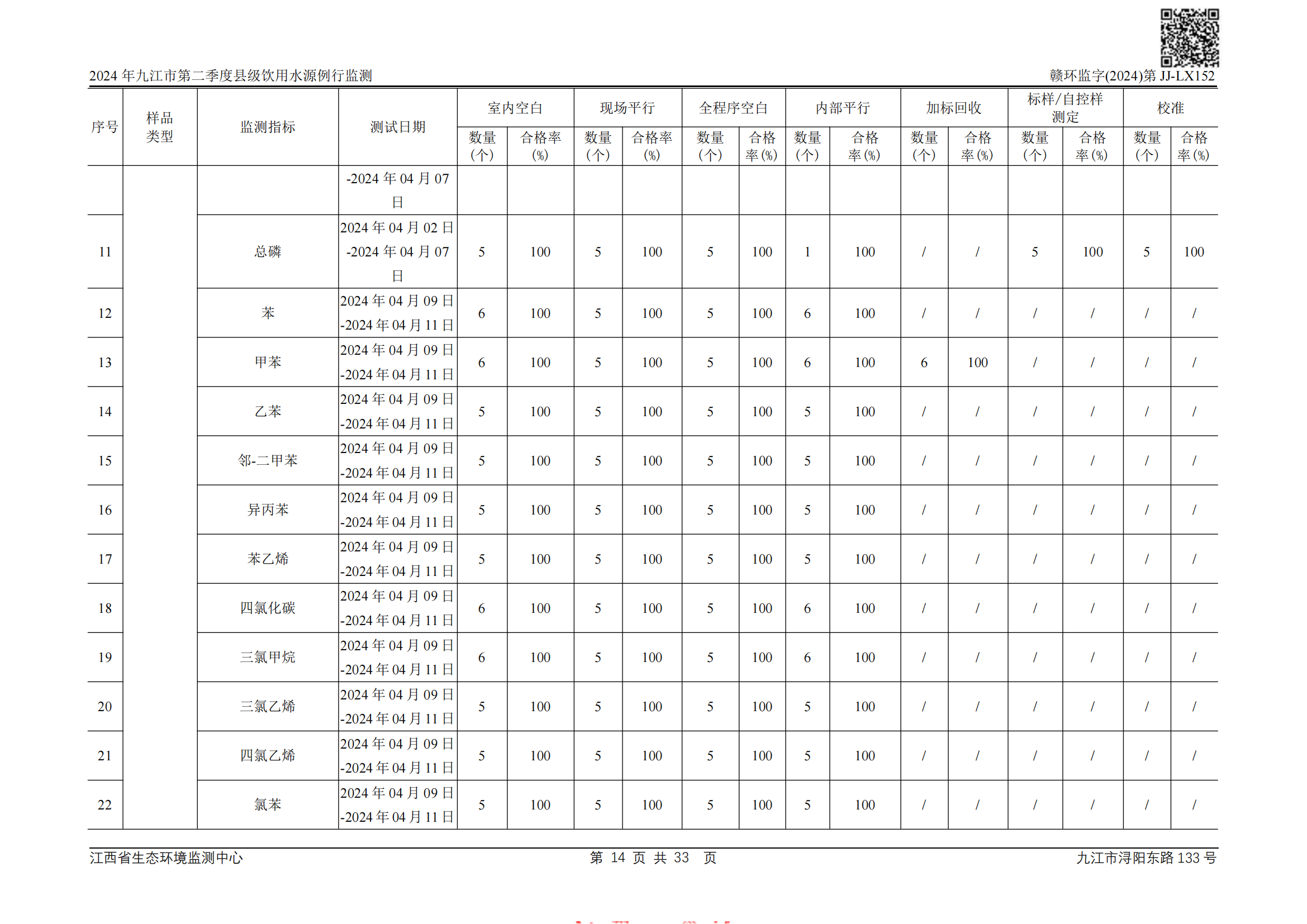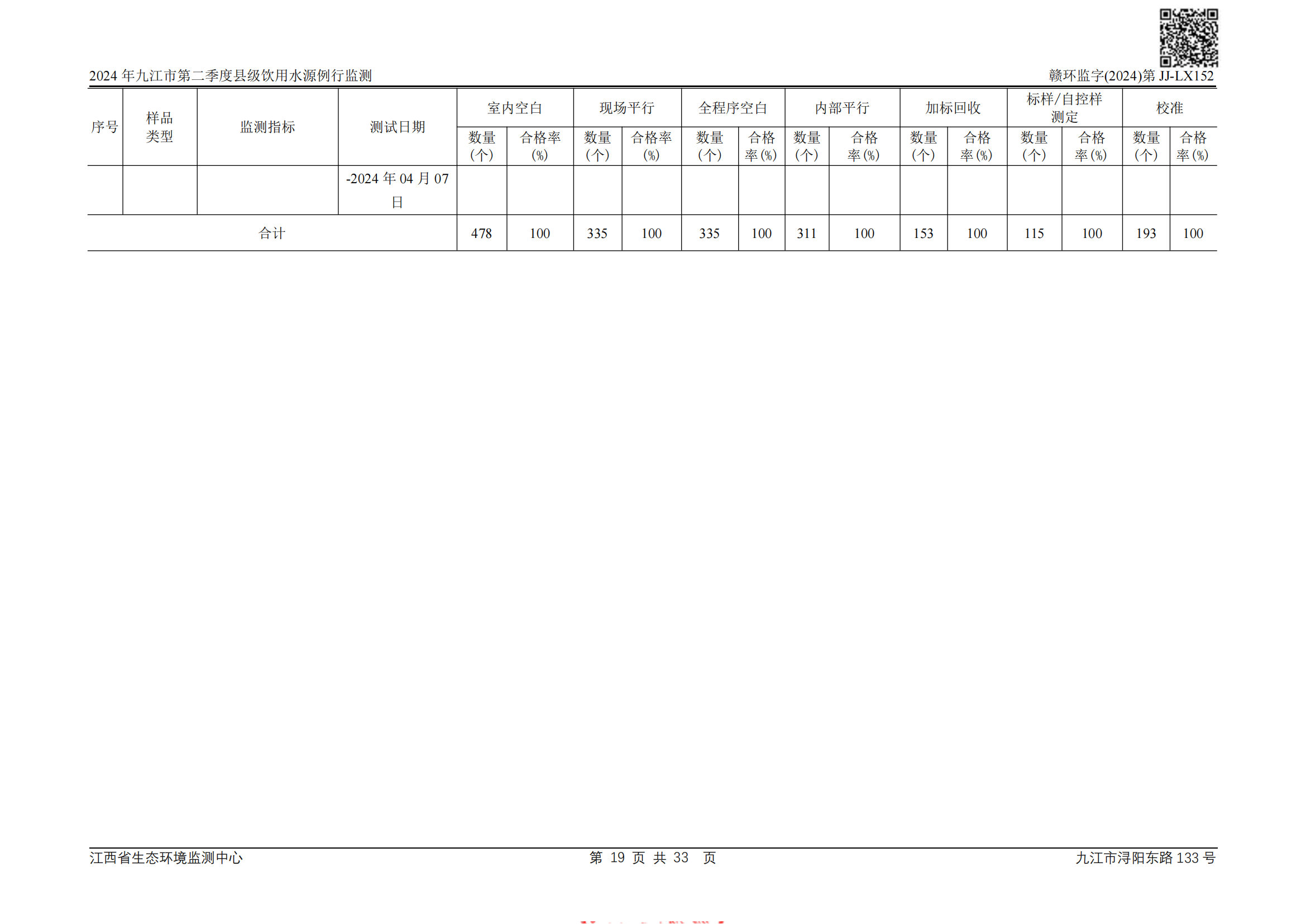 2024年九江市第二季度县级饮用水源例行监测监测报告