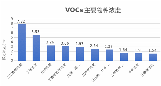 对VOCs走航监测到的物种均值进行分析,监测排名前十主要物种为二乙基苯浓度、丁烯浓度、戊烯浓度、甲基环己烷浓度、三甲苯浓度、正己烷、二甲基丁烷浓度、二甲基甲酰胺浓度、甲苯浓度、正辛烷浓度。