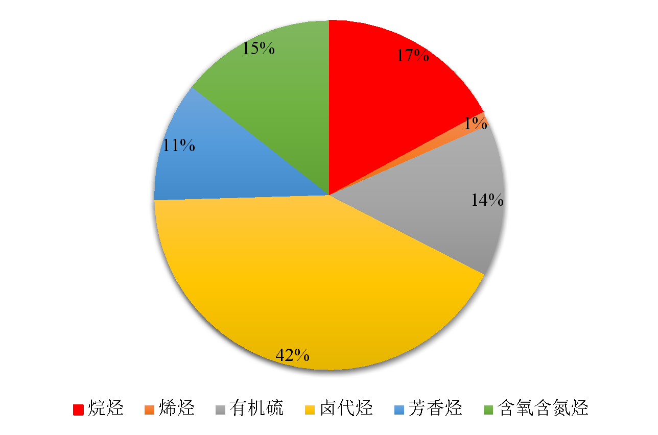此外,芳香烃类(占比11%)和有机硫化合物(占比14%)也存在一定比例,芳香烃如苯系物在长期接触下可能导致慢性中毒、致癌等健康问题;而有机硫化合物,如二硫化碳、丙硫醇等,则常见于农业及化学工业的排放,其臭味和刺激性较强,对呼吸系统和神经系统可能造成损害。
