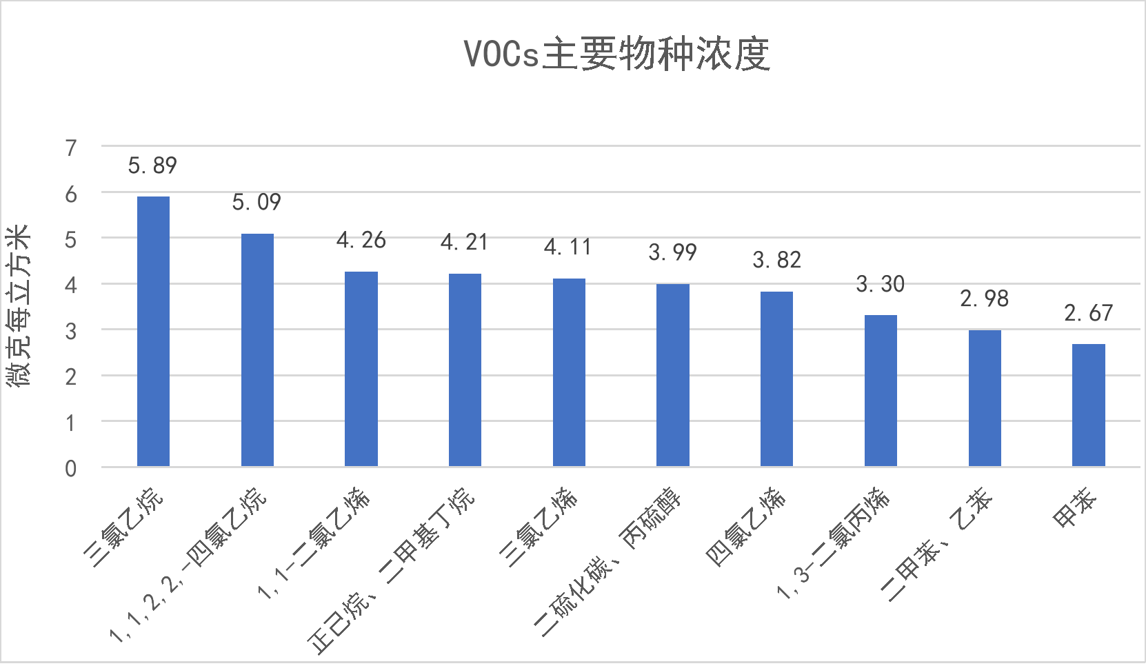 对VOCs走航监测到的物种均值进行分析,监测排名前十主要物种为三氯乙烷、1,1,2,2,-四氯乙烷、1,1-二氯乙烯、正己烷、二甲基丁烷、三氯乙烯、二硫化碳、丙硫醇、四氯乙烯、1,3-二氯丙烯、二甲苯、乙苯、甲苯。