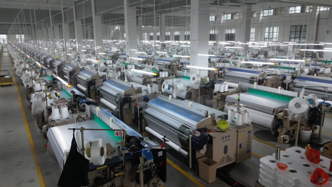 江西恒洲纺织有限公司2024年新建的7栋厂房已基本完工,并达到竣工验收条件。在车间里,1500台织布机高速运转,一条条丝线交织成形,几名工人正在现场监控和维护。