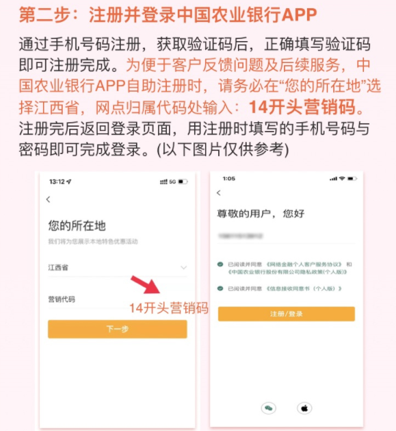 为便于客户反馈问题及后续服务,中国农业银行APP自助注册时,请在所在地选江西,输入代码14开头的营销码。