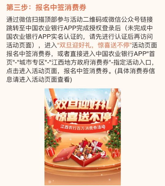 微信扫码活动二维码进入活动页面,或者直接进入农行掌银APP“首页”-“城市专区”-“江西地方政府消费券”-“江西农行百万消费券活动”,进入活动页面,先报名参与中签消费券活动。