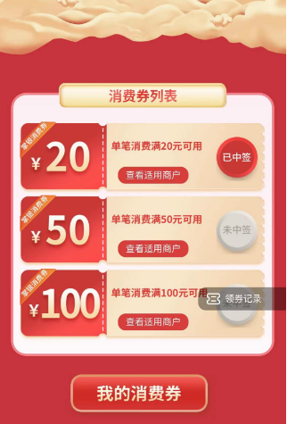 4、奖品分20元消费券、50元消费券和100元消费券三种,中签客户可到指定商户出示中签消费券二维码进行抵扣现金使用,指定商户可在活动页面查看消费券适用商户。