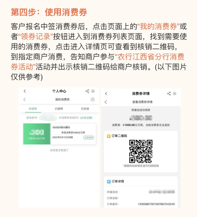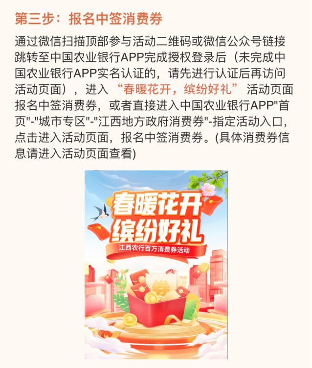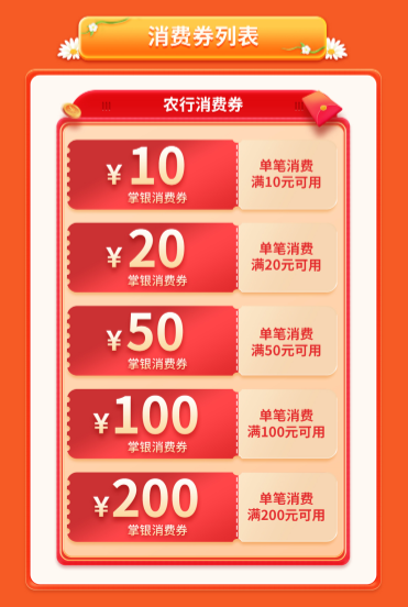 5、消费券使用规则:消费券为江西农行掌银消费券,即中即用,消费满10元即可使用一张10元消费券,消费满20元即可使用一张20元消费券,消费满50元即可使用一张50元消费券,消费满100元即可使用一张100元消费券,消费满200元即可使用一张200元消费券。