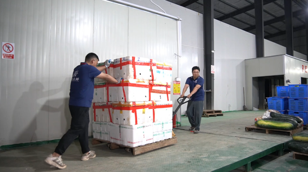 在精立生鲜负18摄氏度恒温冷库,可以看到,不同农产品经过包装后统一打托,码放得整整齐齐。客户想采购只需通过微信小程序选购下单,经公司后台入库、分拣等操作后,专业的配送团队即可送货上门。