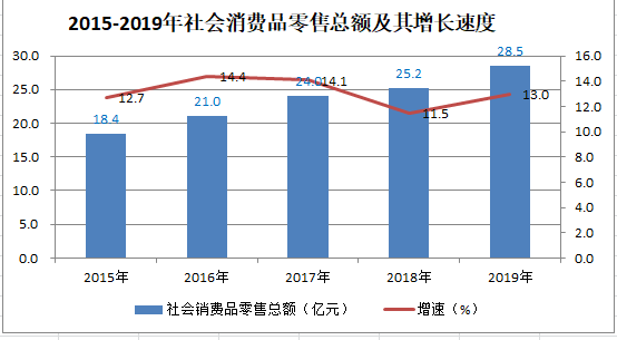 全年全县实现社会消费品零售总额28.5亿元,比上年增长13.0%,其中限额以上企业(单位)实现消费品零售额11.7亿元,比上年增长23.3%。