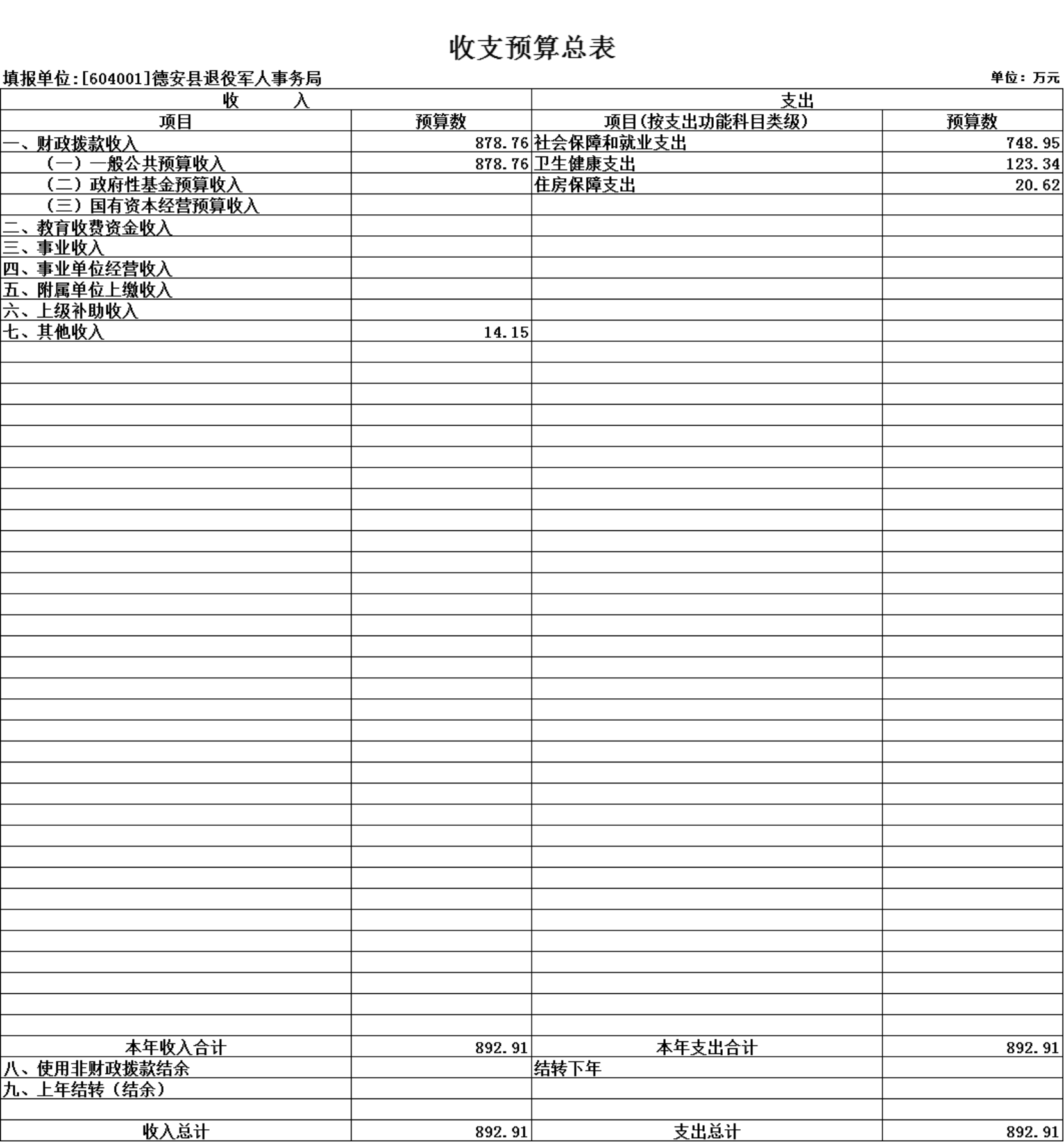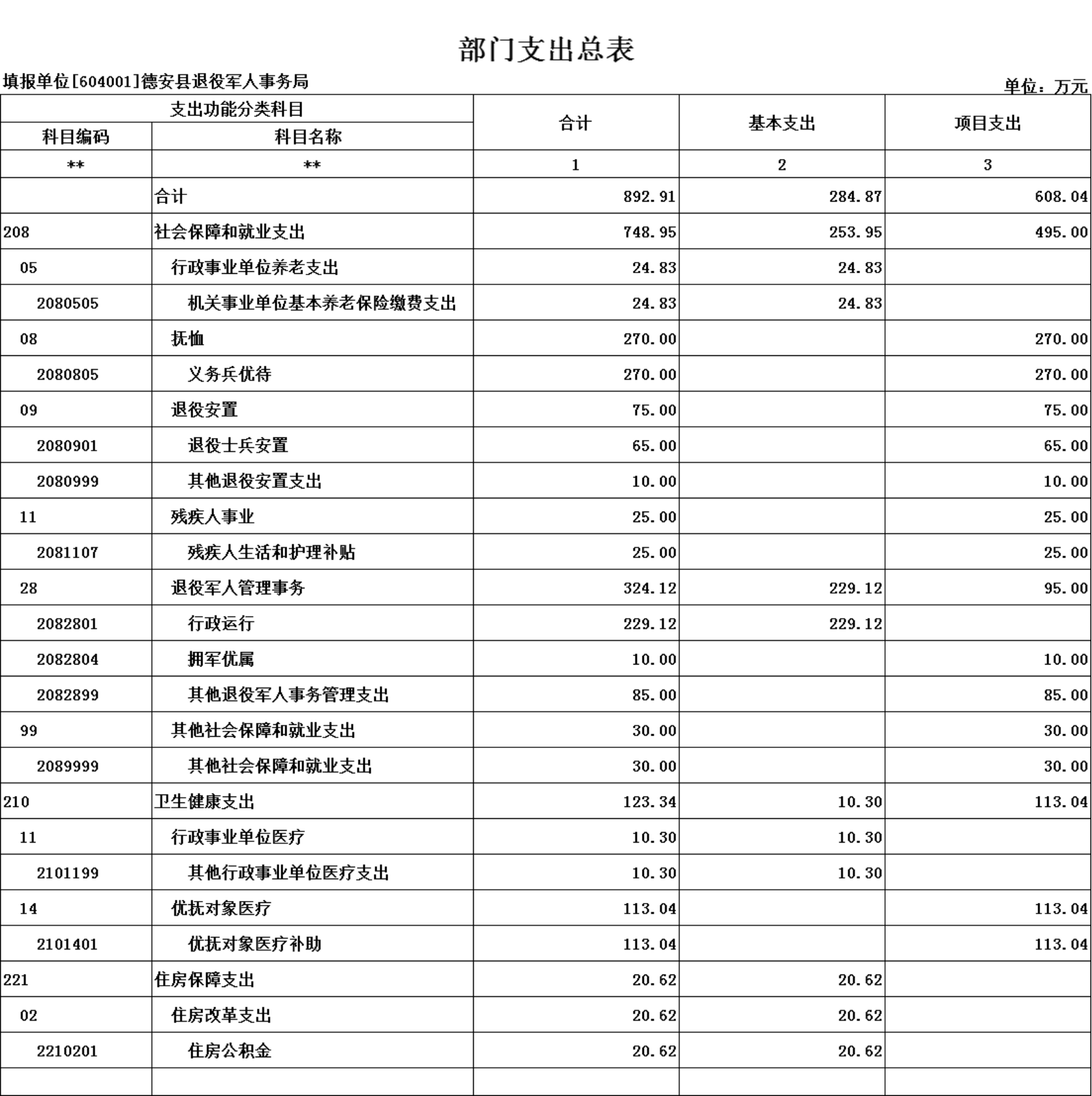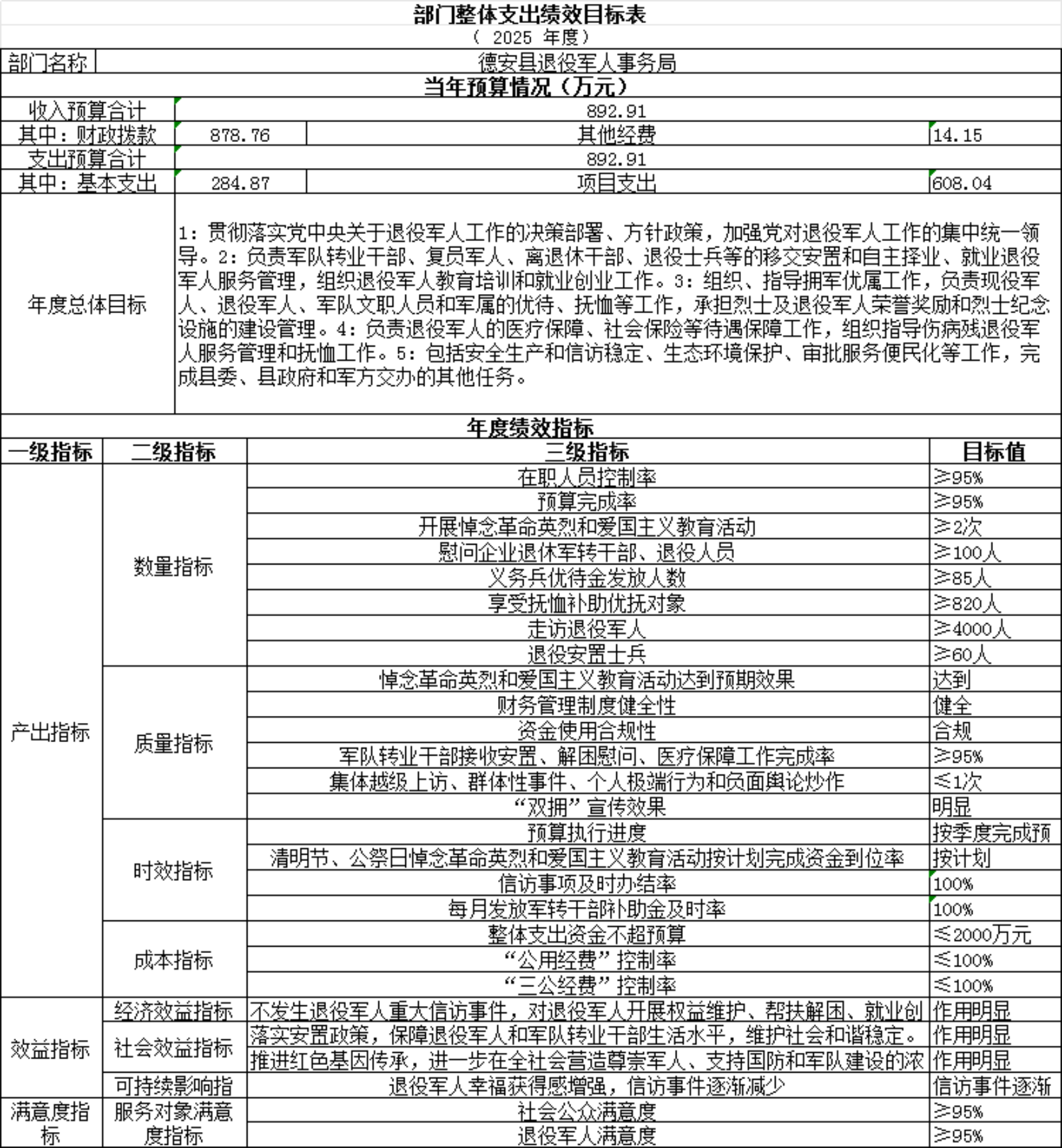 2025年德安县退役军人事务局支出预算总额为892.91万元,较上年预算安排增加81.39万元;其中: