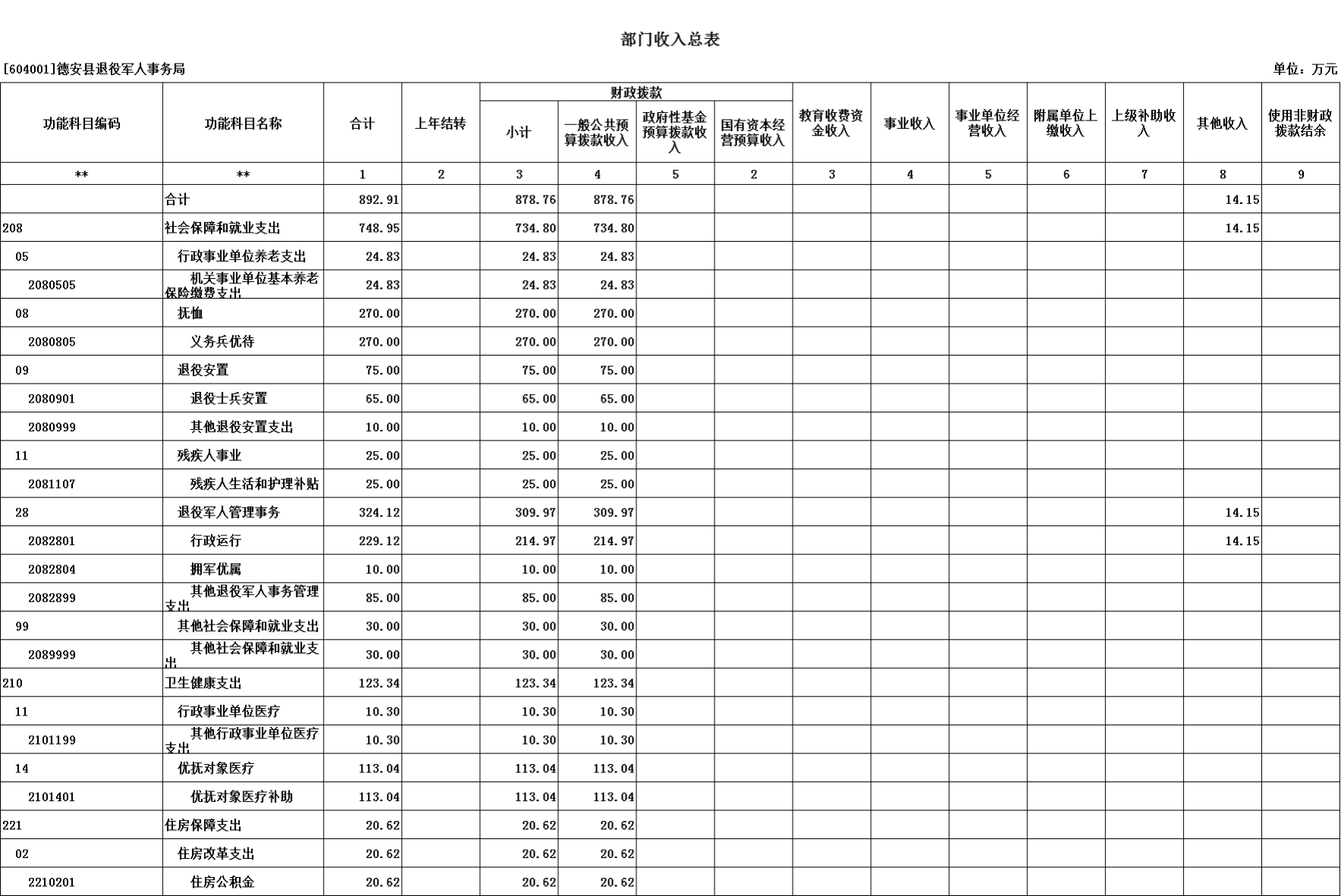 2025年德安县退役军人事务局收入预算总额为892.91万元,较上年预算安排增加81.39万元;财政拨款收入878.76万元,较上年预算安排增加76.2万元;教育收费资金收入0万元,较上年预算安排增加0万元;事业单位经营收入0万元,较上年预算安排增加0万元;国库集中支付网上结转0万元,较上年预算安排增加0万元。