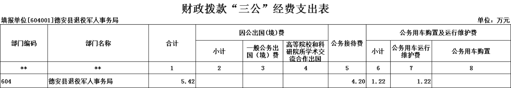 2025年德安县退役军人事务局"三公"经费财政拨款安排5.42万元,其中: 因公出国(境)费0万元,与上年保持一致,主要原因是无因公出国事项。公务接待费4.2万元,比上年减少0.6万元,主要原因是:节省开支;公务用车运行维护费1.22万元,比上年减少0.28万元,主要原因是:节省开支;公车购置费0万元,比上年增加0万元,主要原因是:未安排购置公务用车。