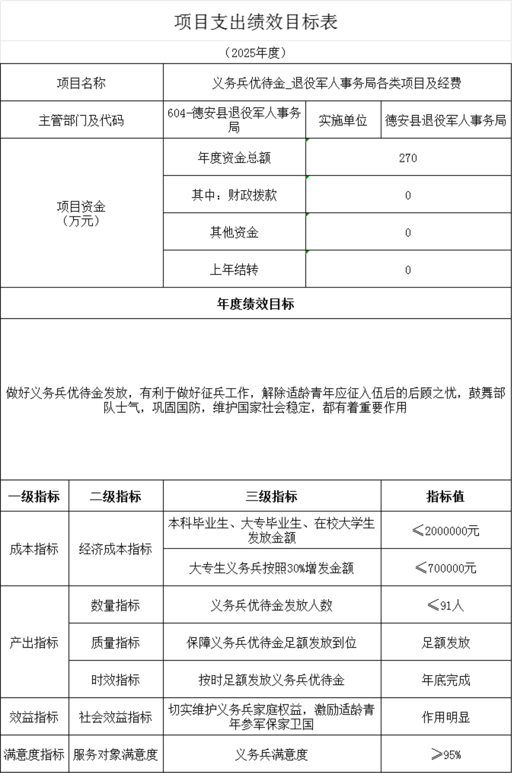 社会效益指标:切实维护义务兵家庭权益,激励适龄青年参军保家卫国。