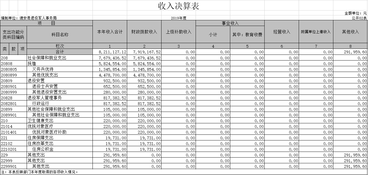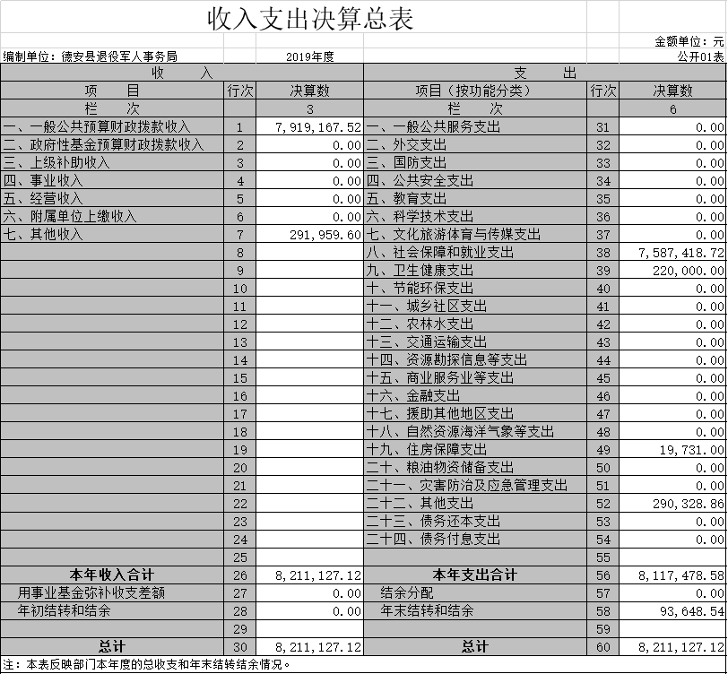 本部门2019年度收入总计821.1万元,其中年初结转和结余0万元,由于德安县退役军人事务局2019年1月成立,无法与上年做对比;本年收入合计821.1万元,由于德安县退役军人事务局2019年1月成立,无法与上年做对比.
