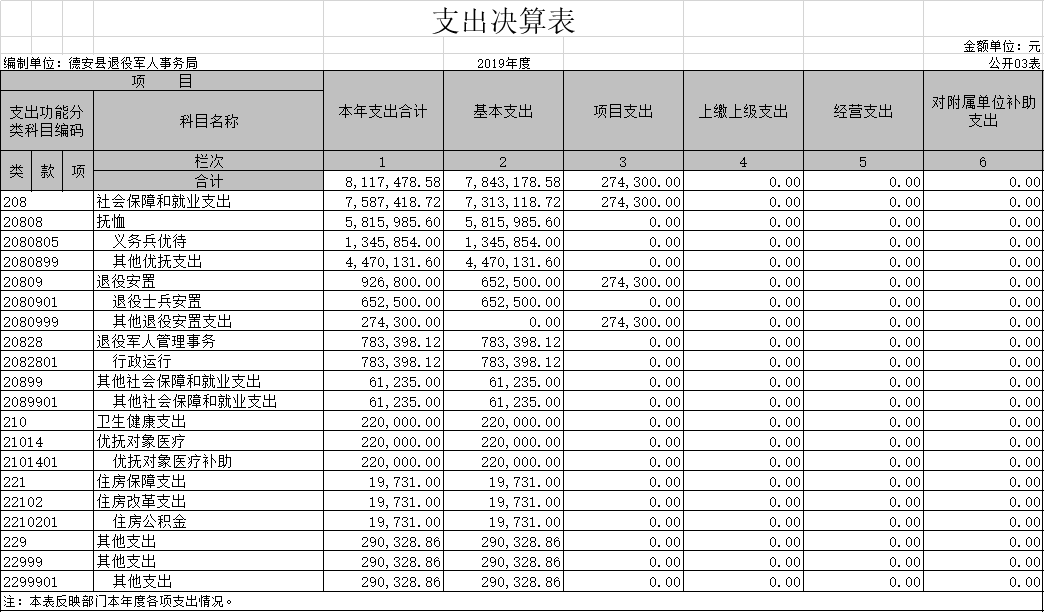 本部门2019年度支出总计821.1万元,其中本年支出合计 811.74万元,由于德安县退役军人事务局2019年1月成立,无法与上年做对比;年末结转和结余9.36万元,由于德安县退役军人事务局2019年1月成立,无法与上年做对比。
