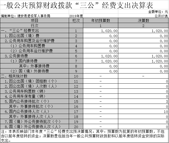 (三)公务用车购置及运行维护费支出0万元,由于德安县退役军人事务局2019年1月成立,无法与上年做对比.