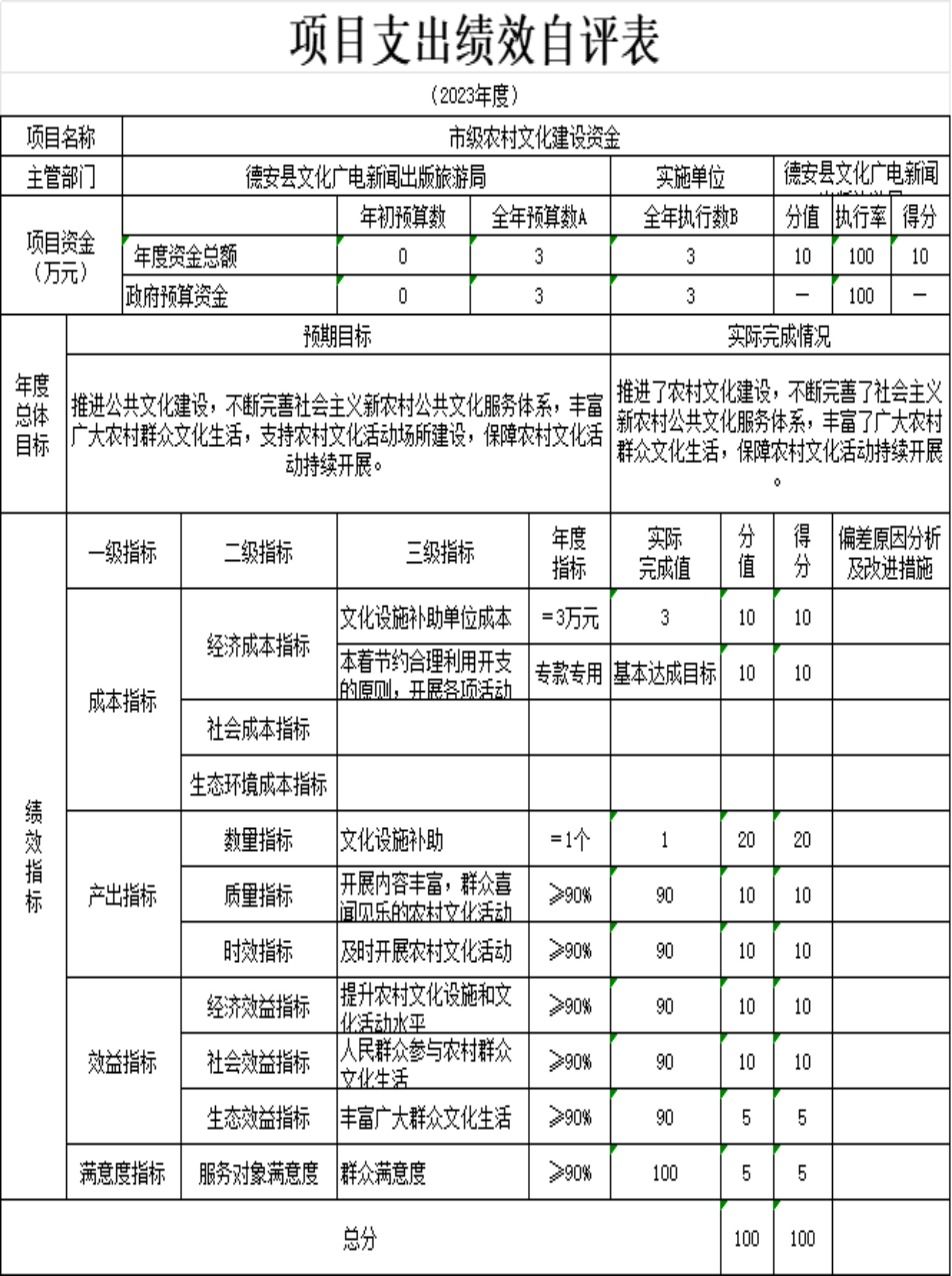 2德安县文旅局农村文化建设资金管理规范,项目管理到位,对全县的行政事业单位的审计监督起到了促进作用,发挥了财政资金的作用,绩效评价分数100分,绩效评价结果为“优”。
