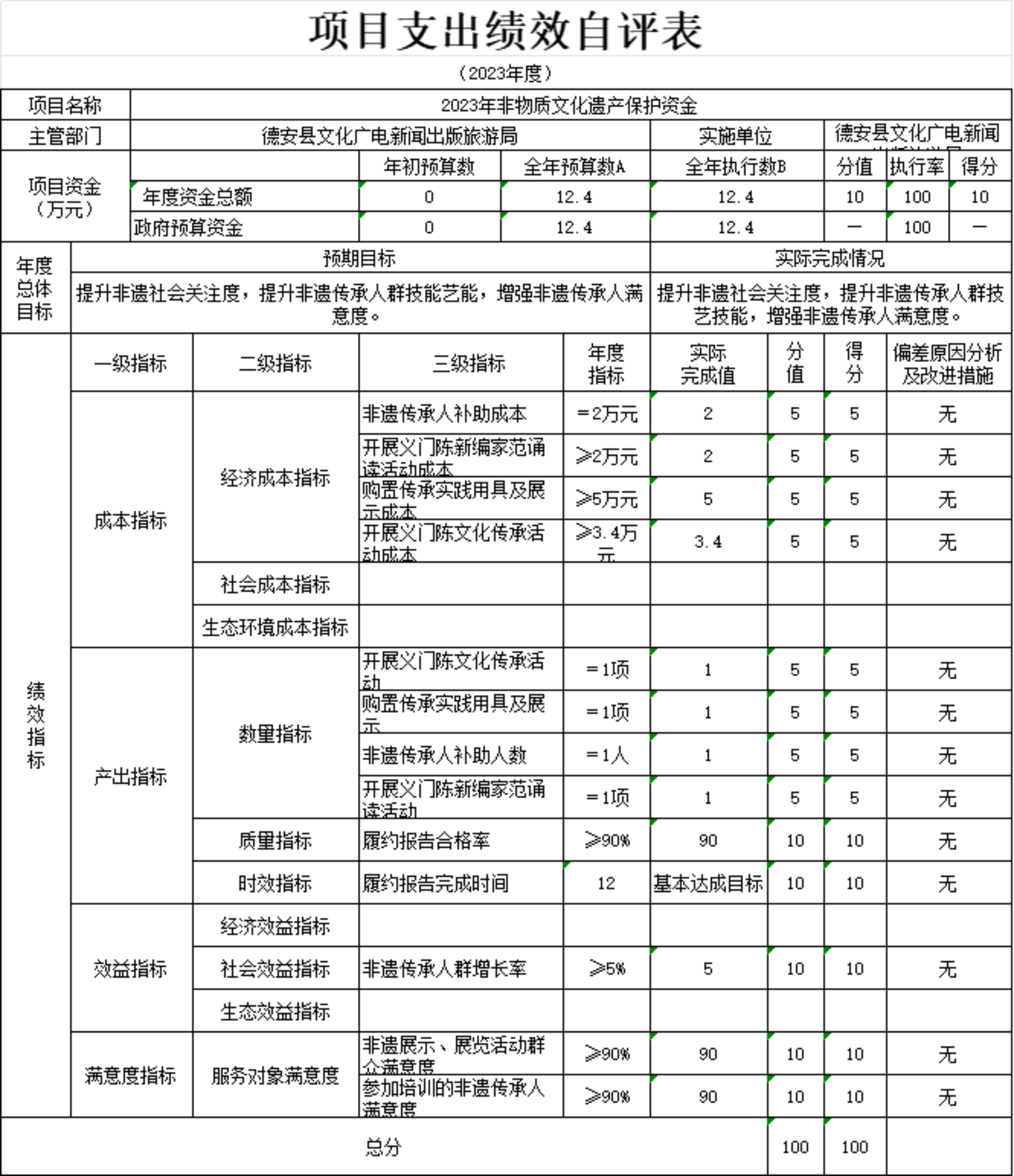 2023年非物质文化遗产保护资金管理规范,项目管理到位,对全县的行政事业单位的审计监督起到了促进作用,发挥了财政资金的作用,绩效评价分数100分,绩效评价结果为“优”。