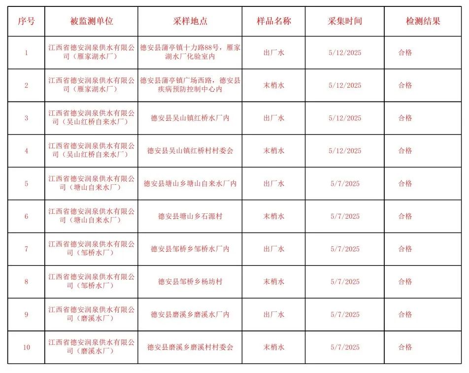 公示项目:2025年度德安县第二季度生活饮用水水质卫生监测情况。