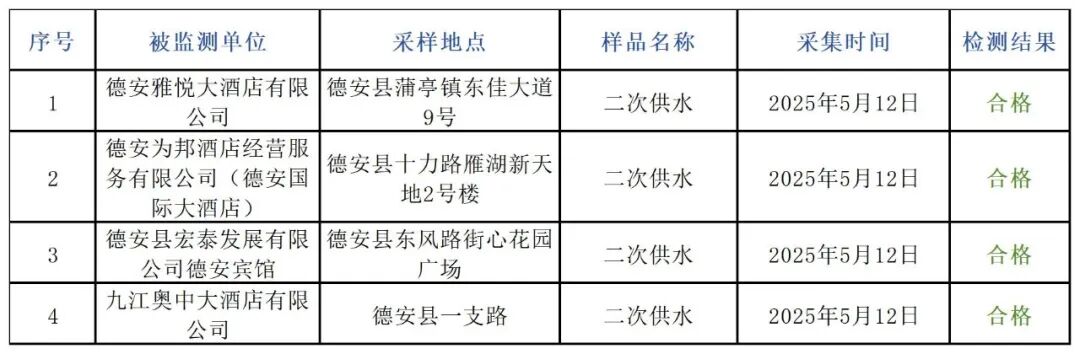 公示项目:2025年度德安县二次供水水质卫生监测情况。