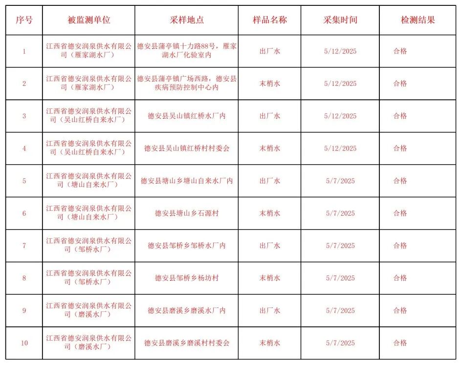 2025年度六月份德安县集中式供水单位水质检测结果公示