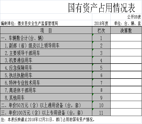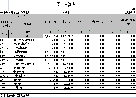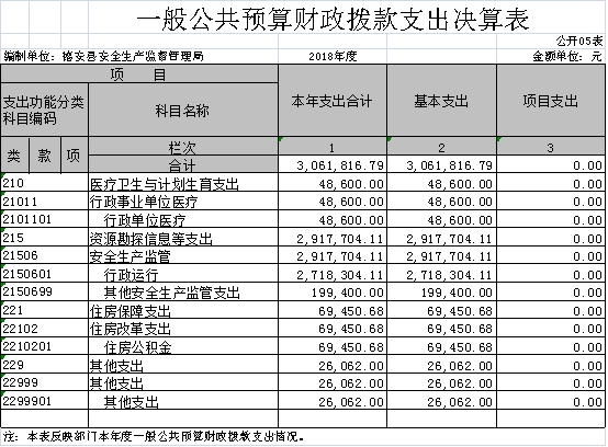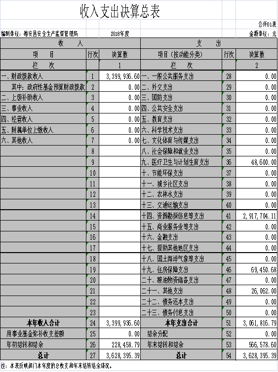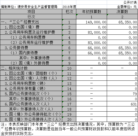 目    录   第一部分  德安县安全生产监督管理局部门概况     一、部门主要职责     二、部门基本情况 第二部分  2018年度部门决算表 一、收入支出决算总表 二、收入决算表     三、支出决算表     四、财政拨款收入支出决算总表     五、一般公共预算财政拨款支出决算表     六、一般公共预算财政拨款基本支出决算表     七、一般公共预算财政拨款“三公”经费支出决算 表     八、政府性基金预算财政拨款收入支出决算表     九、国有资产占用情况表     第三部分  2018年度部门决算情况说明 一、收入决算情况说明 二、支出决算情况说明 三、财政拨款支出决算情况说明 四、一般公共预算财政拨款基本支出决算情况说明 五、一般公共预算财政拨款“三公”经费支出决算     情况说明 六、机关运行经费支出情况说明     七、政府采购支出情况说明     八、国有资产占用情况说明     九、预算绩效情况说明 第四部分  名词解释 第一部分  德安县安全生产监督管理局部门概况 一、部门主要职能 (一)承担县安全生产委员会办公室的日常工作,依法行使县政府安全生产综合监督管理职权,指导、协调和监督有关部门安全生产监督管理工作; (二)定期分析和预测全县安全生产形势,研究、协调和解决安全生产中的重大问题,组织、指导全县安全生产宣传教育工作,负责发布全县安全生产信息、综合管理全县生产安全伤亡事故调度统计和安全生产行政执法分析工作,按规定上报伤亡事故情况; (三)依法组织、协调生产安全事故的调查处理工作,并监督事故查处的落实情况;组织、指挥和协调安全生产应急救援工作。 二、部门基本情况 纳入本套部门决算汇编范围的单位共三个,包括:德安县安全生产监督管理局本级、德安县安全生产监察大队、德安县工业园安全生产监督管理分局。 本部门2018年年末编制人数18人,其中行政编制8人,事业编制10人;年末实有人数18人,其中在职人员18人,离休人员0人,退休人员1人;年末学生人数0人。 第二部分  2018年度部门决算表   第三部分  2018年度部门决算情况说明 一、收入决算情况说明 本部门2018年度收入总计362.84万元,其中年初结转和结余22.85万元,较2017年增加83.41万元,增长29.8%;本年收入合计339.99万元,较2017年增加60.56万元,增长21.67%,主要原因是:安全生产监察费用拨款有所增加。 本年收入的具体构成为:财政拨款收入339.99万元,占100%;事业收入0万元,占0%;经营收入0万元,占0 %;其他收入0万元,占0%。   二、支出决算情况说明 本部门2018年度支出总计306.18万元,其中本年支出合计   306.18万元,较2017年增加49.59万元,增长19.33%,主要原因是:1、安全生产监管任务的不断增加,日常工作经费增长较快;2、随着工资增长,人员经费也有所增加。年末结转和结余   56.66万元,较2017年增加33.81万元,增长147.96 %,主要原因是:本年度安全生产监察费用拨款有所增加。 本年支出的具体构成为:基本支出306.18万元,占100 %;项目支出0万元,占0 %;经营支出0万元,占0%;其他支出(对附属单位补助支出、上缴上级支出)0万元,占0 %。 三、财政拨款支出决算情况说明 本部门2018年度财政拨款本年支出年初预算数为210万元,决算数为339.99万元,完成年初预算的161.9%。其中: (一)医疗卫生与计划生育支出支出年初预算数为0万元,决算数为4.86万元,完成年初预算的  %,主要原因是:年初医疗保险单位缴费部分未纳入预算。 (二)资源勘探信息支出年初预算数为 232.85万元,决算数为291.77万元,完成年初预算的125.3 %,主要原因是:安全生产监察任务加重,安全生产监察费用增加。 (三)住房保障支出年初预算数为 0万元,决算数为6.95万元,完成年初预算的 %,主要原因是:年初住房公积金单位缴纳部分未纳入预算。 (四)其他支出年初预算数为 0万元,决算数为2.62万元,完成年初预算的 %,主要原因是:年初目标管理考核奖金未纳入预算。 四、一般公共预算财政拨款基本支出决算情况说明 本部门2018年度一般公共预算财政拨款基本支出306.18  万元,其中: (一)工资福利支出232.84万元,较2017年增加29.71万元,增长14.63%,主要原因是:人员工资有所增加。 (二)商品和服务支出73.34万元,较2017年增加19.88万元,增长37.19 %,主要原因是:本年度产生了无主尾矿库三同时费用13.52万元与治超专线费用6.42万元。 五、一般公共预算财政拨款“三公”经费支出决算情况说明 本部门2018年度一般公共预算财政拨款“三公”经费支出年初预算数为14.9万元,决算数为6.54万元,完成预算的43.89 %,决算数较2017年减少2.67万元,下降28.99%,其中: (一)因公出国(境)支出年初预算数为0 万元,决算数为0万元。 (二)公务接待费支出年初预算数为6.6万元,决算数为  6.54万元,完成预算的99 %,决算数较2017年增加0.1万元,增长1.64%。决算数较年初预算数增加的主要原因是:招待费用略微有所增加。 (三)公务用车购置及运行维护费支出0万元,其中公务用车购置年初预算数为0万元,决算数为0万元;公务用车运行维护费支出年初预算数为8.3万元,决算数为0万元,完成预算的0 %,决算数较2017年减少2.77万元,下降100%。决算数较年初预算数减少的主要原因是:公车改革单位不再保留公车。 六、机关运行经费支出情况说明 本部门2018年度机关运行经费支出73.34万元,较年初预算数增加4.05万元,增长5.84 %,主要原因是:监