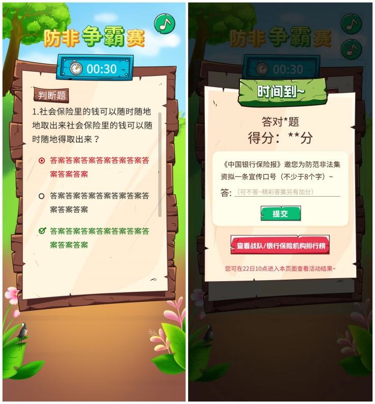 6月21日争霸赛最后附主观题“请您为防范非法集资拟一条宣传口号(不少于8个字)”,非必答题,作答即可赢得10分,精彩答案另有加分。