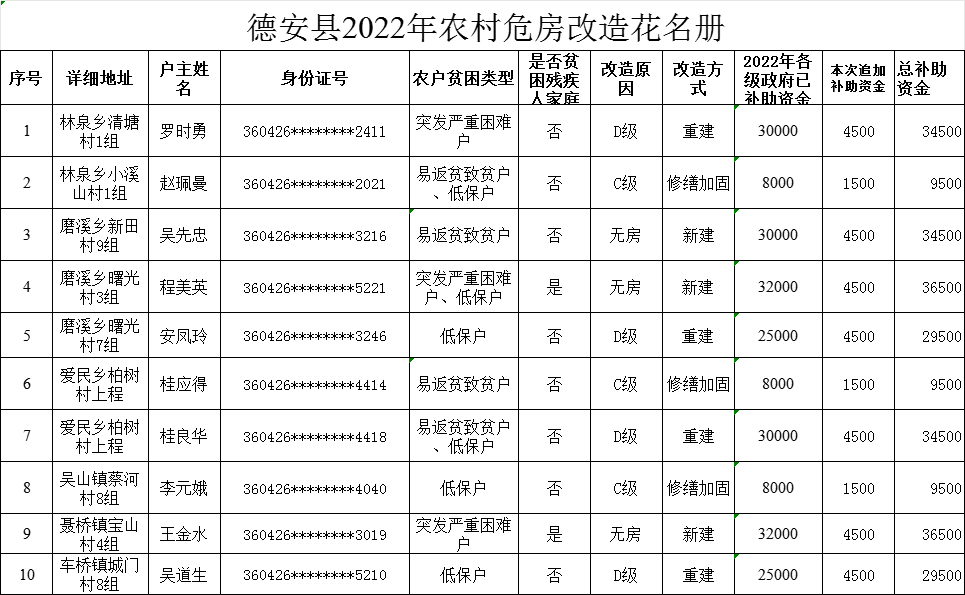德安县2022年农村危房改造花名册